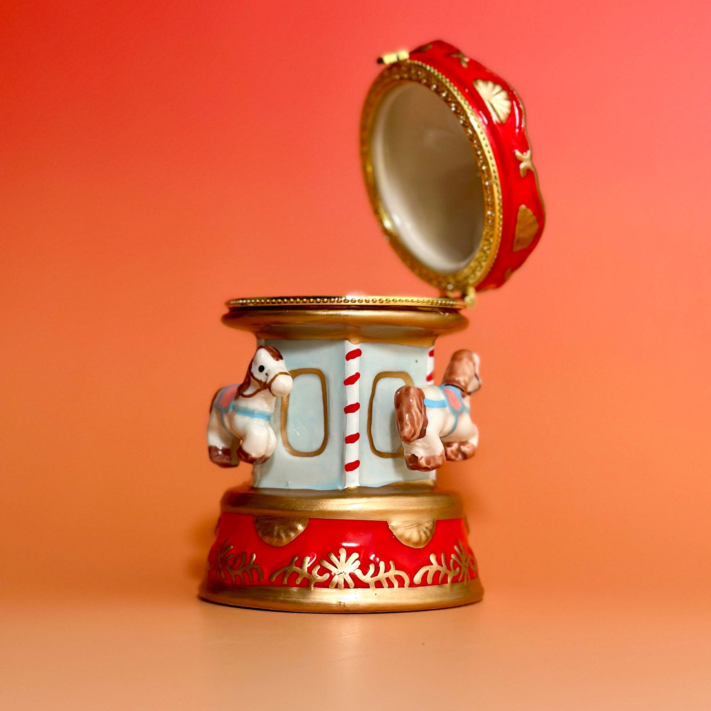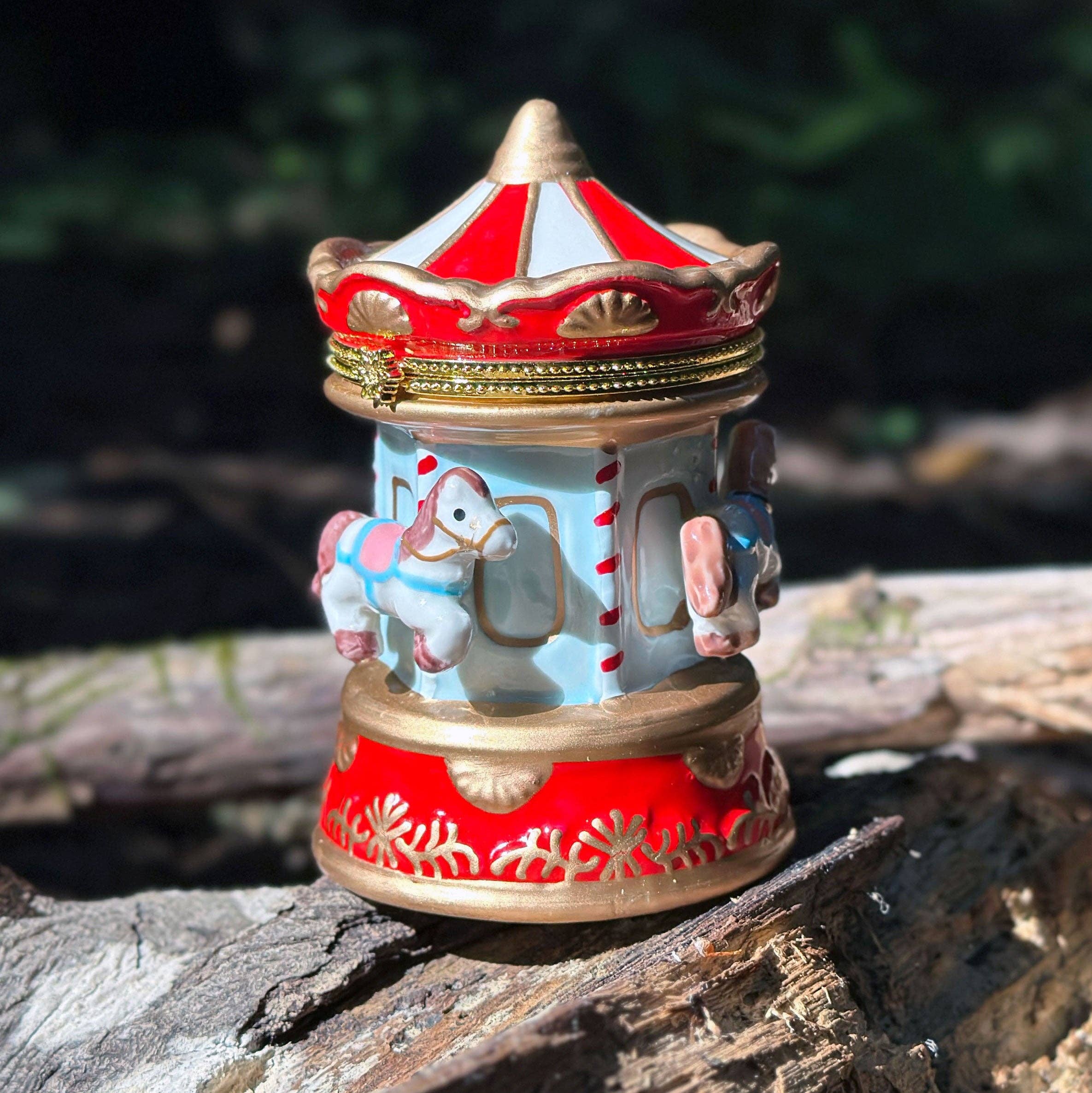 Step right up to a tiny carnival of magic. This hand-painted carousel spins with charm, complete with little horses and festive red-and-gold details. Open the hinged box to hide away your rings, notes, or keepsakes — safe inside this miniature fairground treasure. Whimsical, collectible, and full of nostalgia, it’s a carousel you’ll never outgrow.