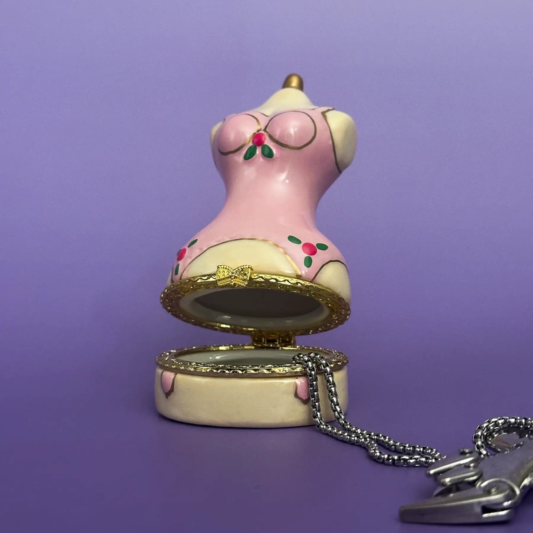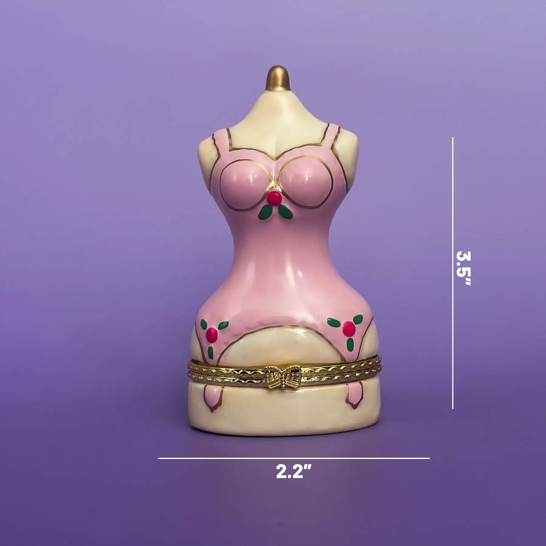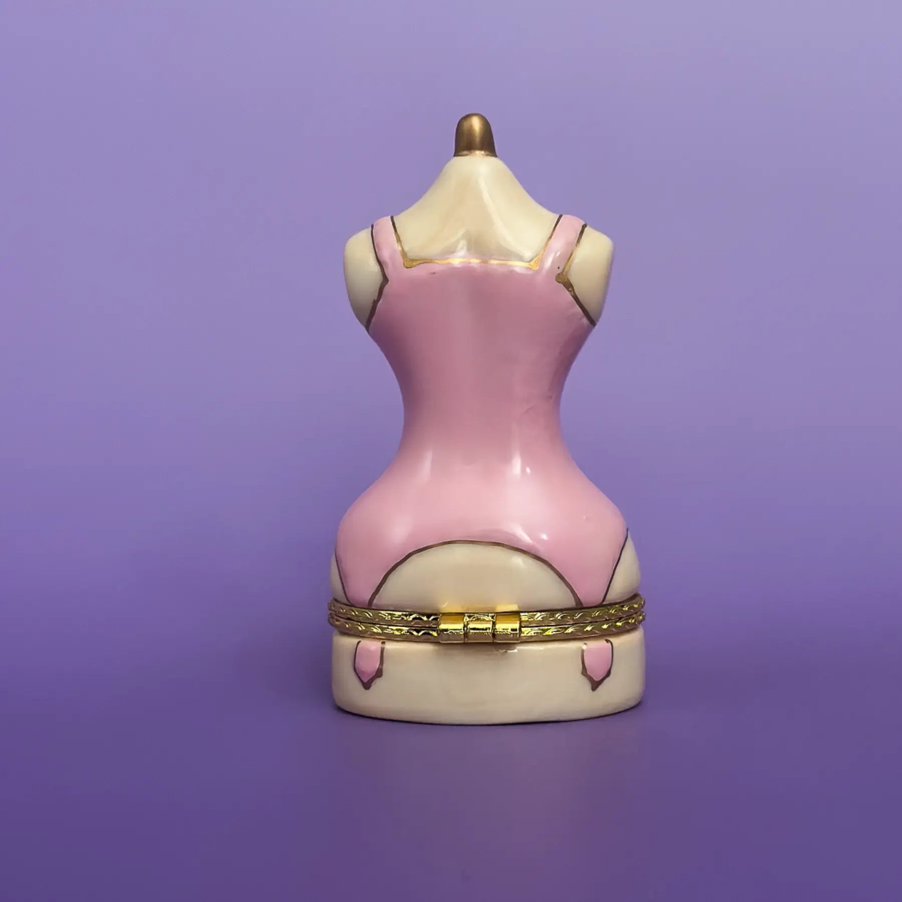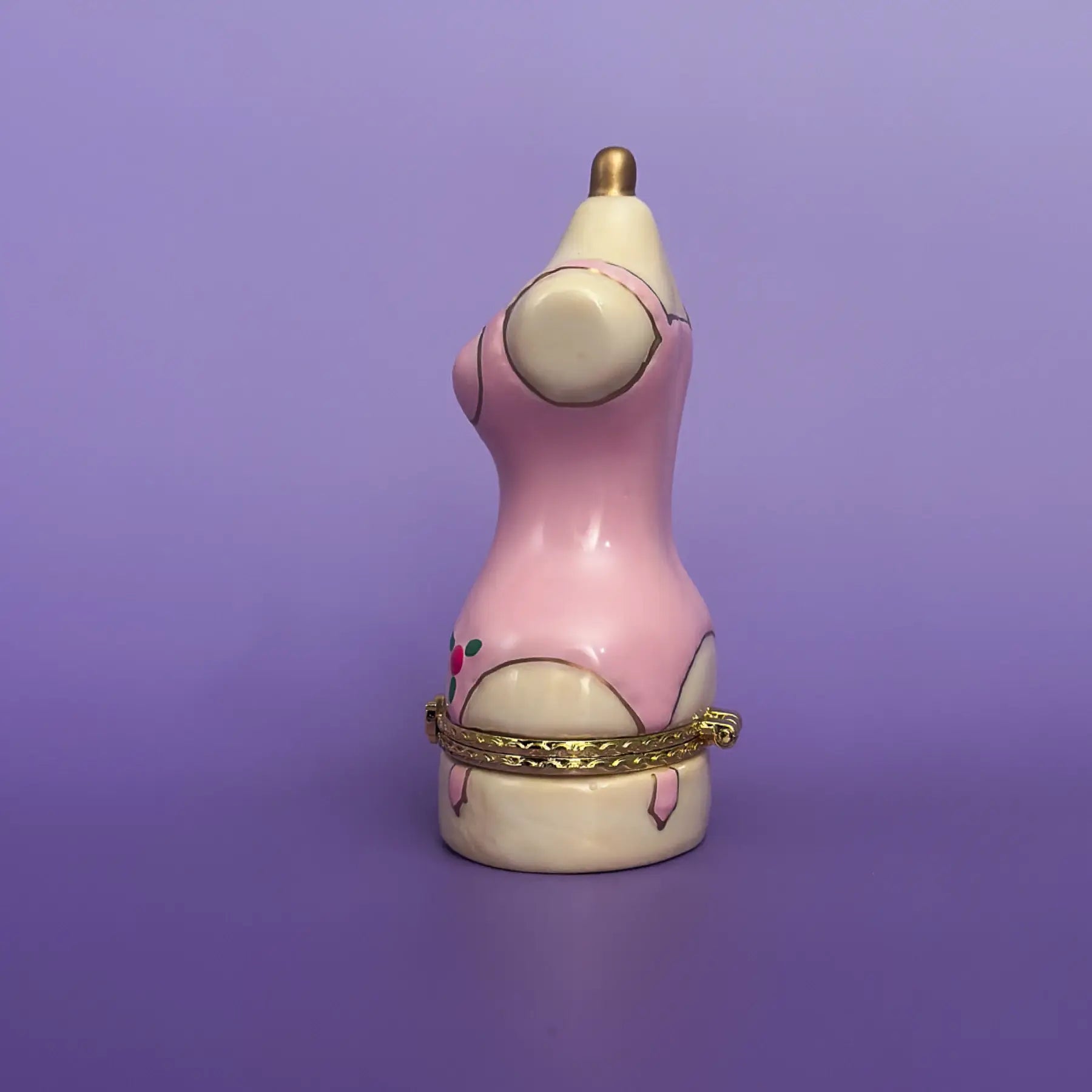 Inspired by the tiny mannequins in vintage shop windows on Haight Street in San Francisco, this hand painted ceramic trinket box is shaped like a pink dress form in a fitted corset dress, finished with cherry inspired details and a small golden bow at the waist. It feels like a little dressmaker’s mannequin from an old fitting room, turned into a sculpture for your shelf. Lift the top of the dress to reveal a hidden compartment for rings, earrings, or a favorite necklace.