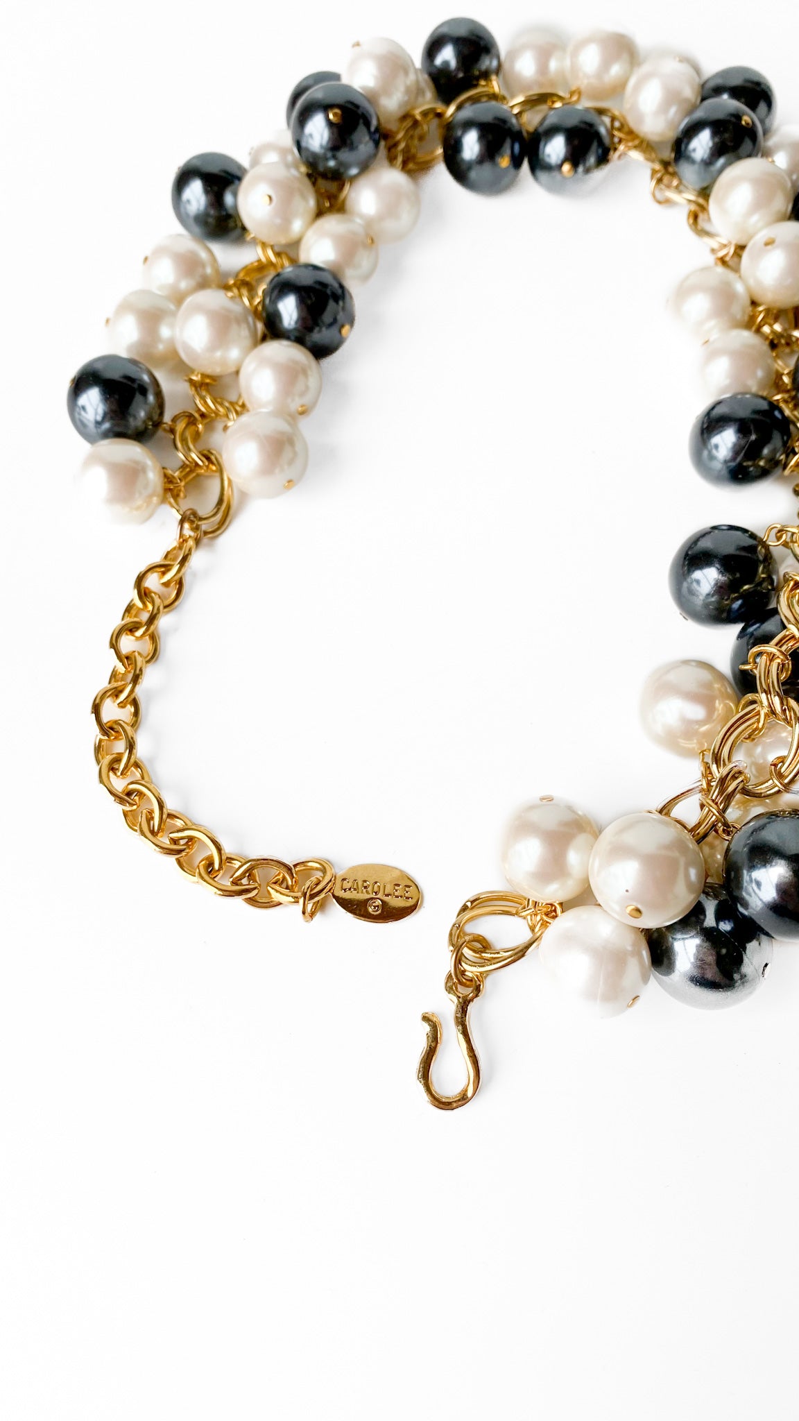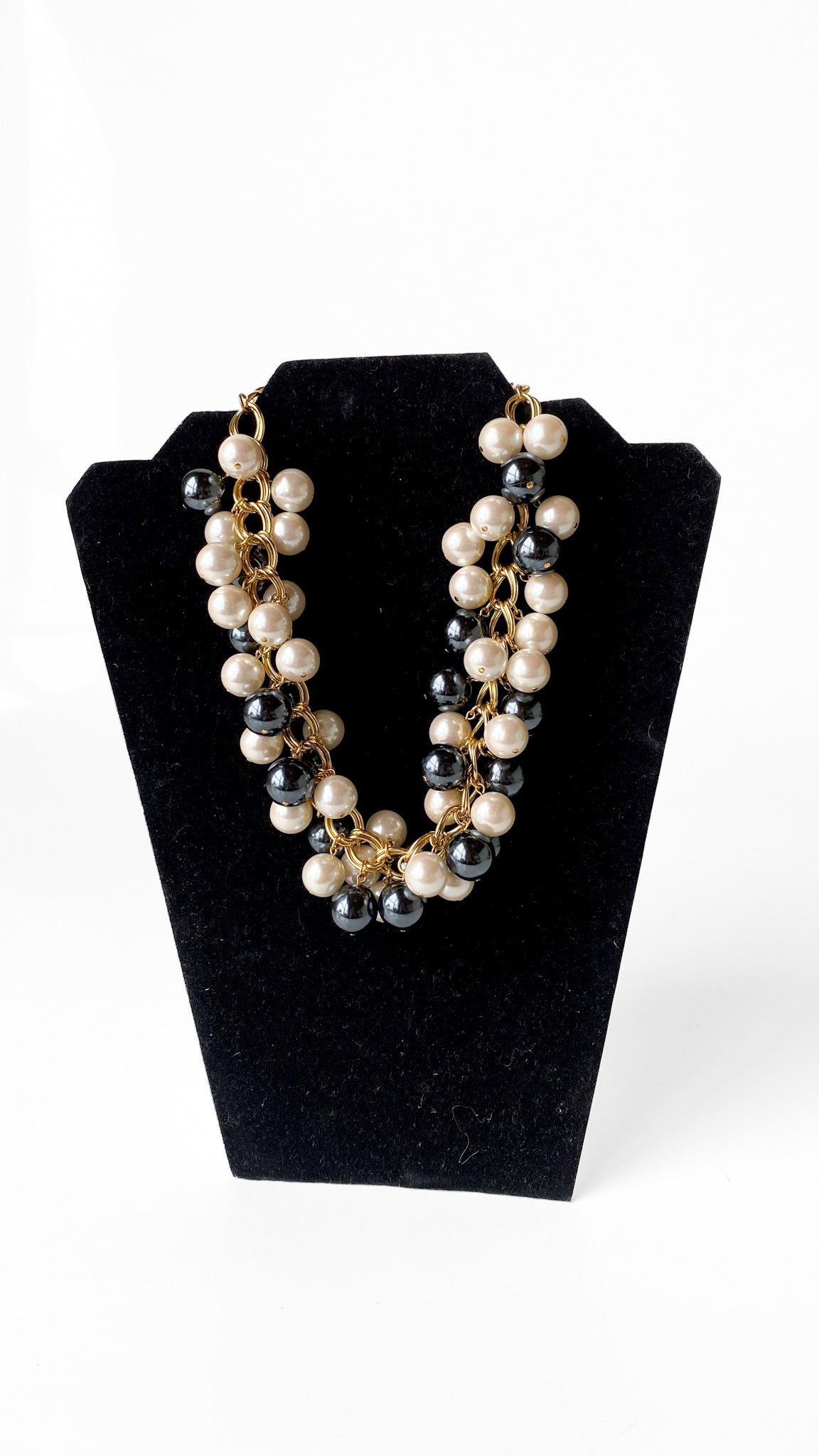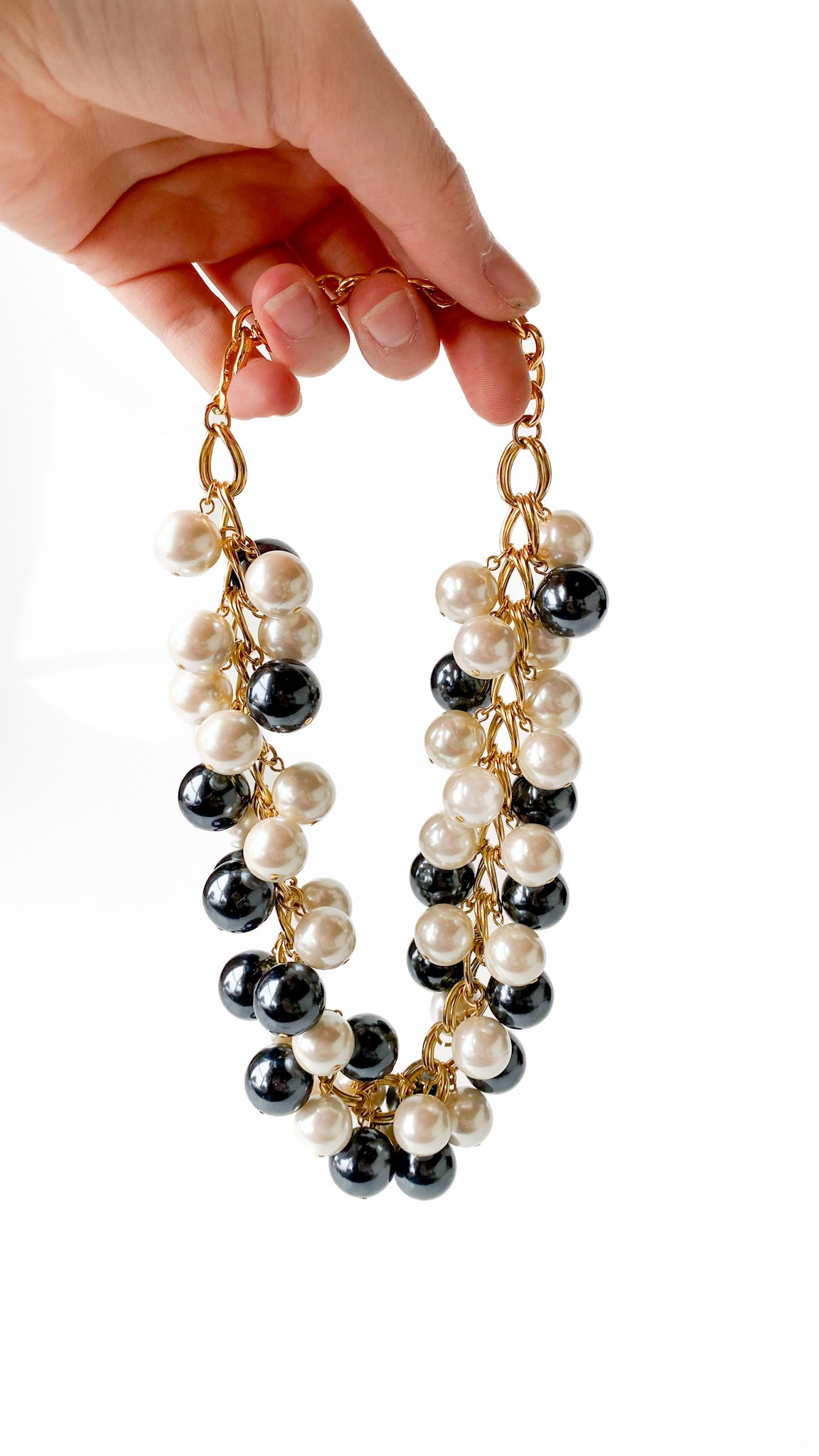 Description: Chunky gold chain necklace with ivory & black iridescent pearl baubles. Has hook clasp with adjustable chain length.