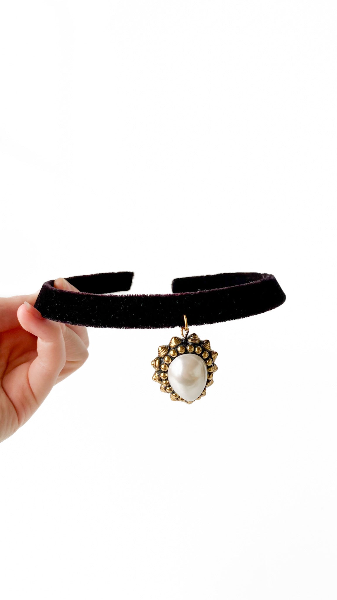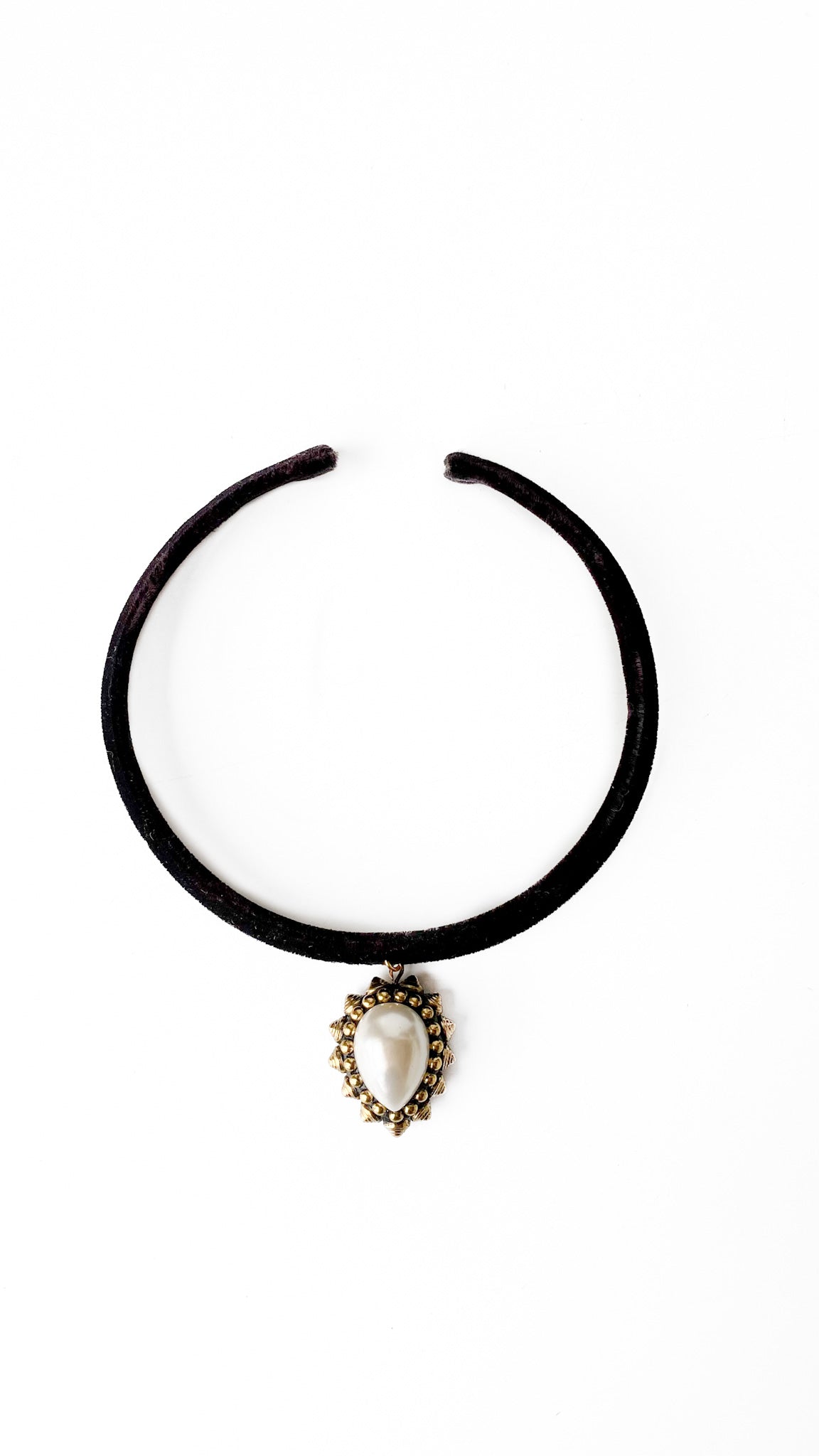 Description: Black velvet choker with studded pearl pendant in center. Has no closure.