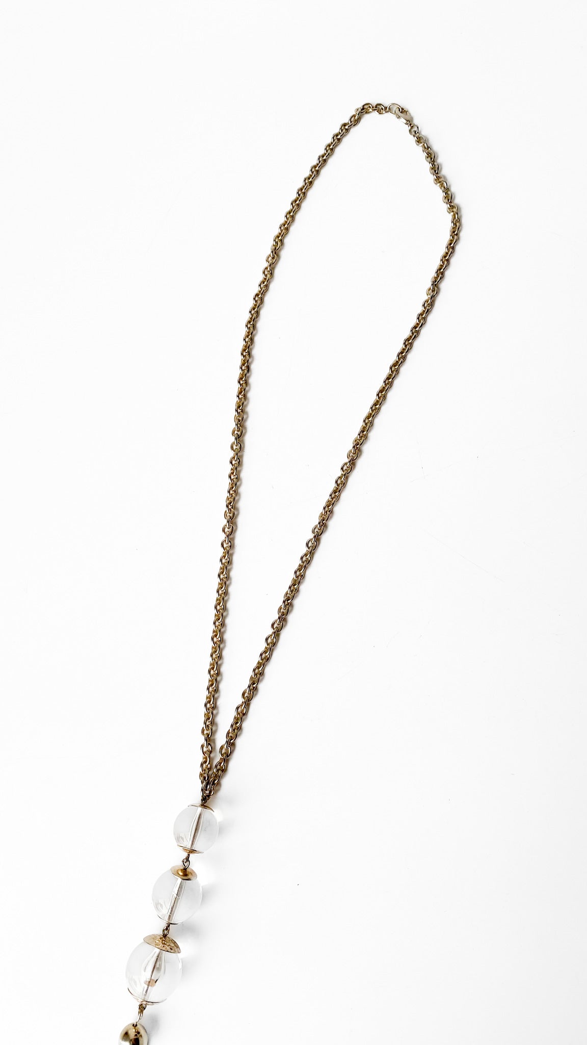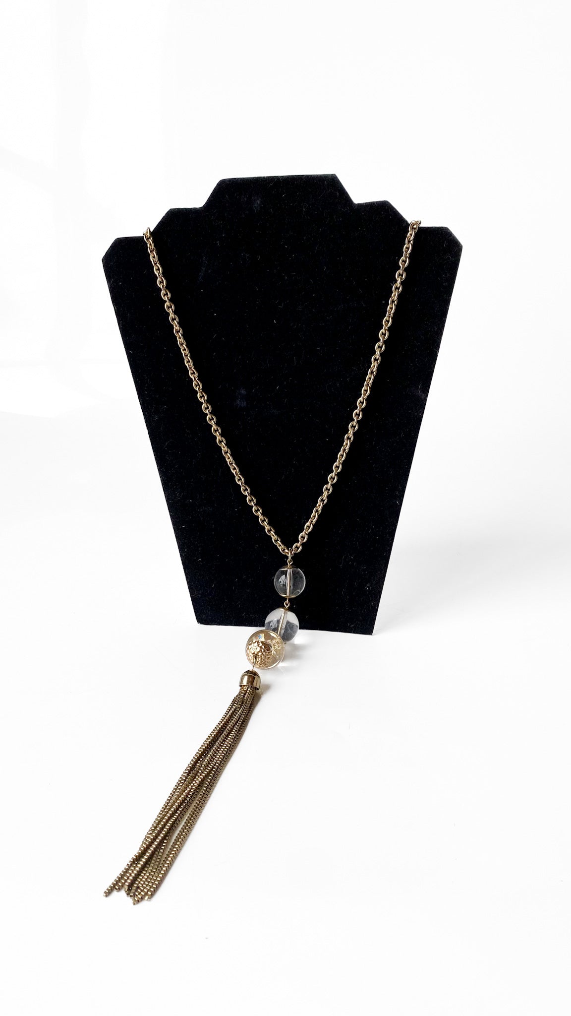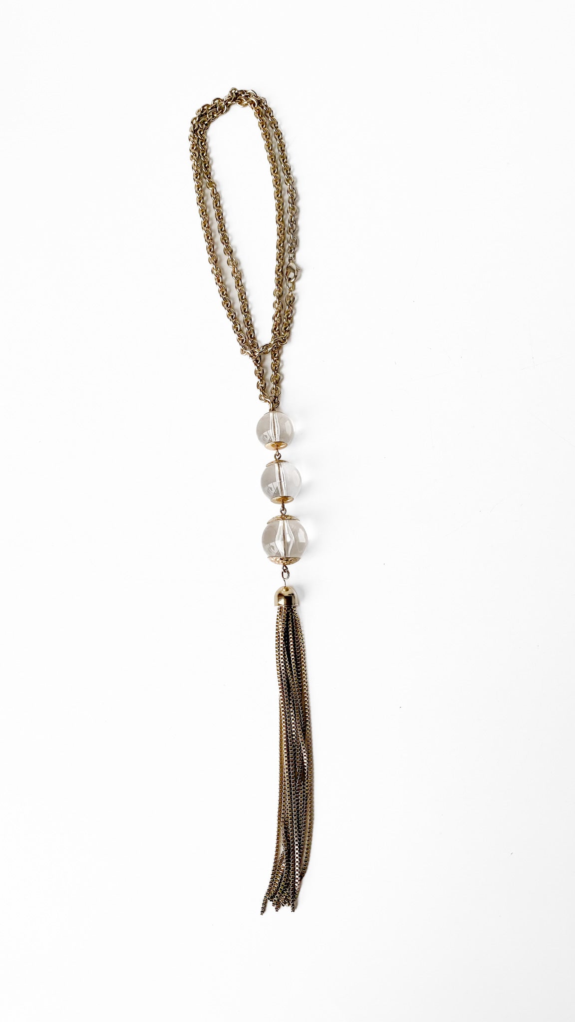 Description: Long brass necklace with clear bead tassel pendant. Has lobster claw clasp closure & chunky brass chain.