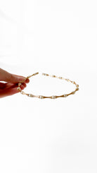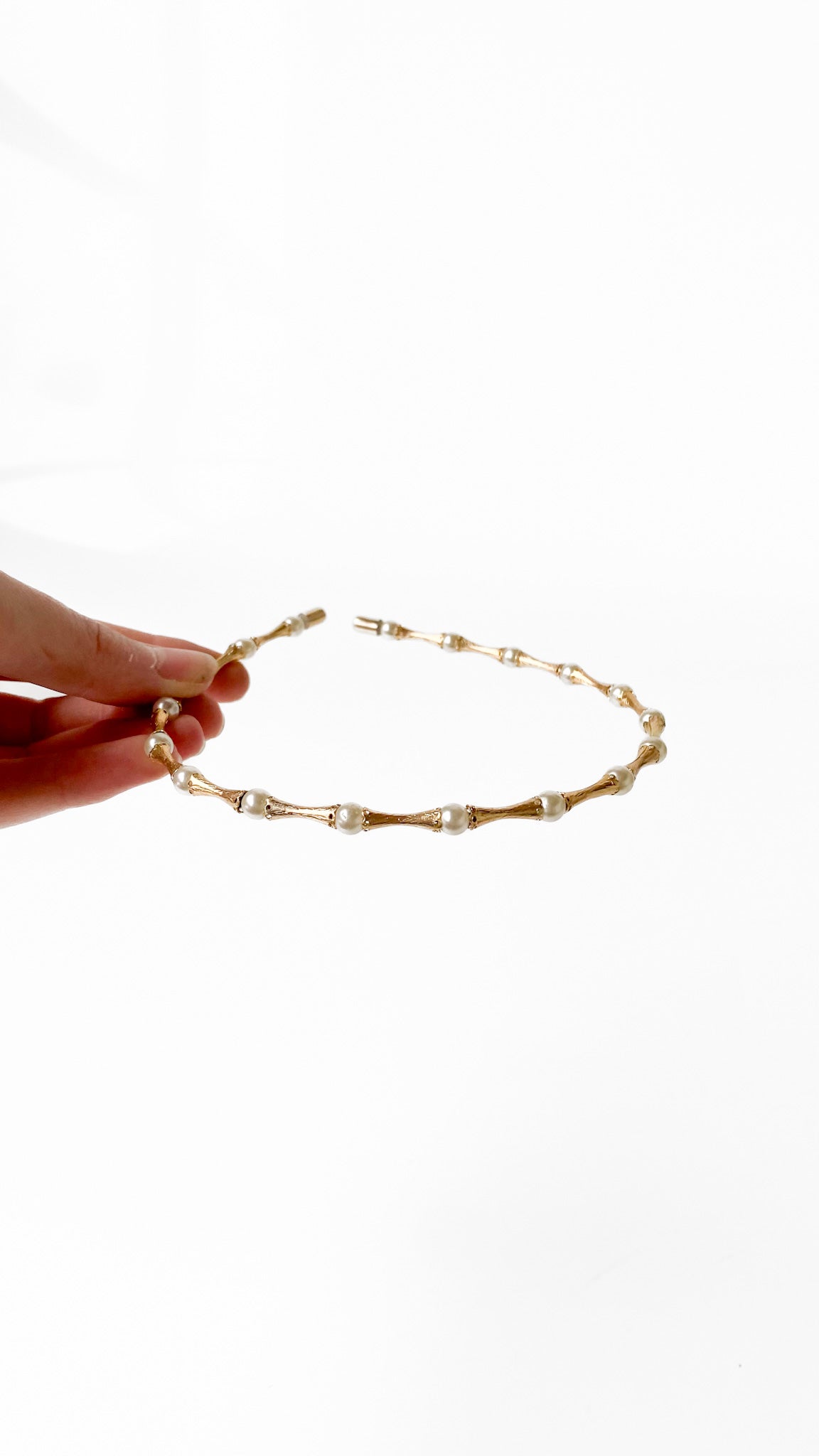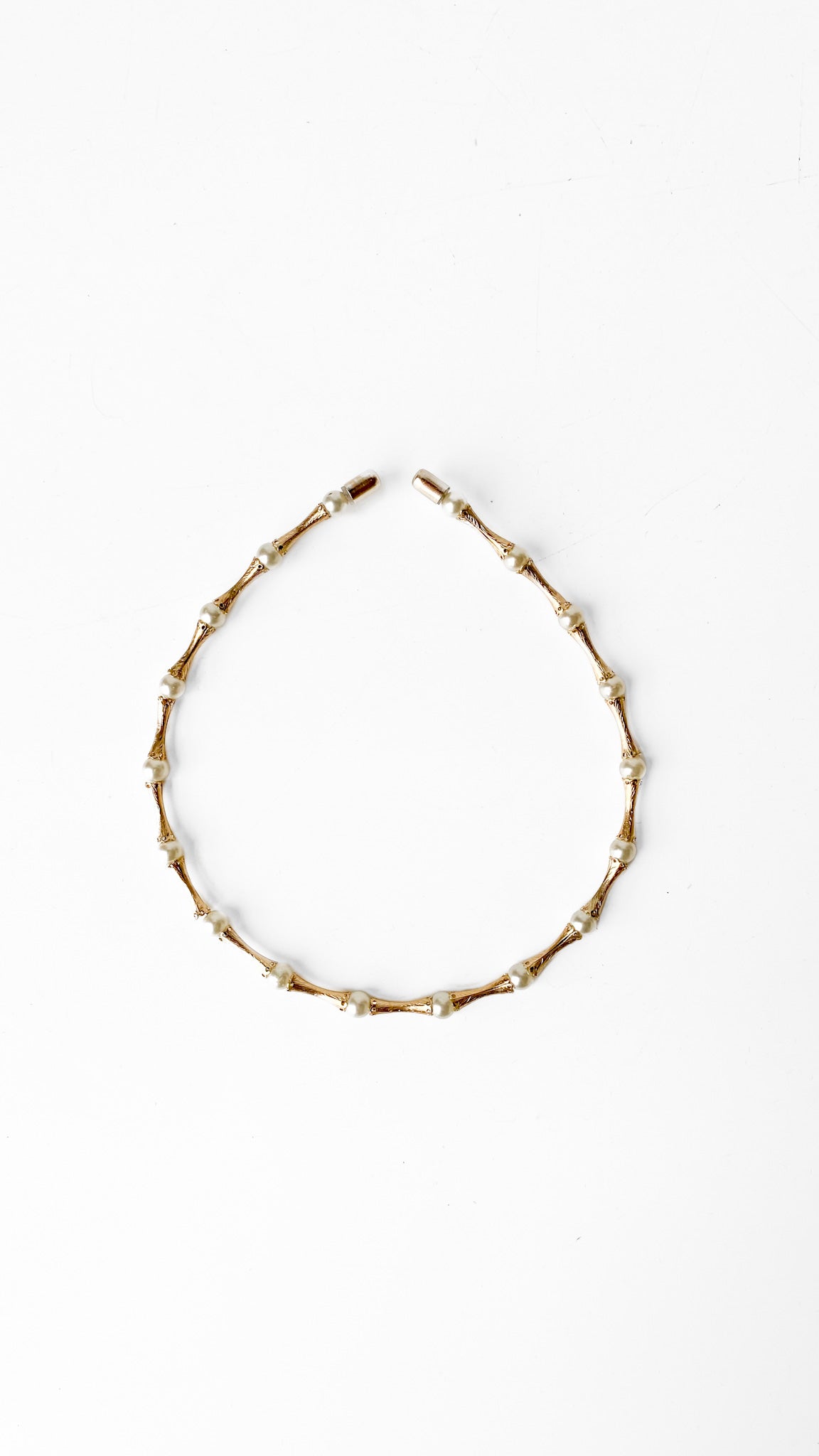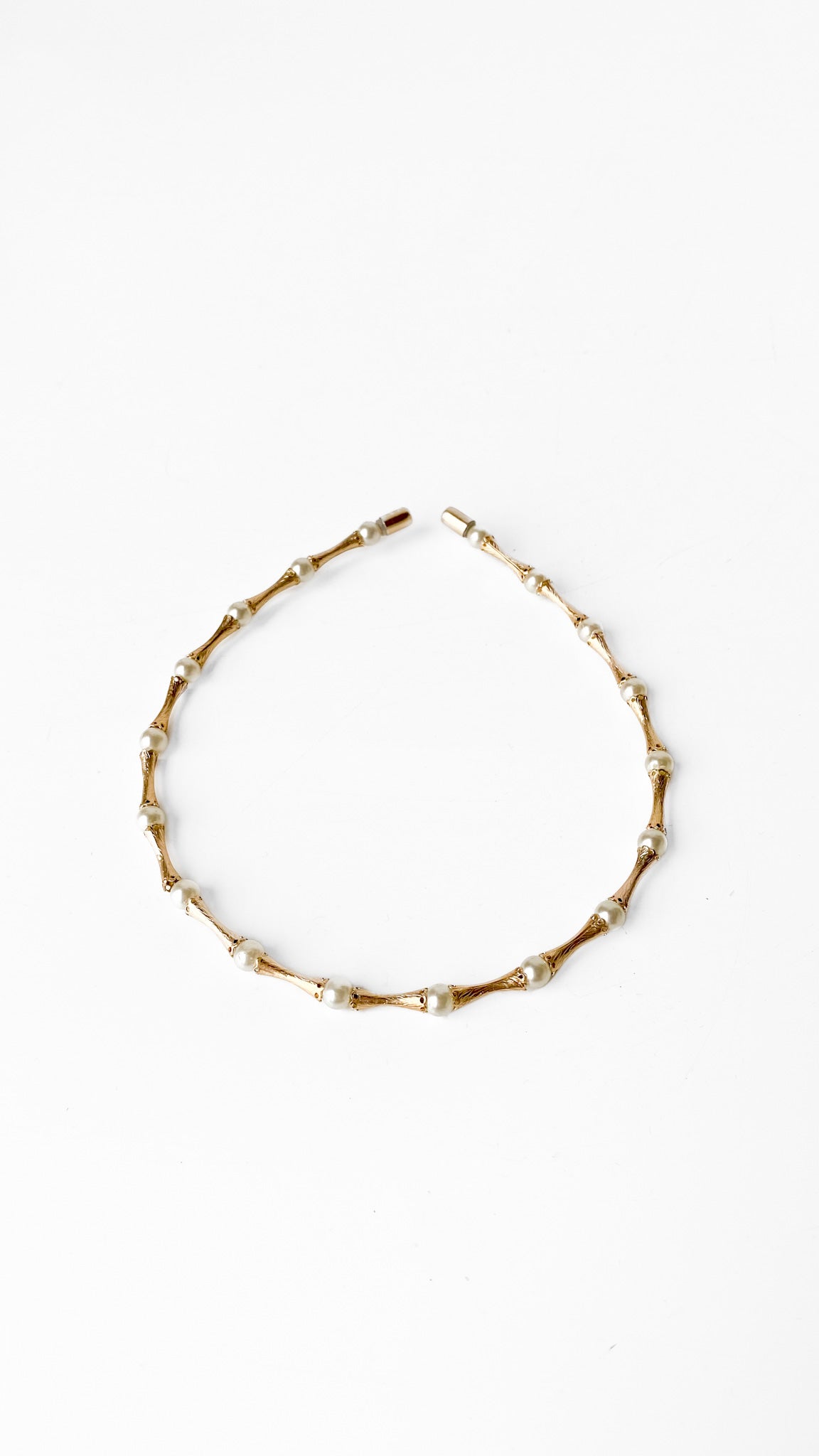 Description: Gold bamboo-style choker necklace with faux pearl beads. Has no closure.
