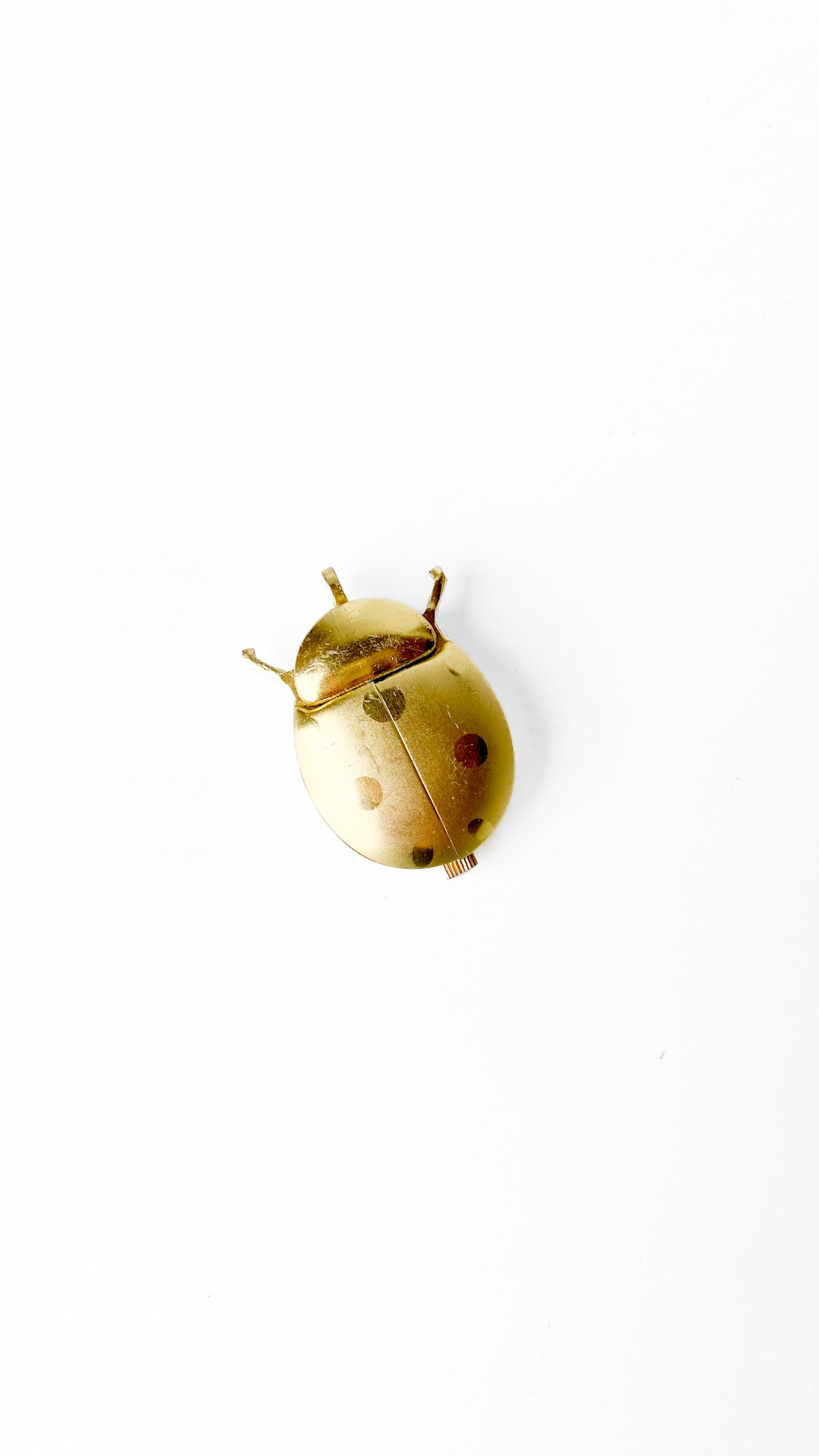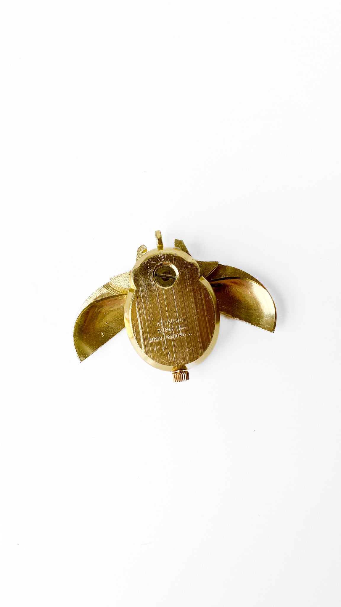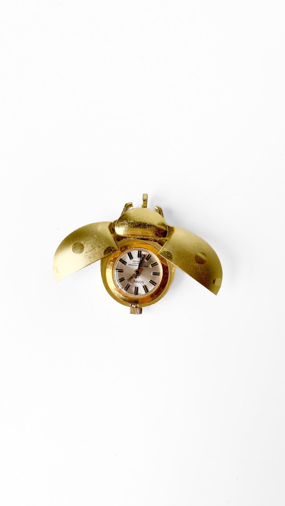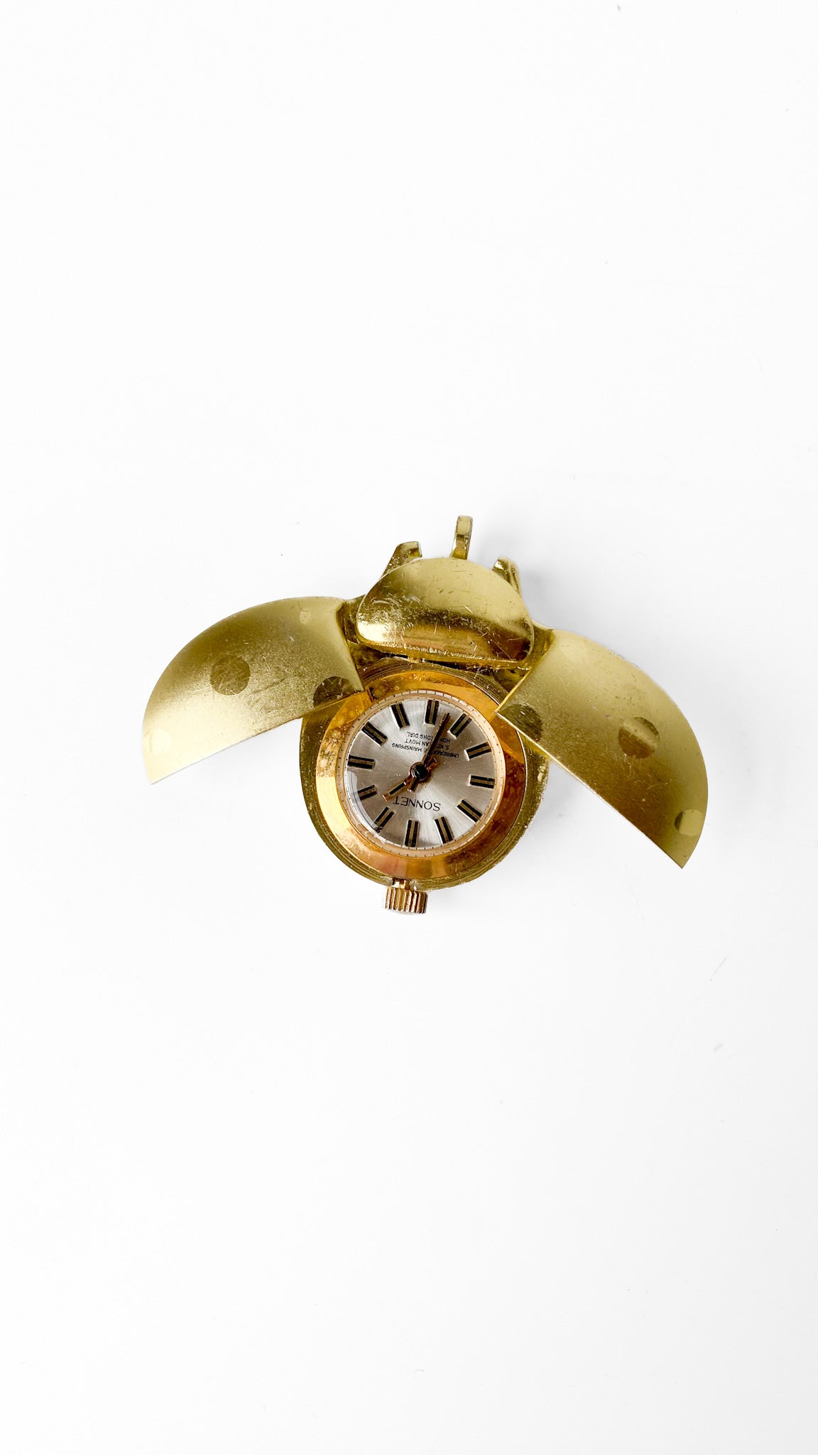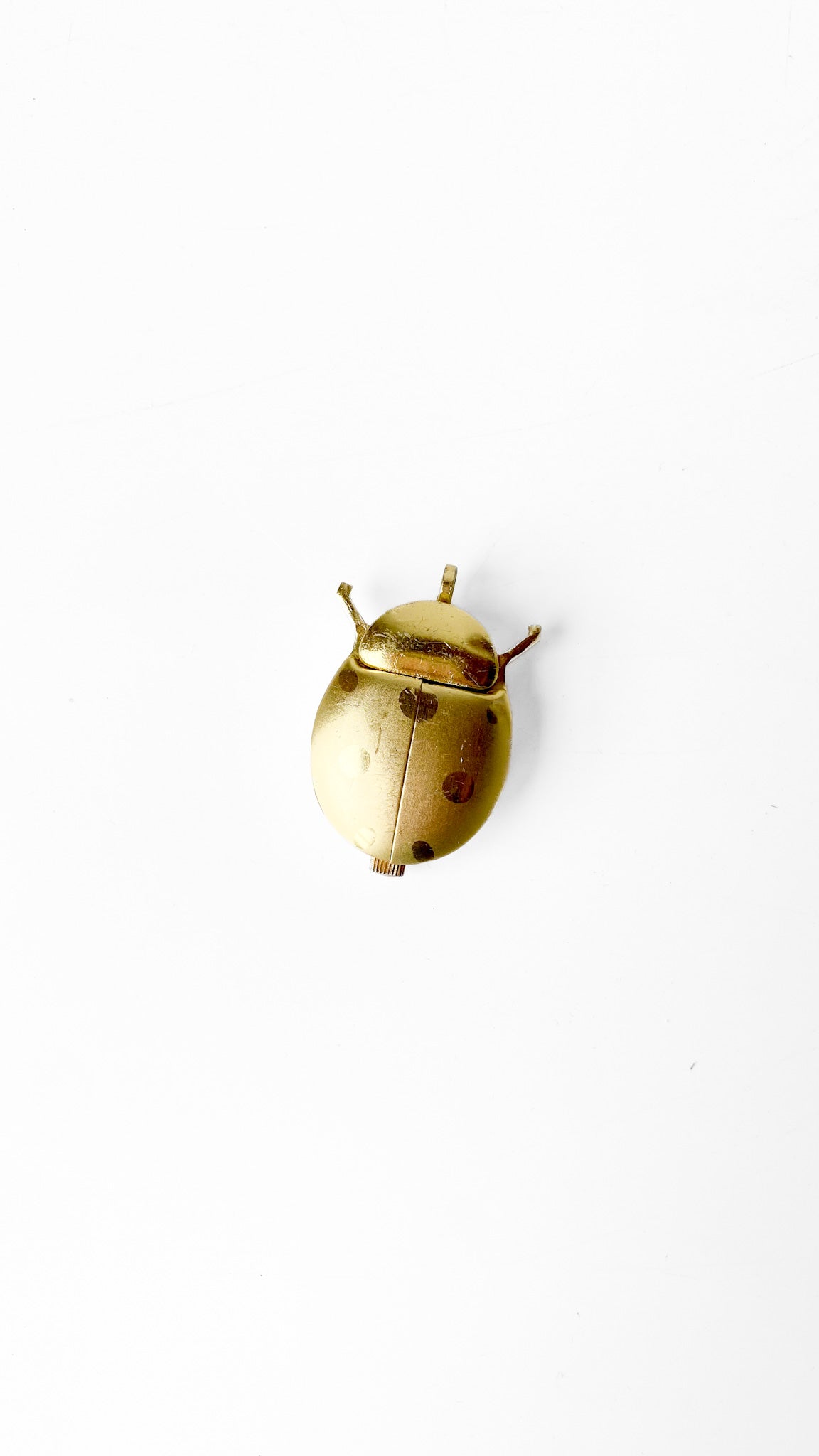 Description: Gold ladybug pendant with clock hidden beneath wings. Has hinge to reveal clock face, and loop to put on a necklace. Not tested. Clock needs new battery.