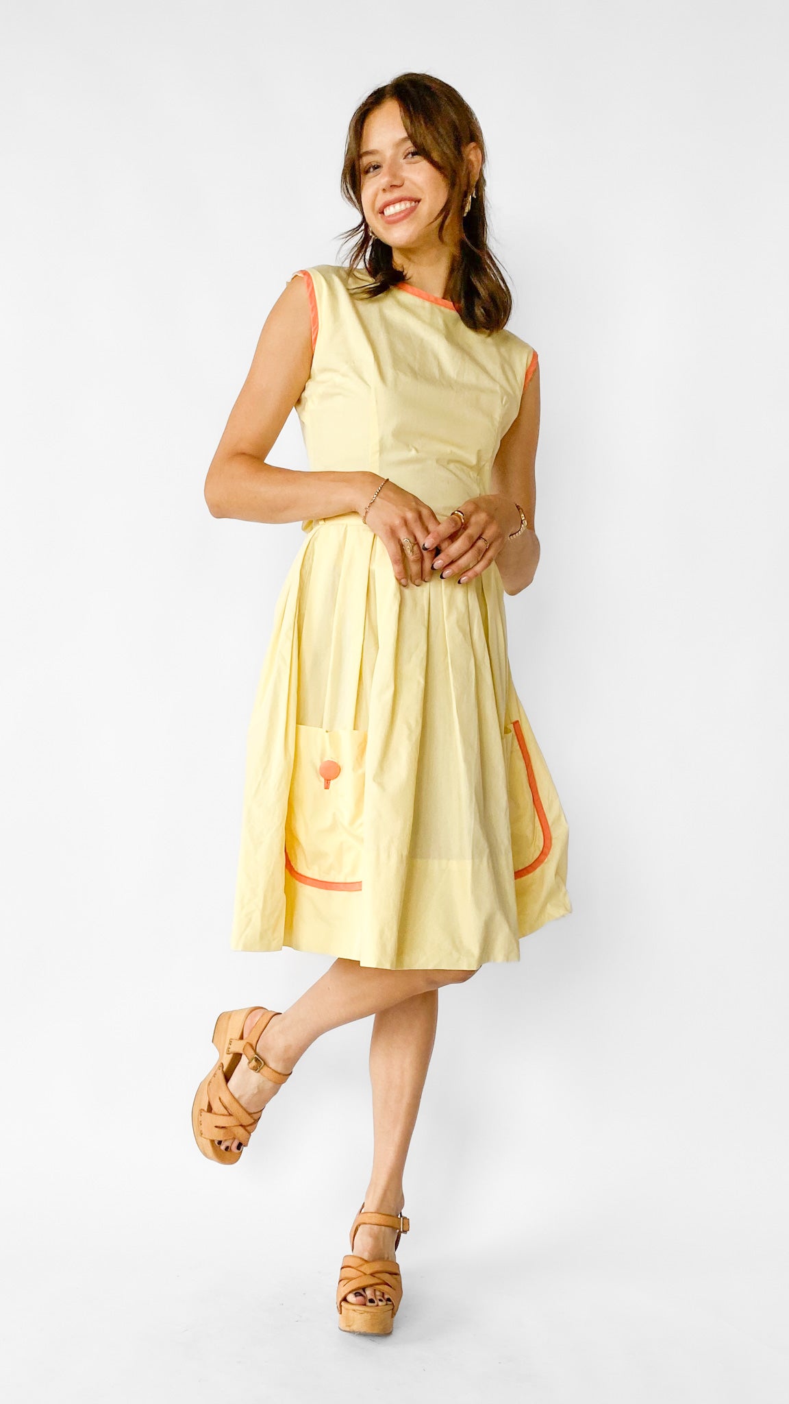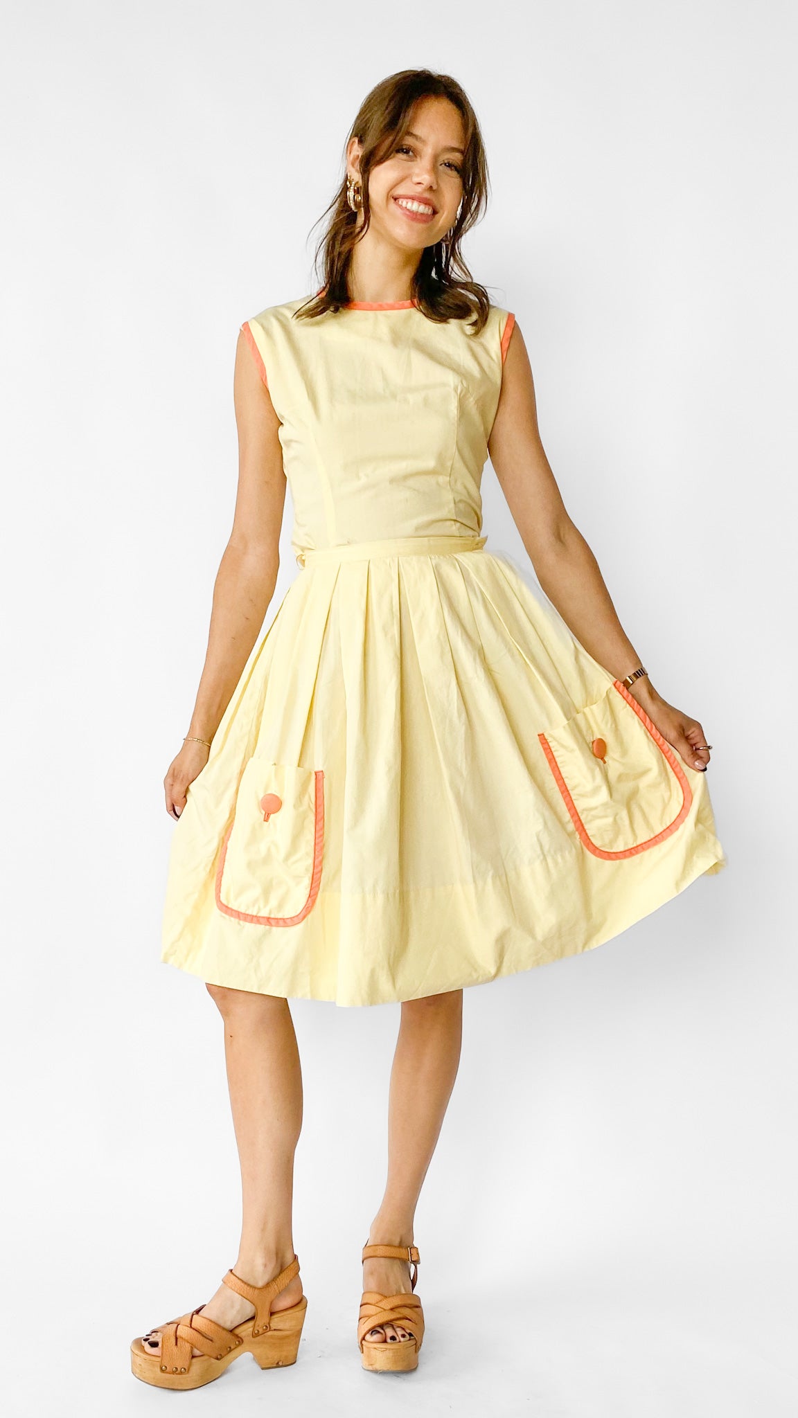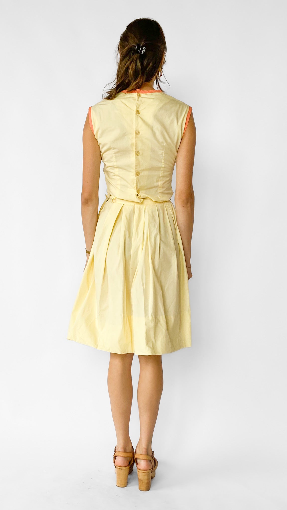 Description: Light yellow top & skirt set. Top has orange trim around neckline & sleeves, and button closure down center back. Skirt is pleated with side zipper closure, and has orange-trimmed pockets.