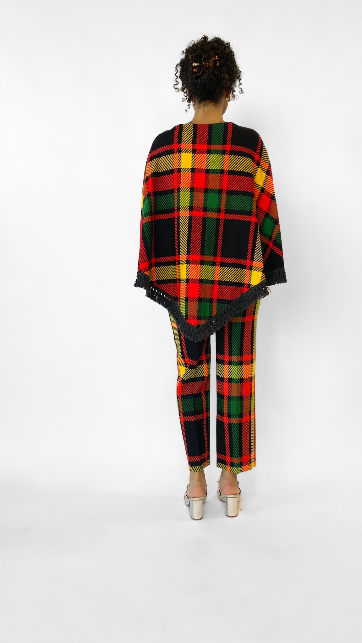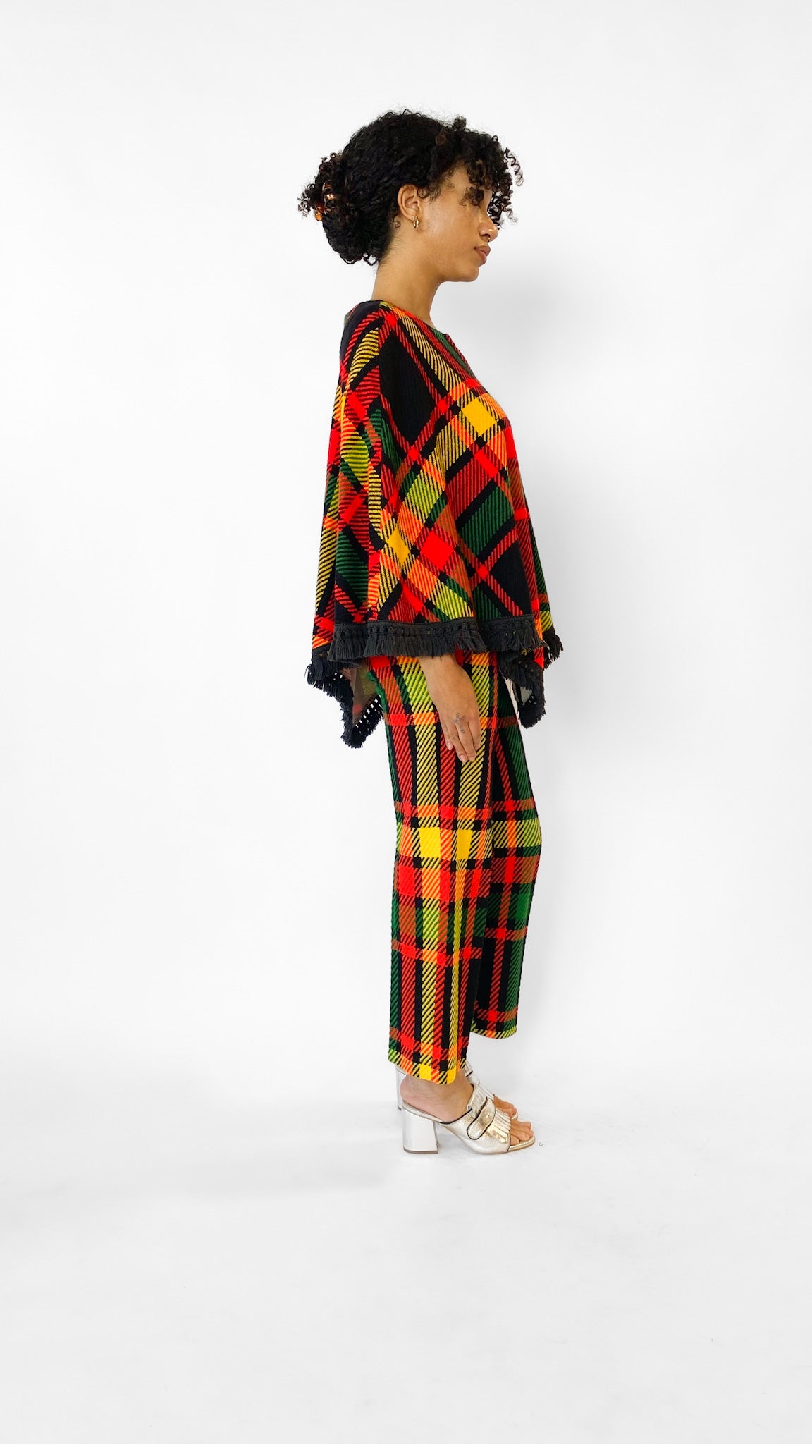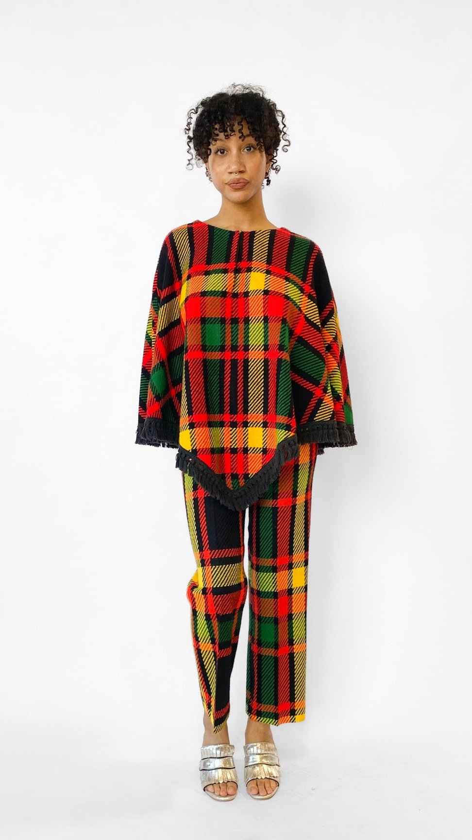 1960s Rare Bright Plaid Poncho & Pants Set, sz. S