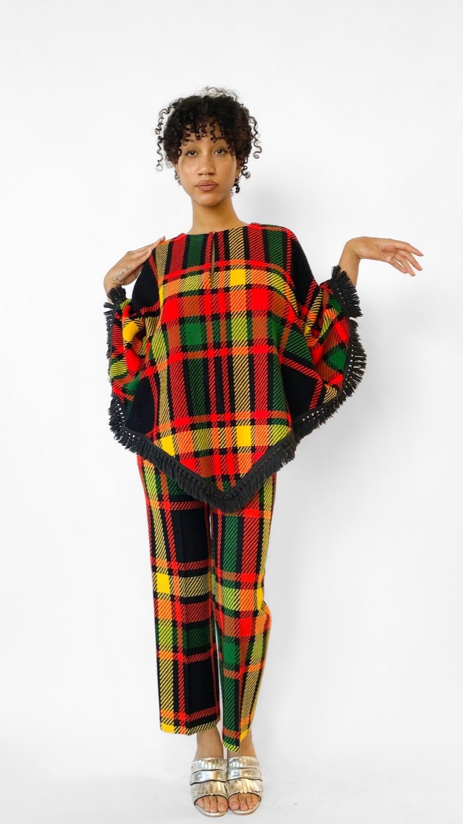 Red, yellow, green, and black plaid poncho and pants set. Poncho has hook and eye closure in the back and fringe along the hem. Pants have zipper down center back.