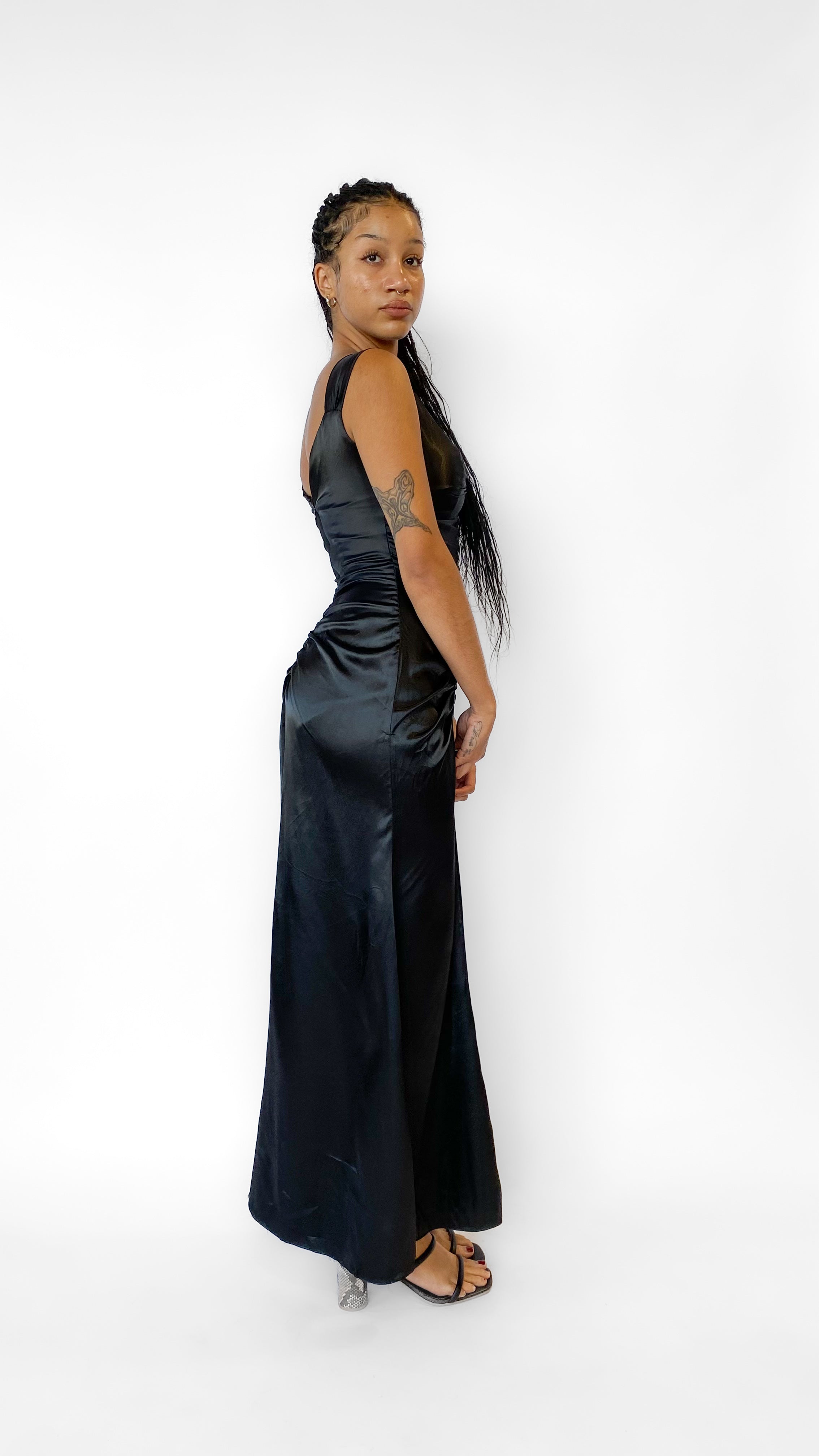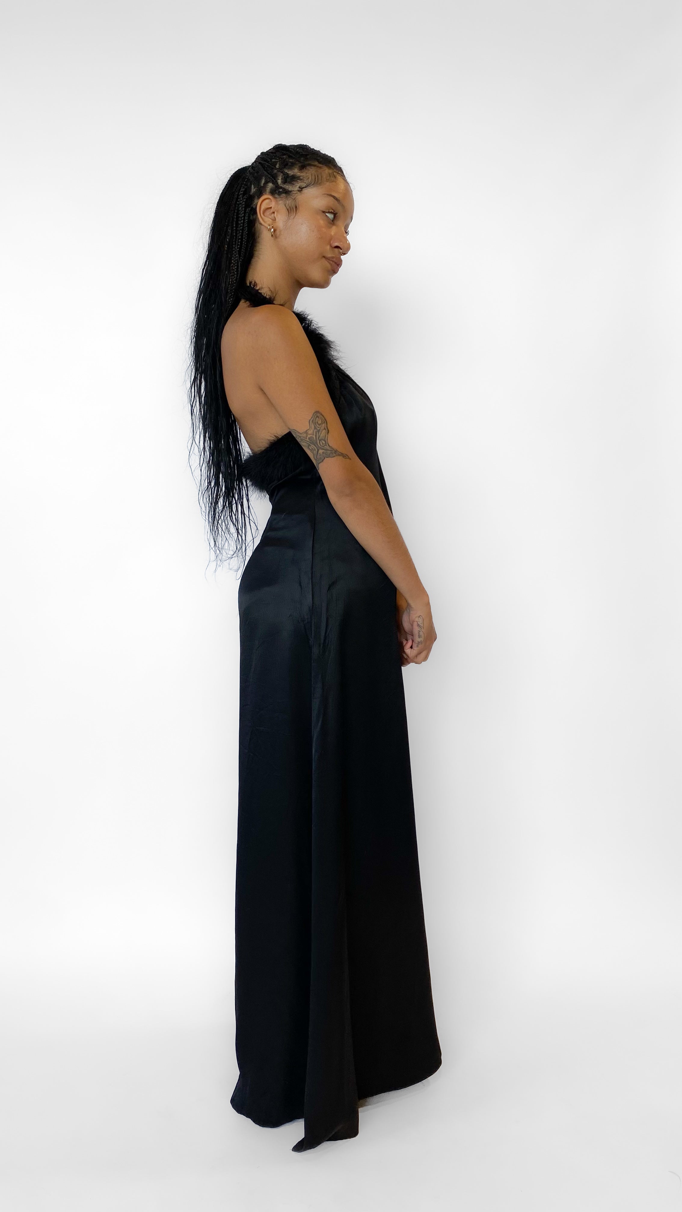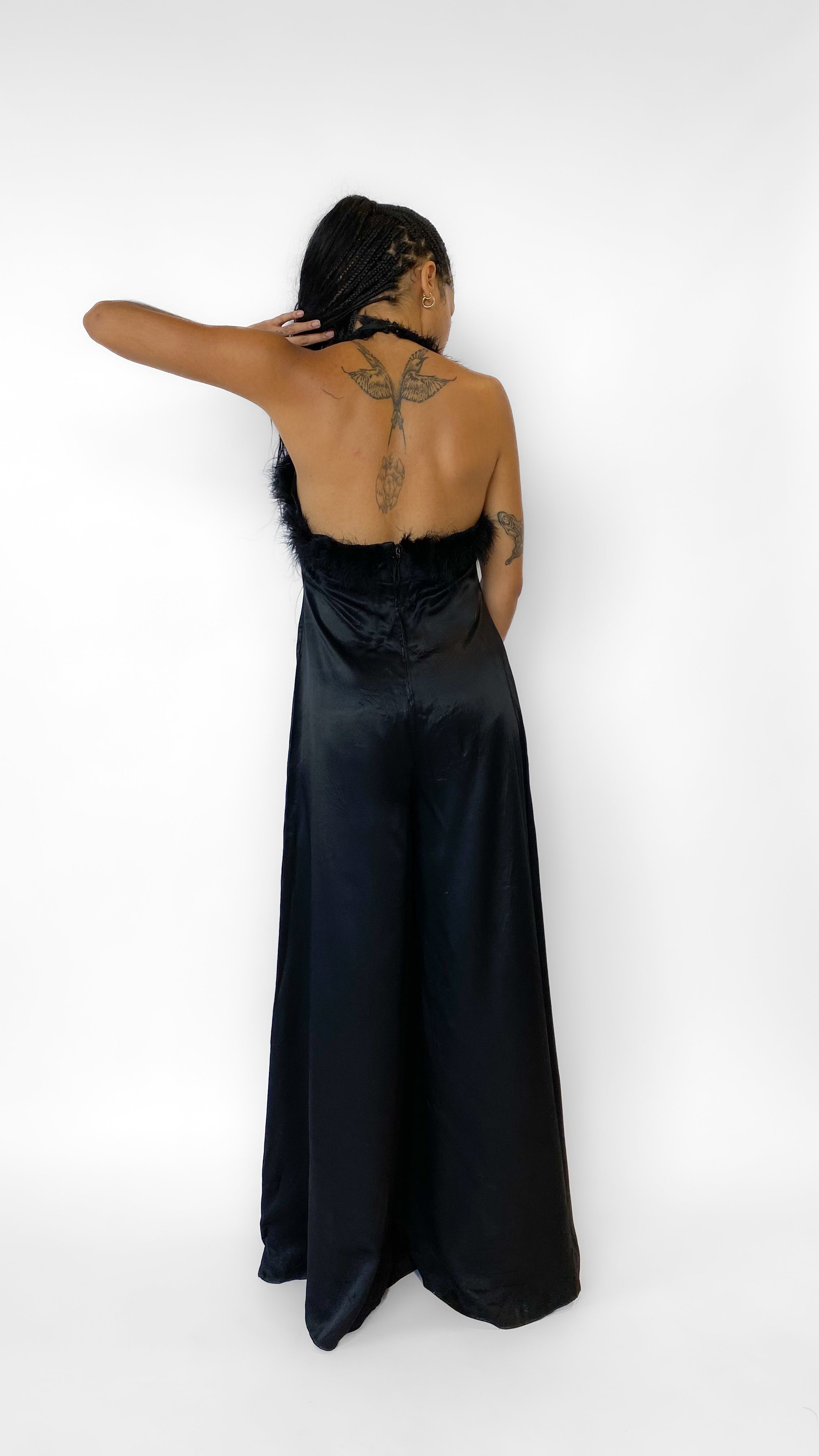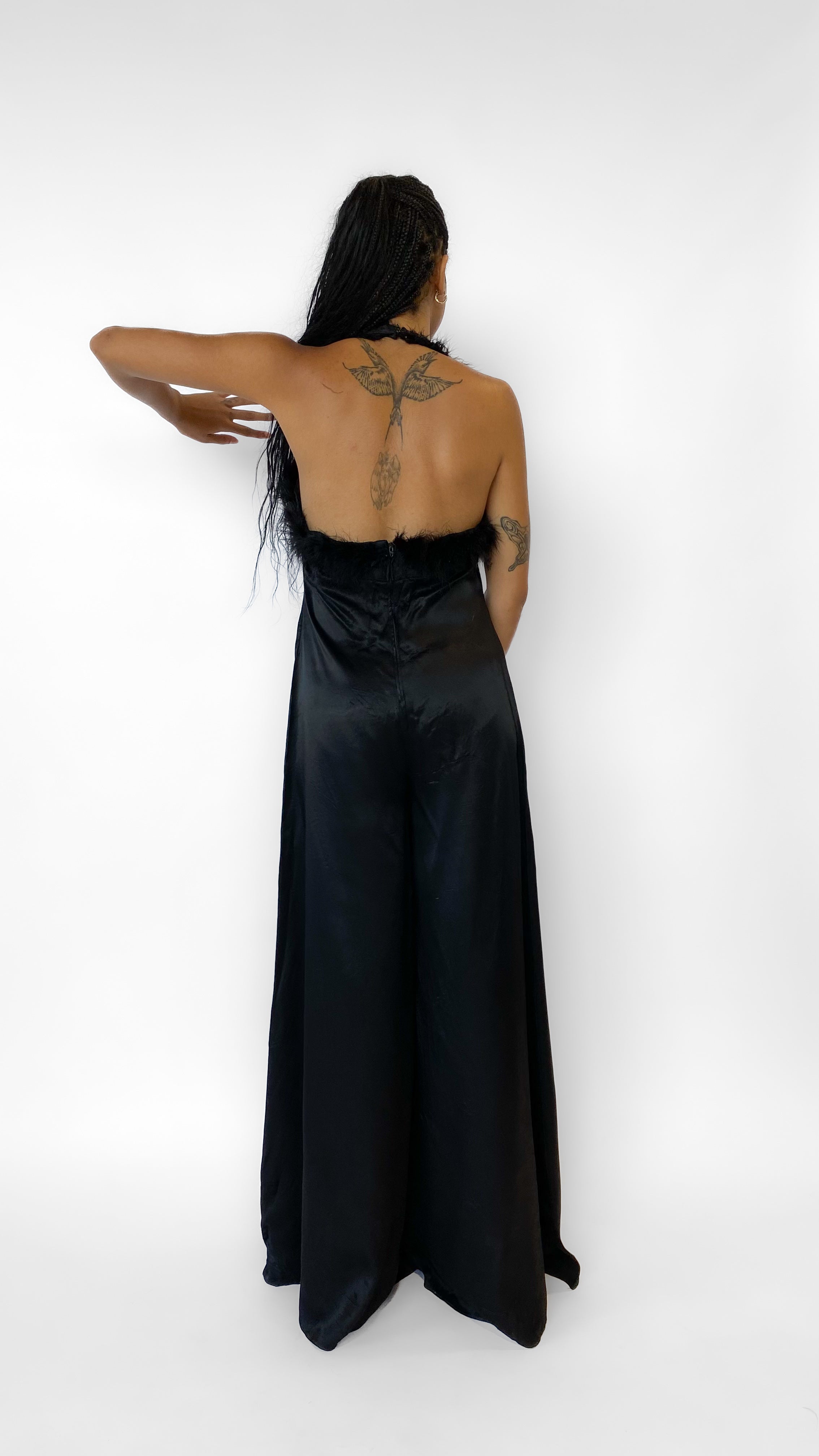 Description: Black satin jumpsuit with halter neckline. Has zipper closure down center back, with feather trim around neckline. Halter top has hook & eye closure.