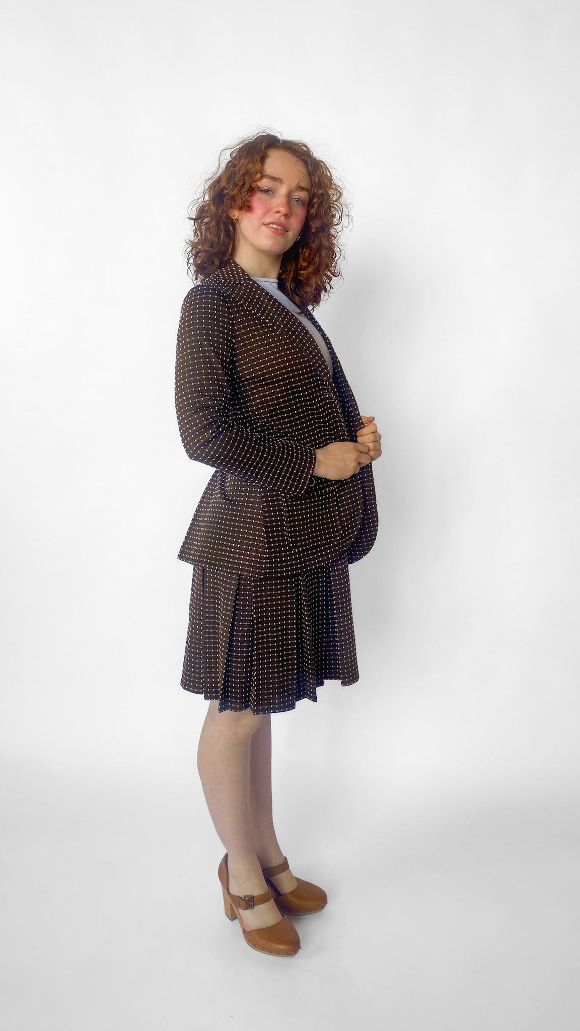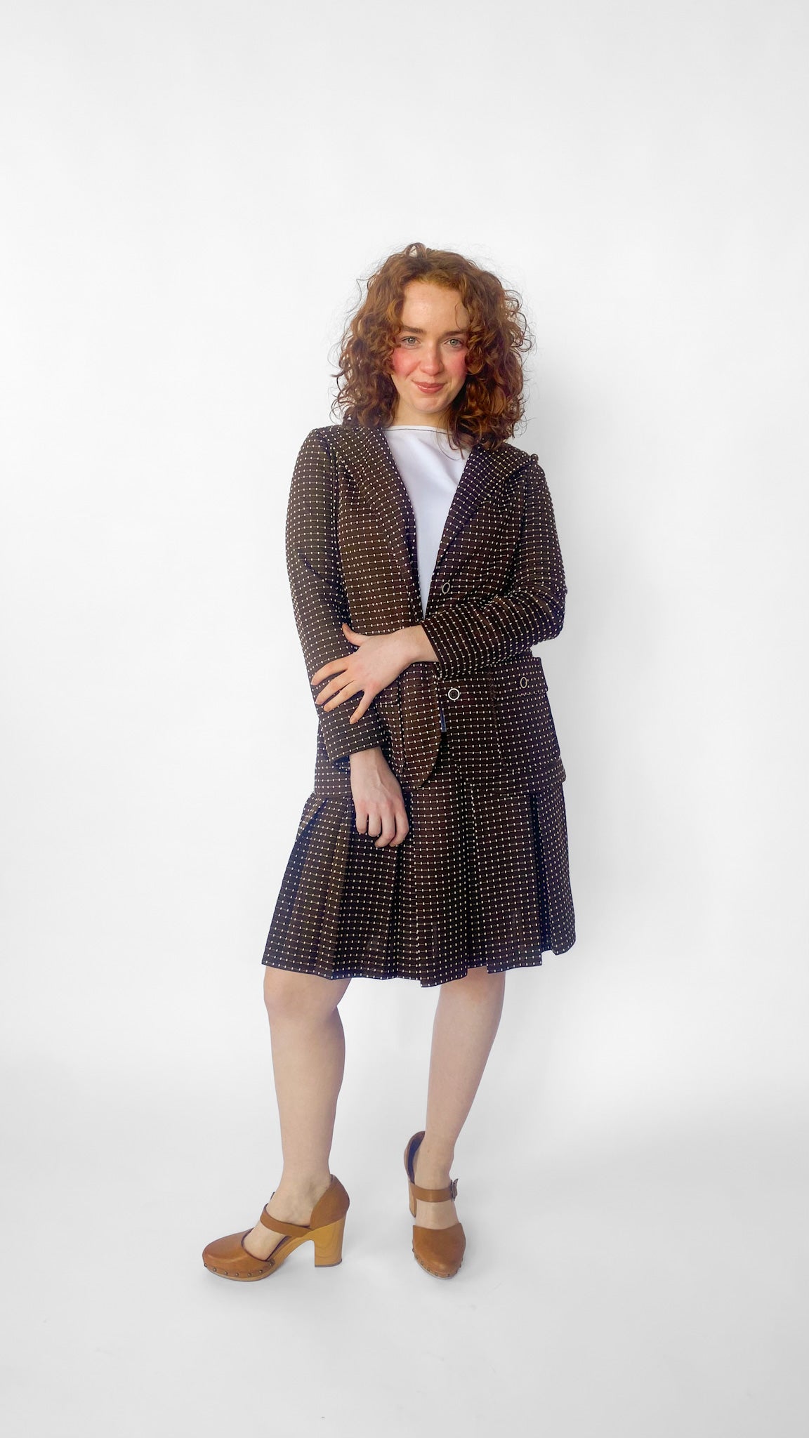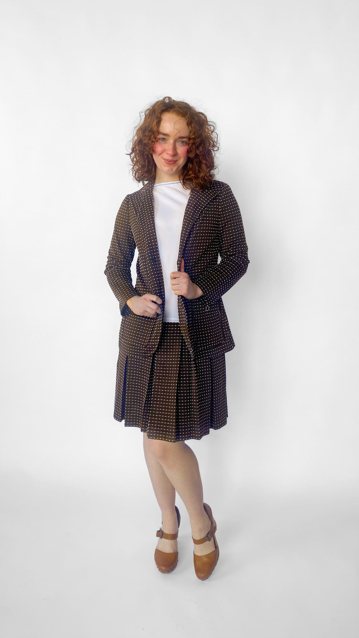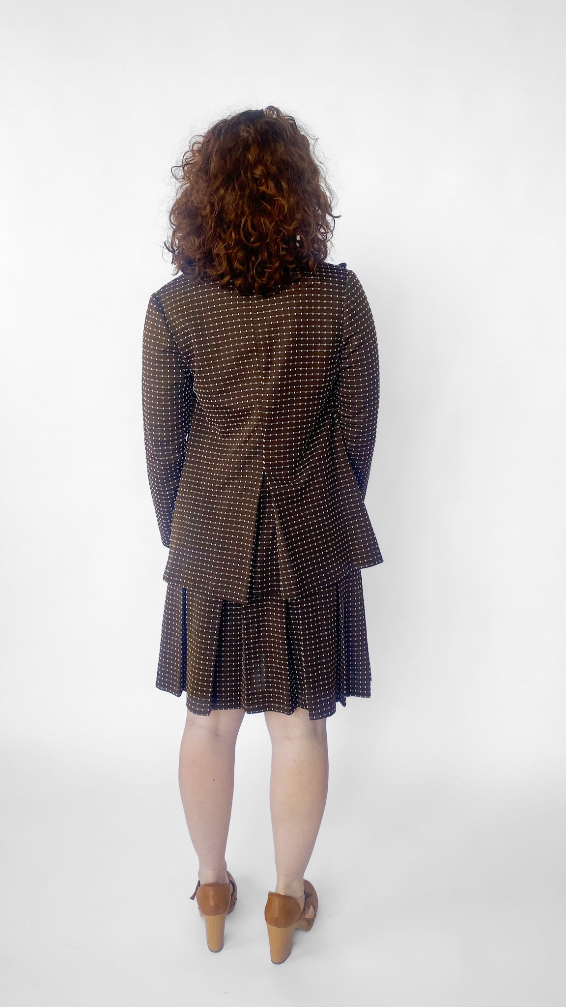 Brown & white polka-dot jacket & dress set. Dress has pleated skirt & ivory bodice with contrast stitching. Has zipper closure down center back.