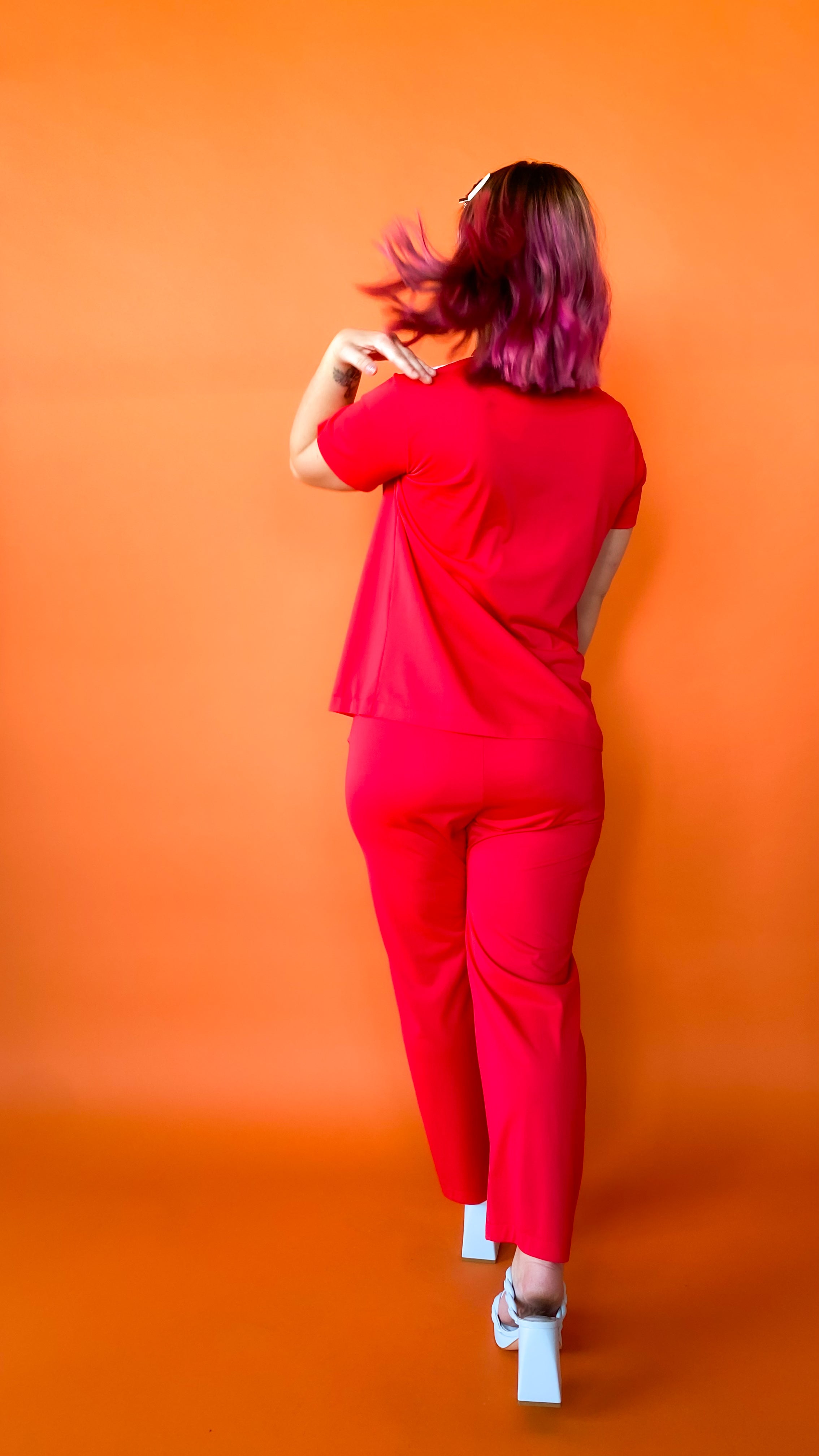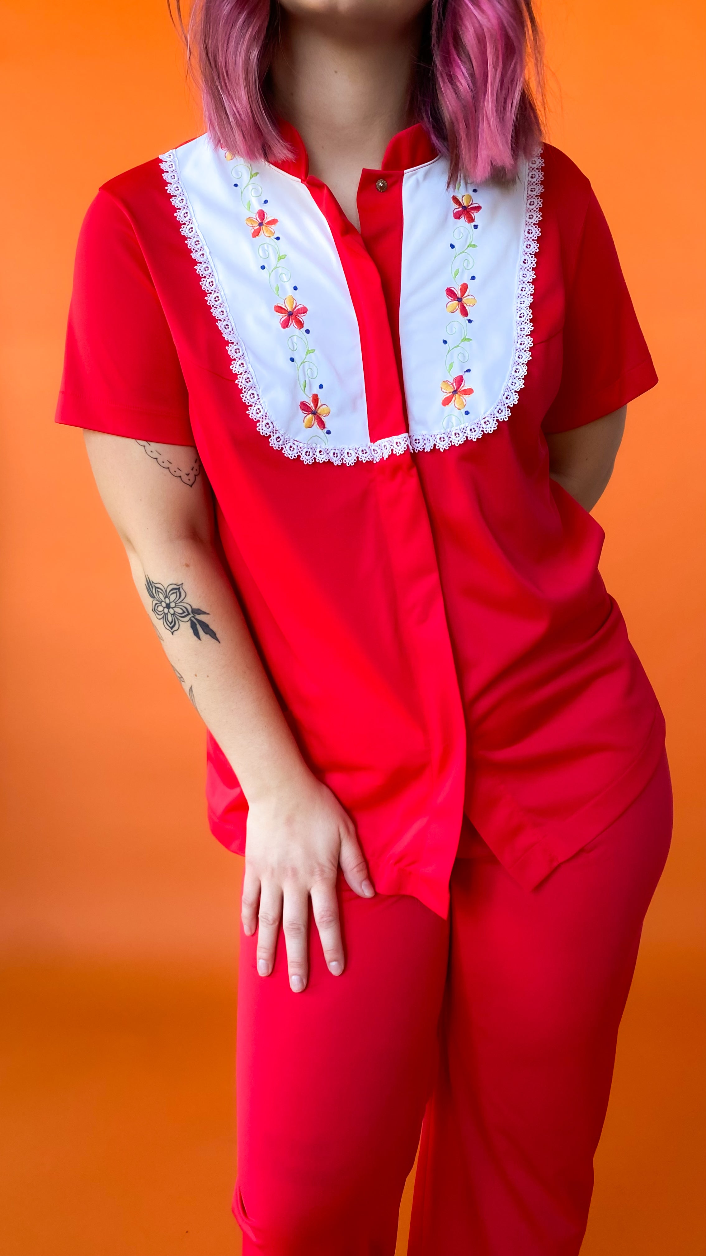 Description: Red short sleeve button down shirt and pant set. Shirt has white bib detail with embroidered flowers on front. Small side pocket on bottom left of shirt. Pants have a slight elastic waist.