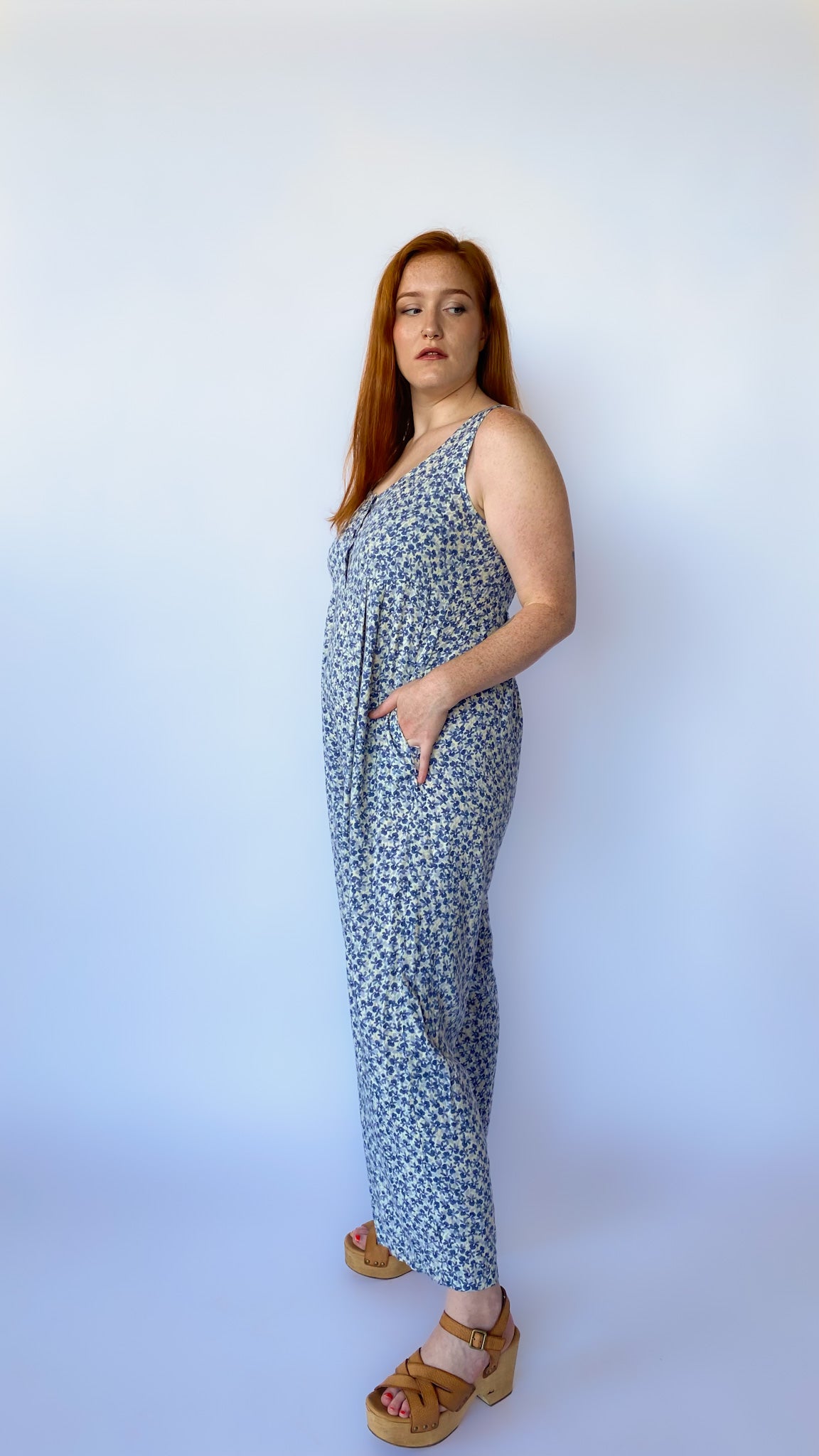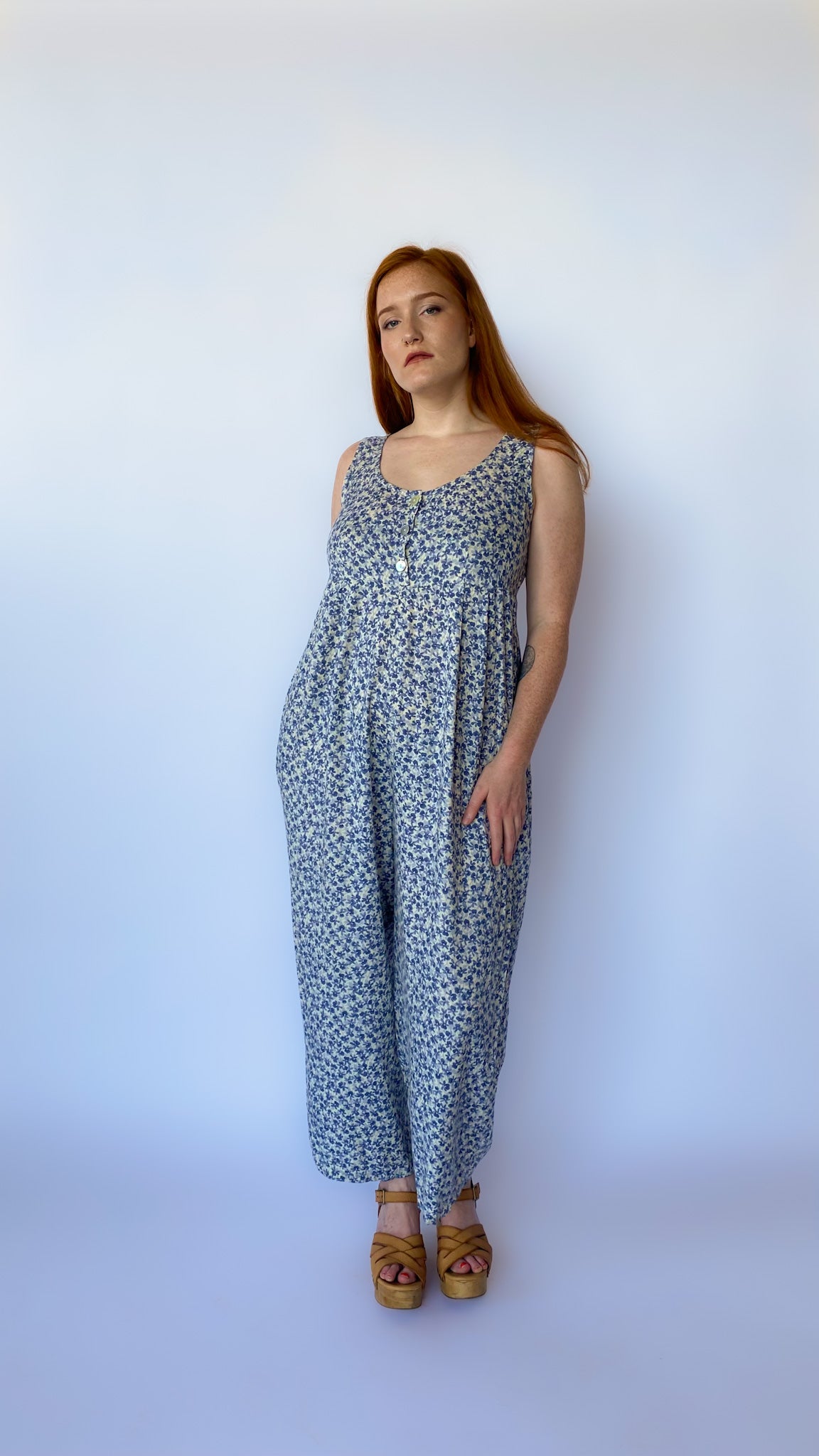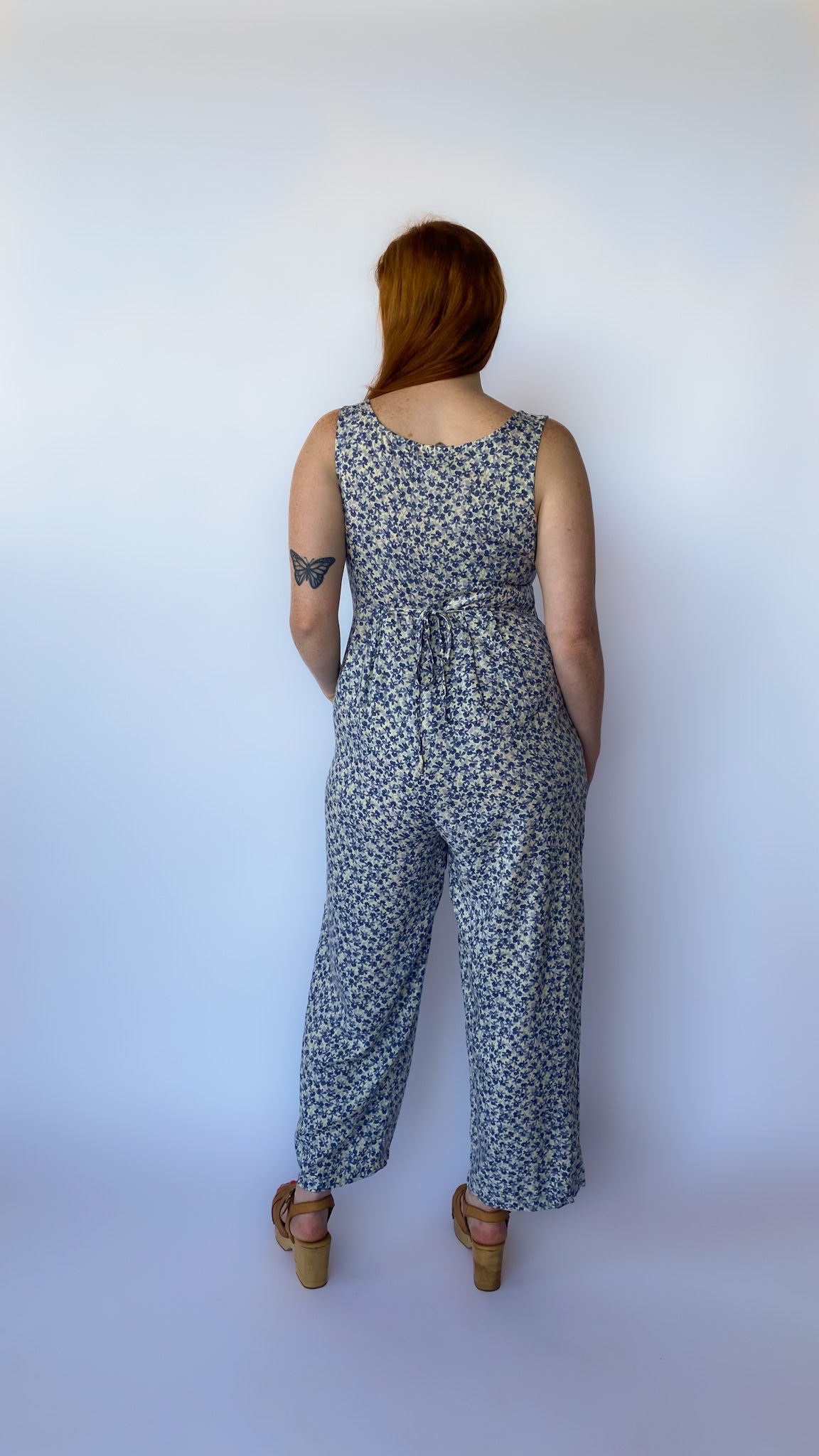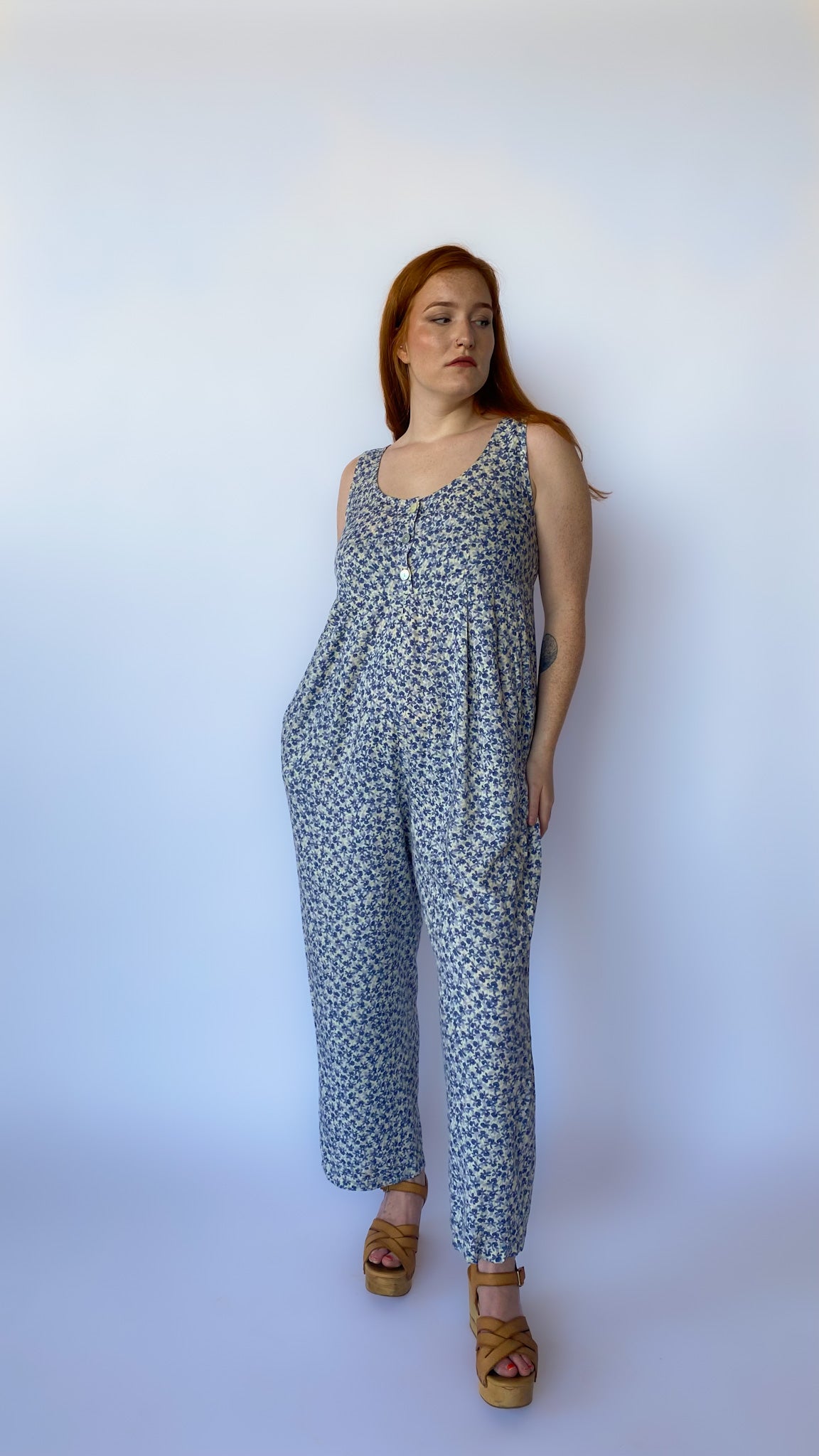 Description: Dusty blue foral patterned jumpsuit with mother of pearl buttons. Pleated waist, pockets, tie-back, full legs.