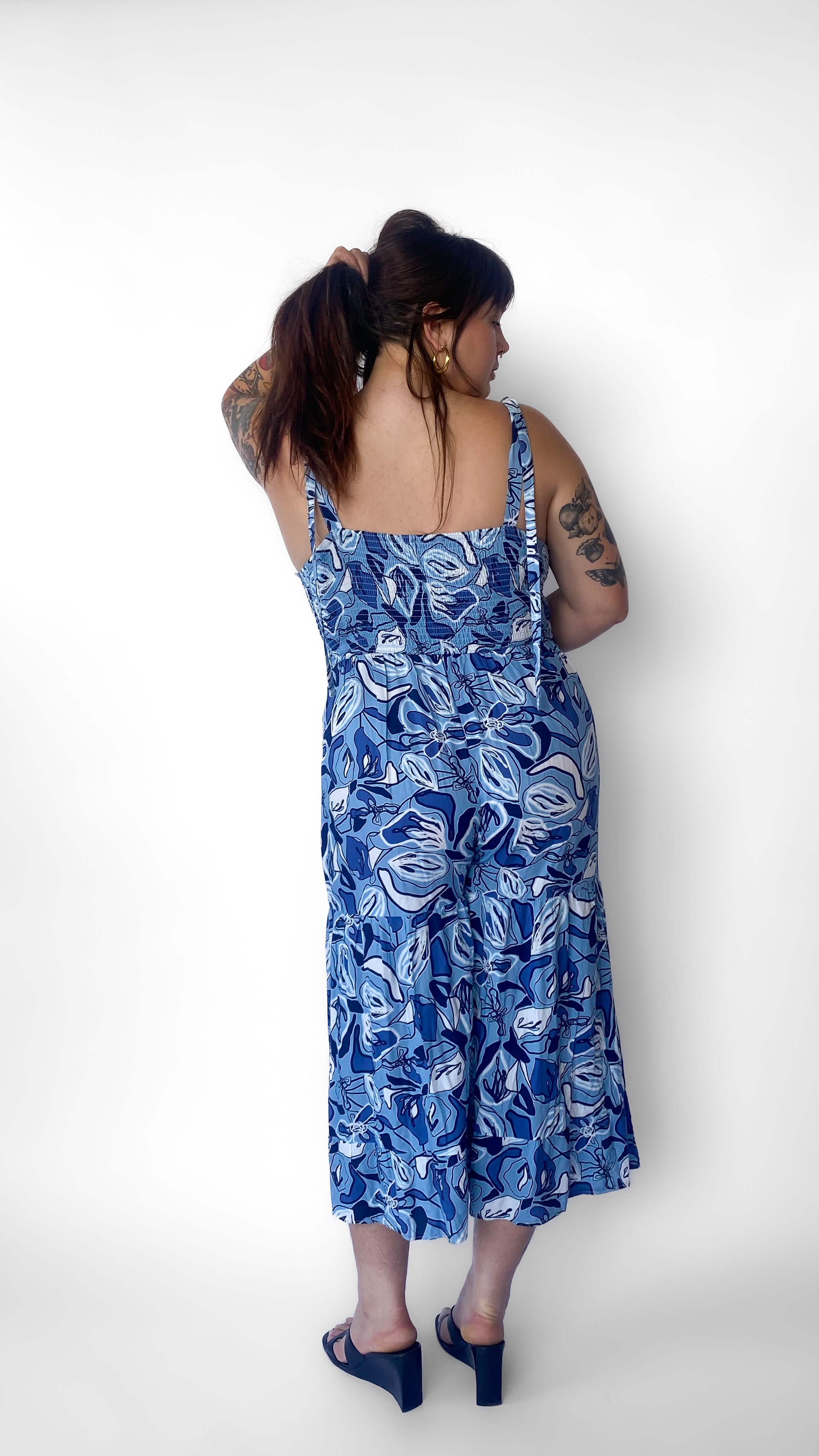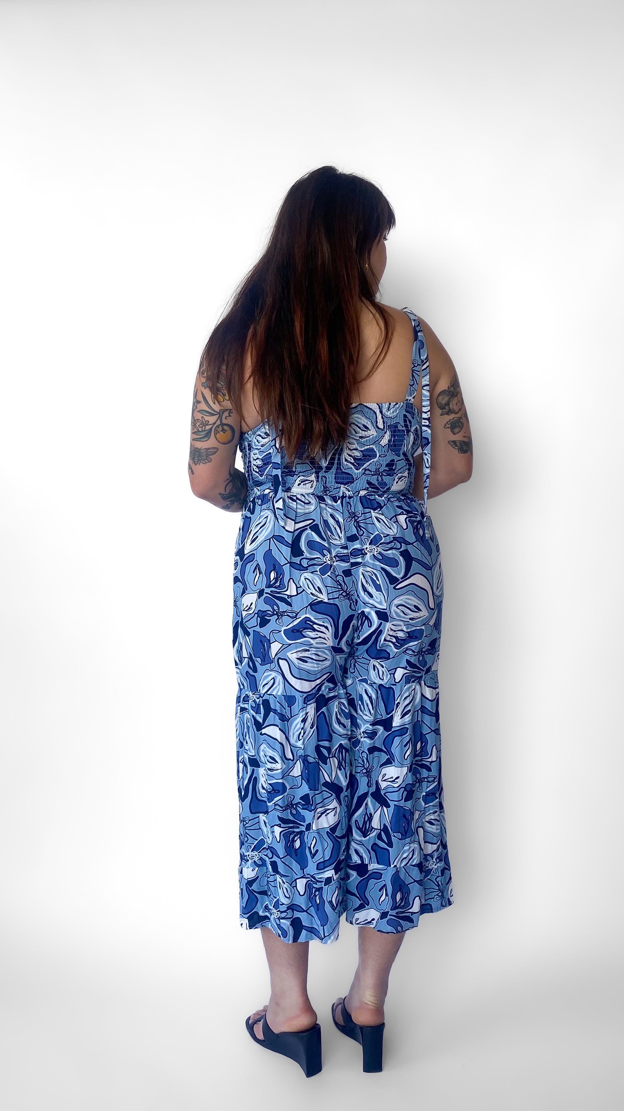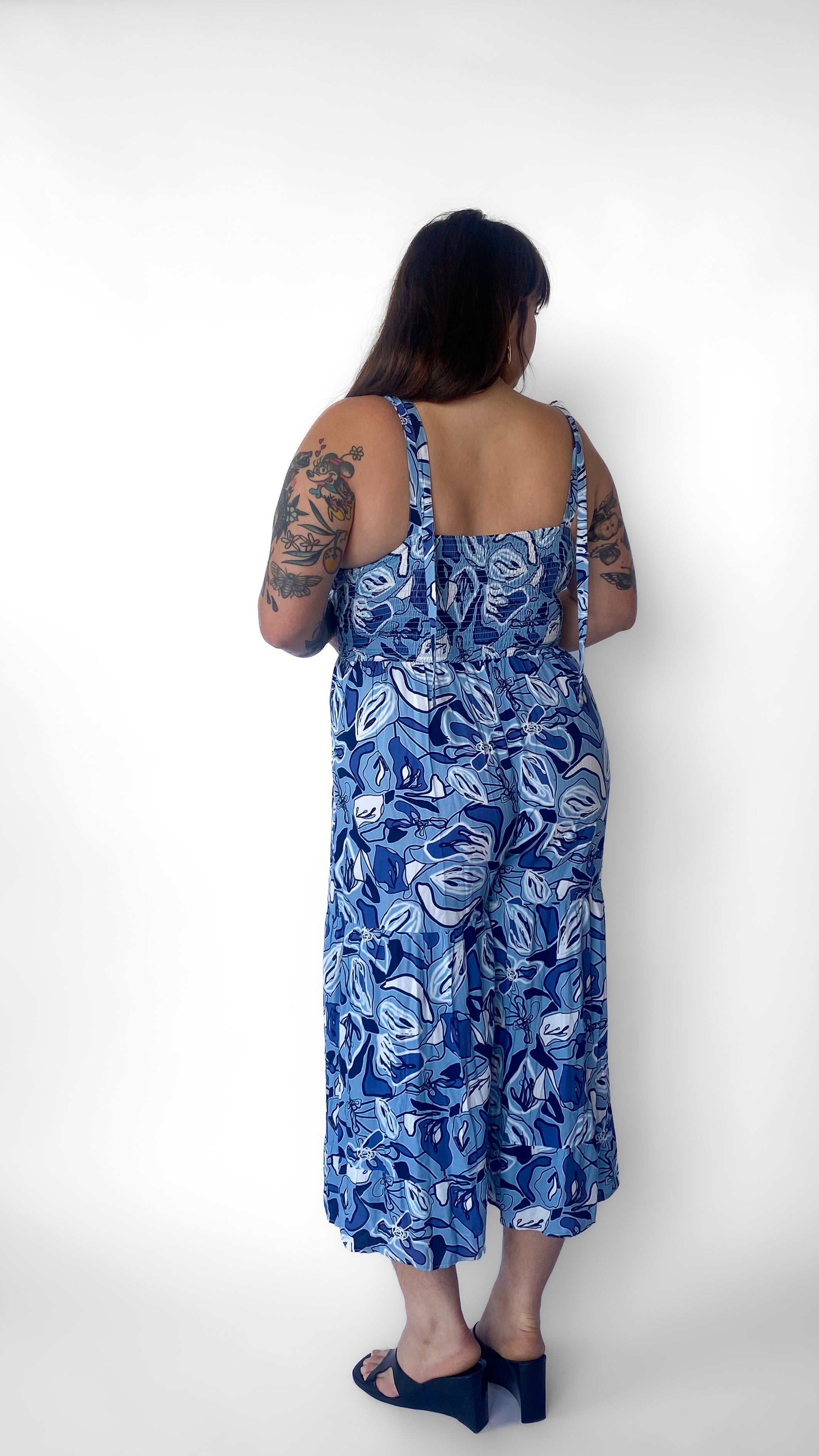 Blue wide leg jumpsuit with spaghetti straps and v neck key hole detail. Jumpsuit has smocked back, and ruffle hem. Pattern is light blue base with navy, white, and periwinkle blue abstract design.