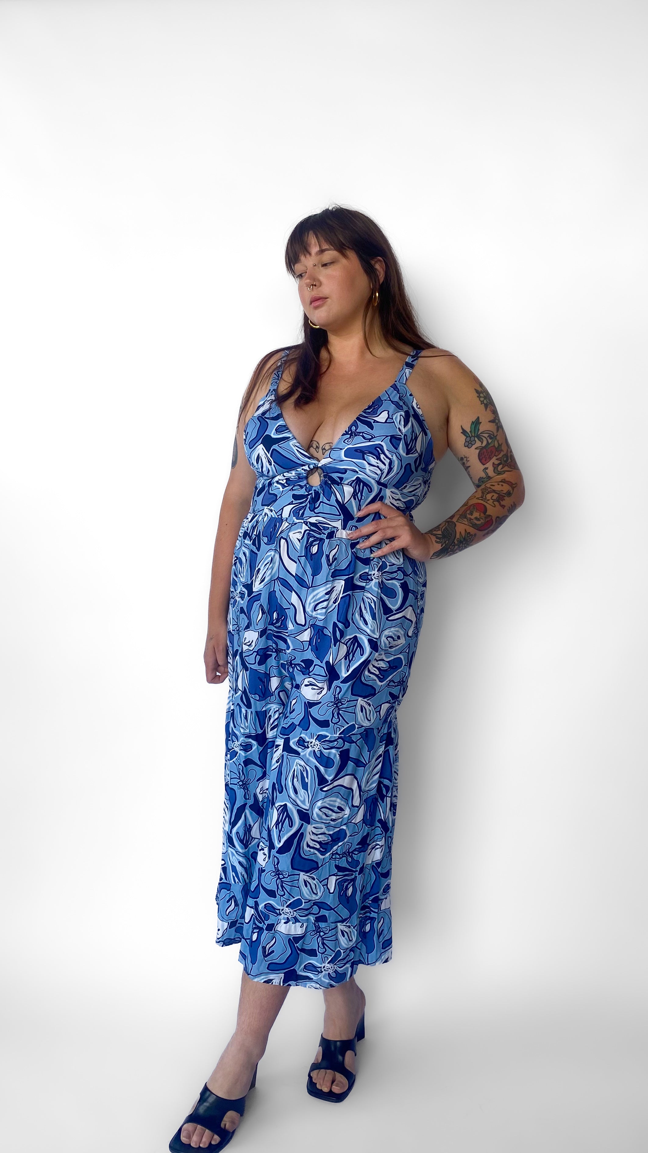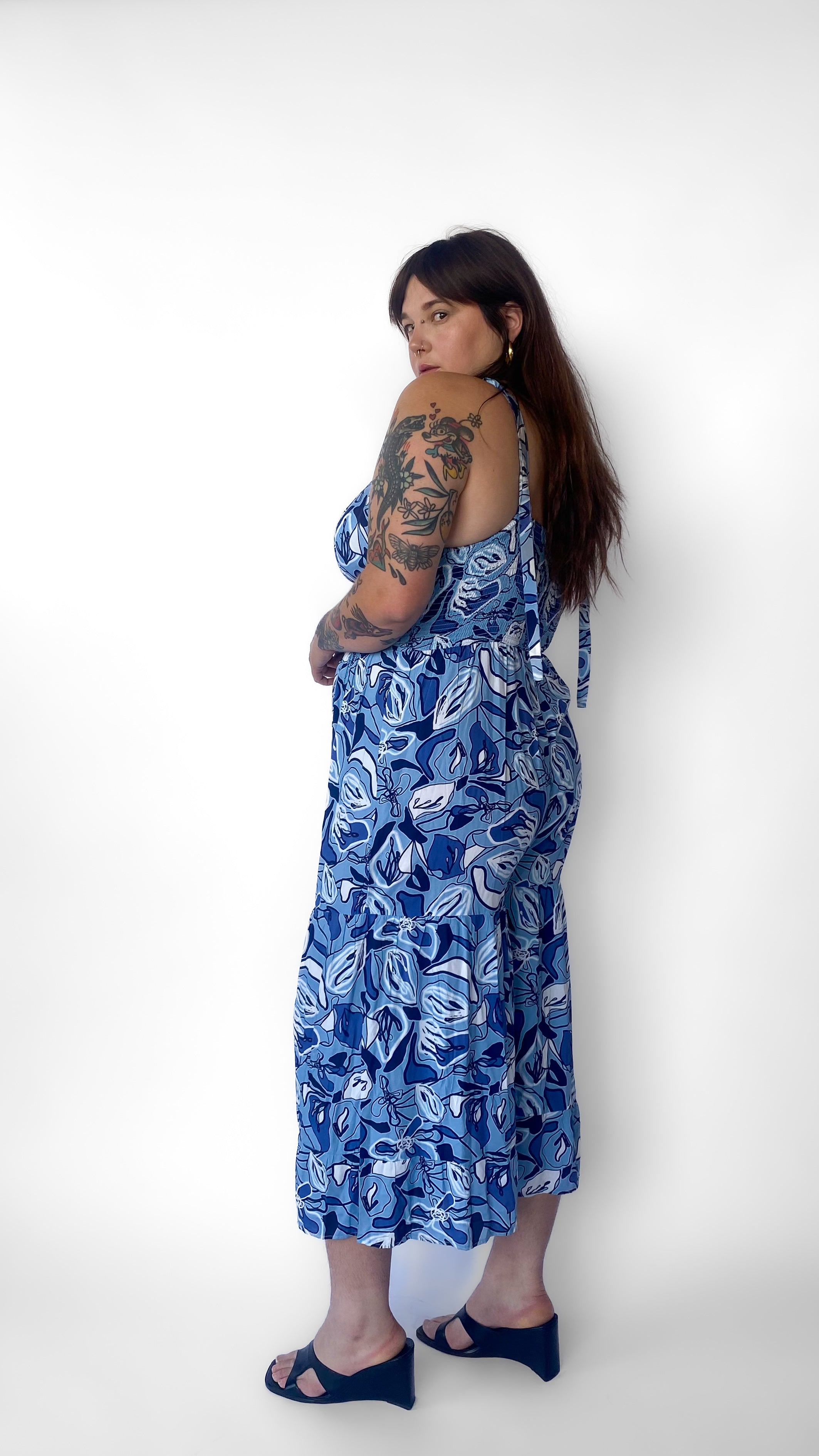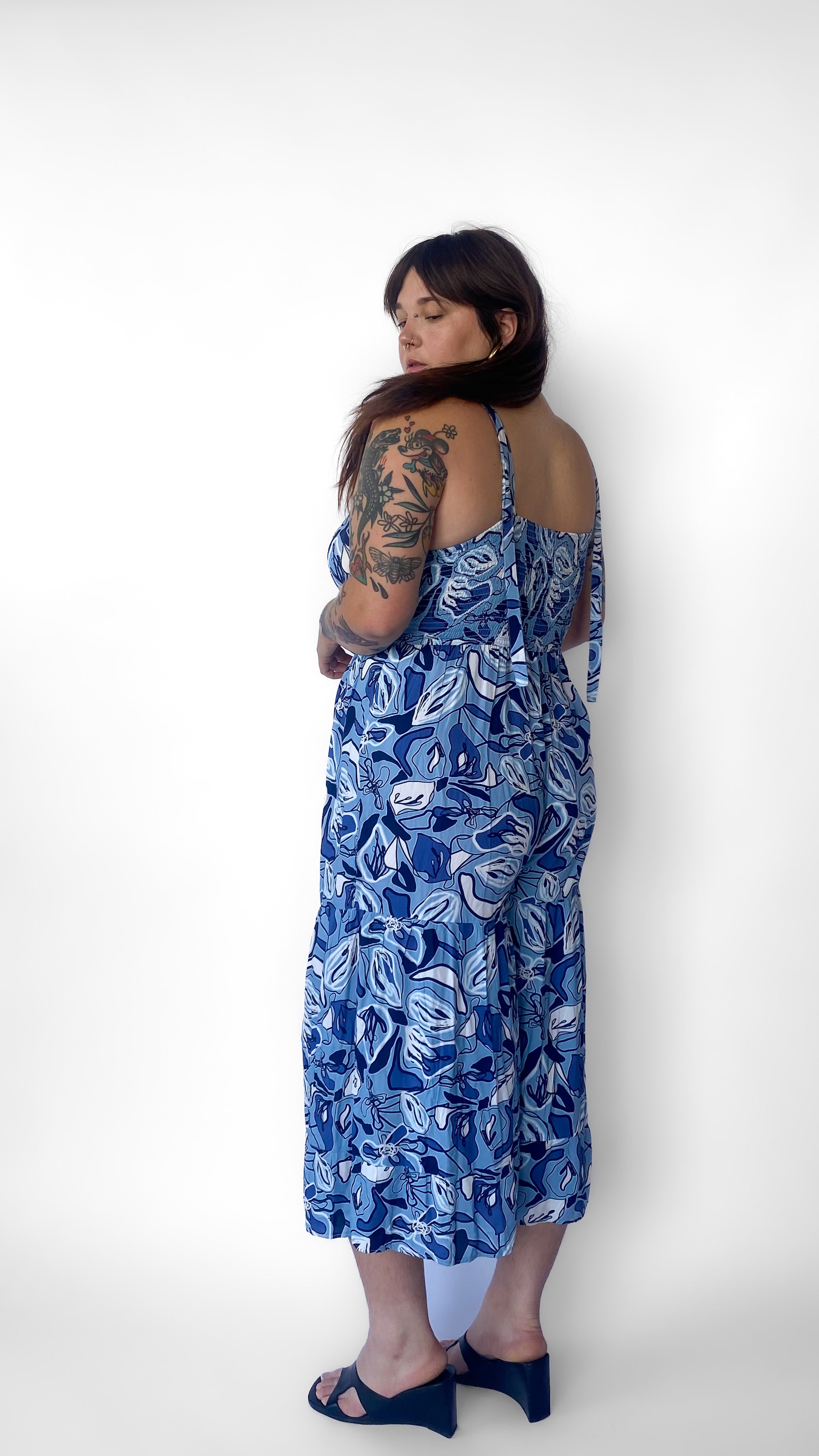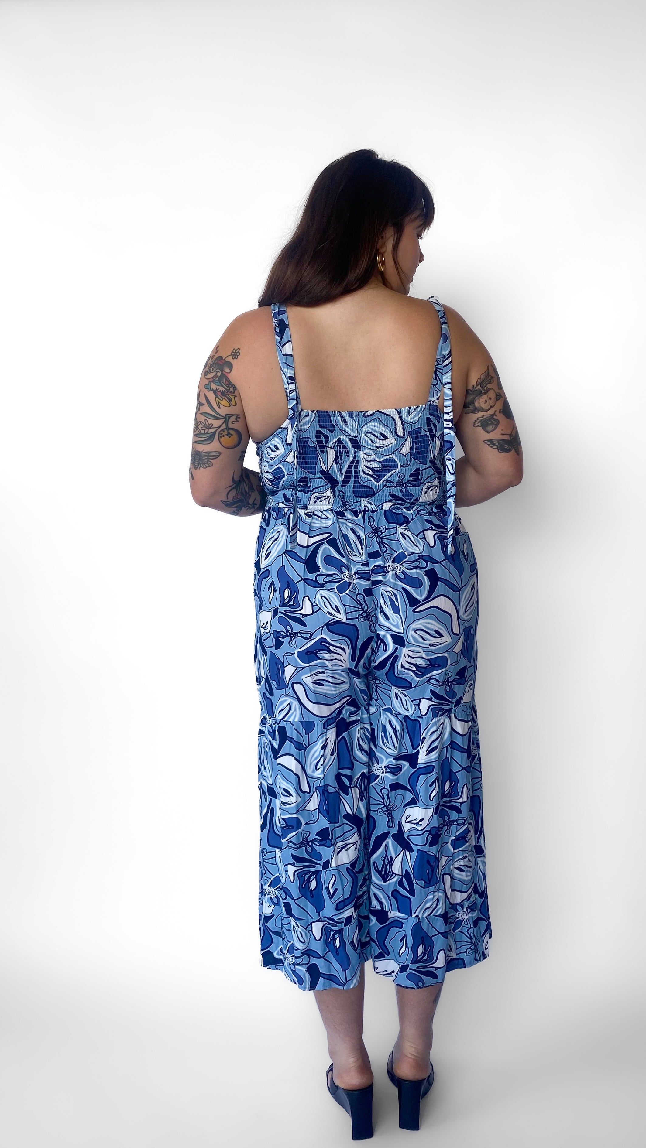 Blue wide leg jumpsuit with spaghetti straps and v neck key hole detail. Jumpsuit has smocked back, and ruffle hem. Pattern is light blue base with navy, white, and periwinkle blue abstract design.