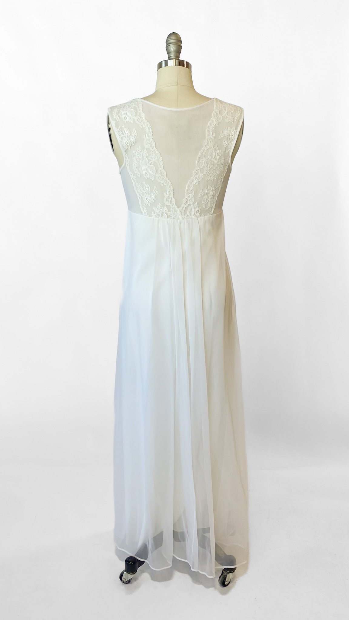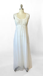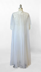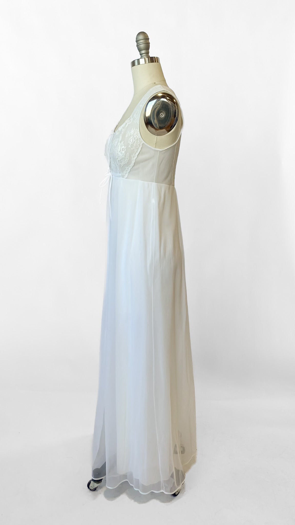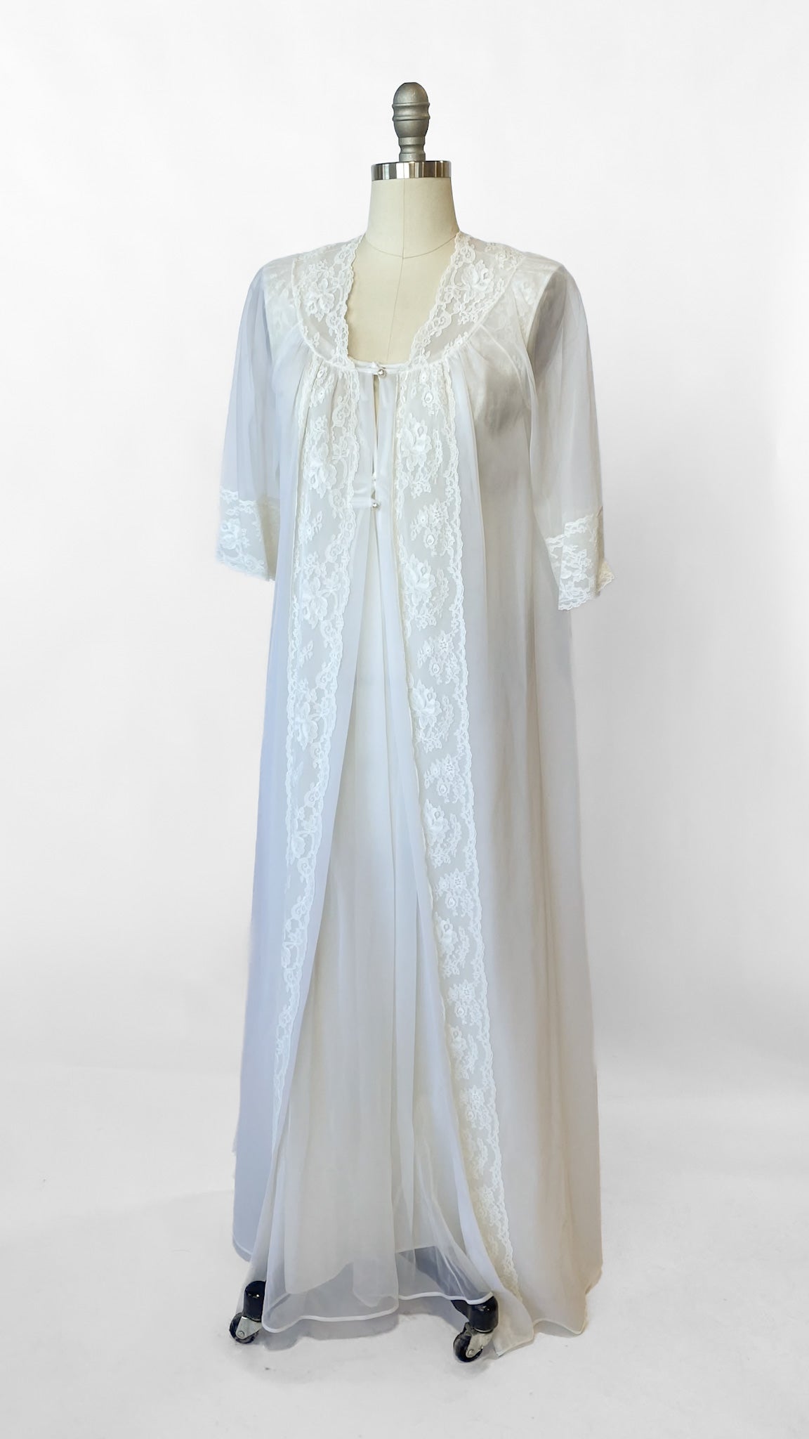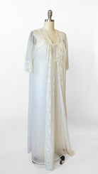 White semi-sheer full length sleeveless nightgown. Lace bodice with ties at neckline and under bust and small faux pearl beaded details. Matching robe has 3/4 length sleeves, 2 faux pearl buttons at chest.