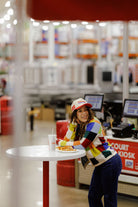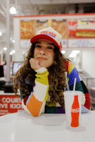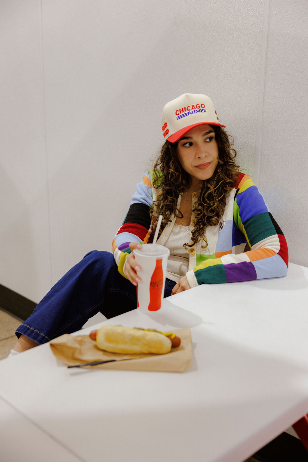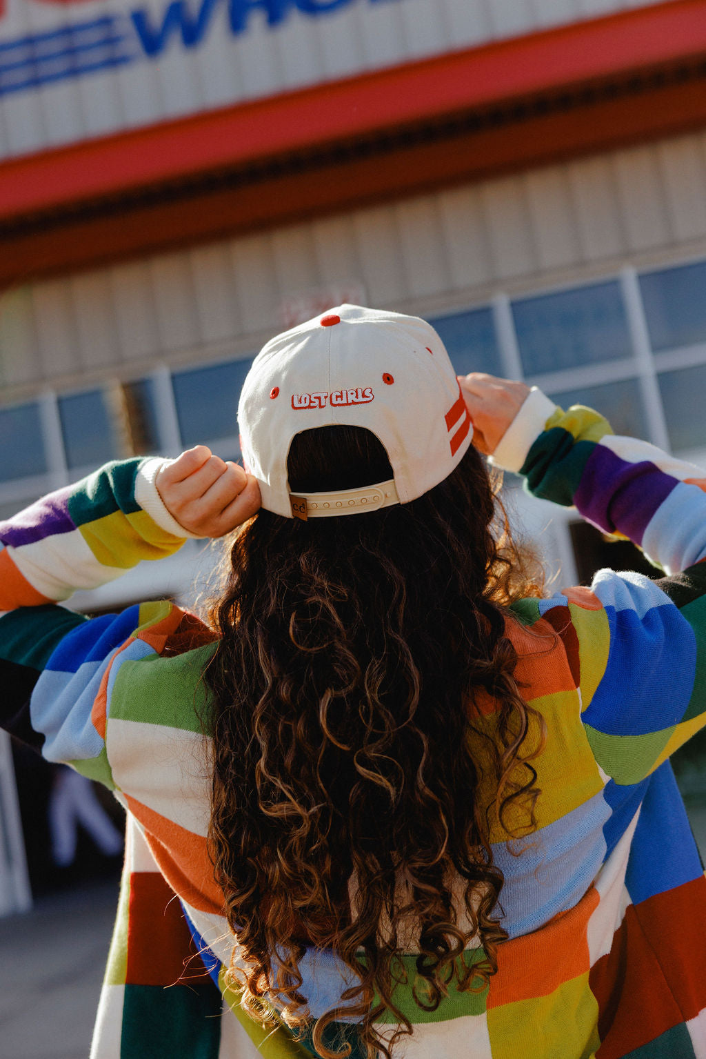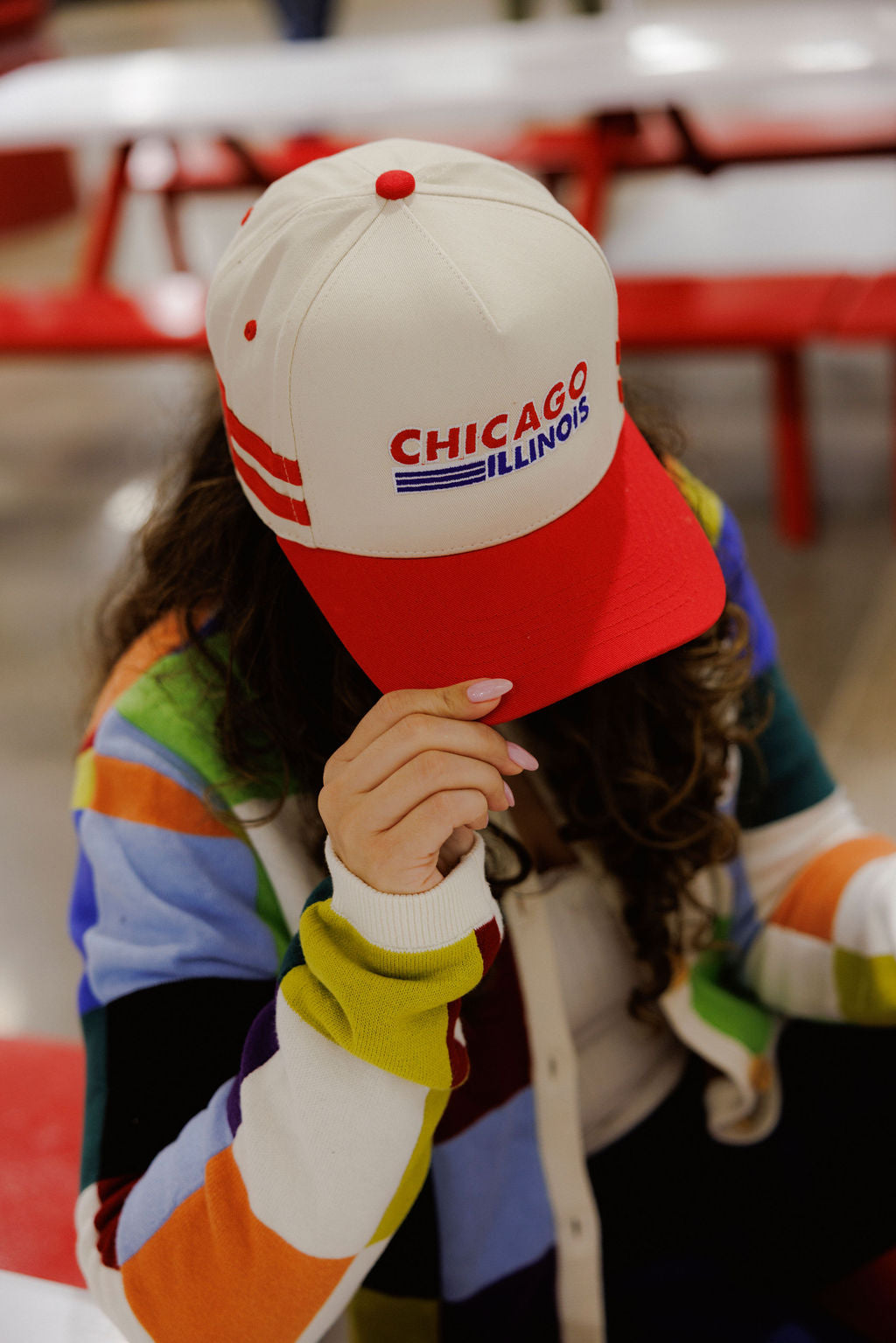 Cream baseball cap panels with a red bill. Text reading "Chicago Illinois" in the style of bulk grocery chain. Adjustable back. Style has been designed and created by Lost Girls and embroidered in the USA. Lost Girls logo on the back.