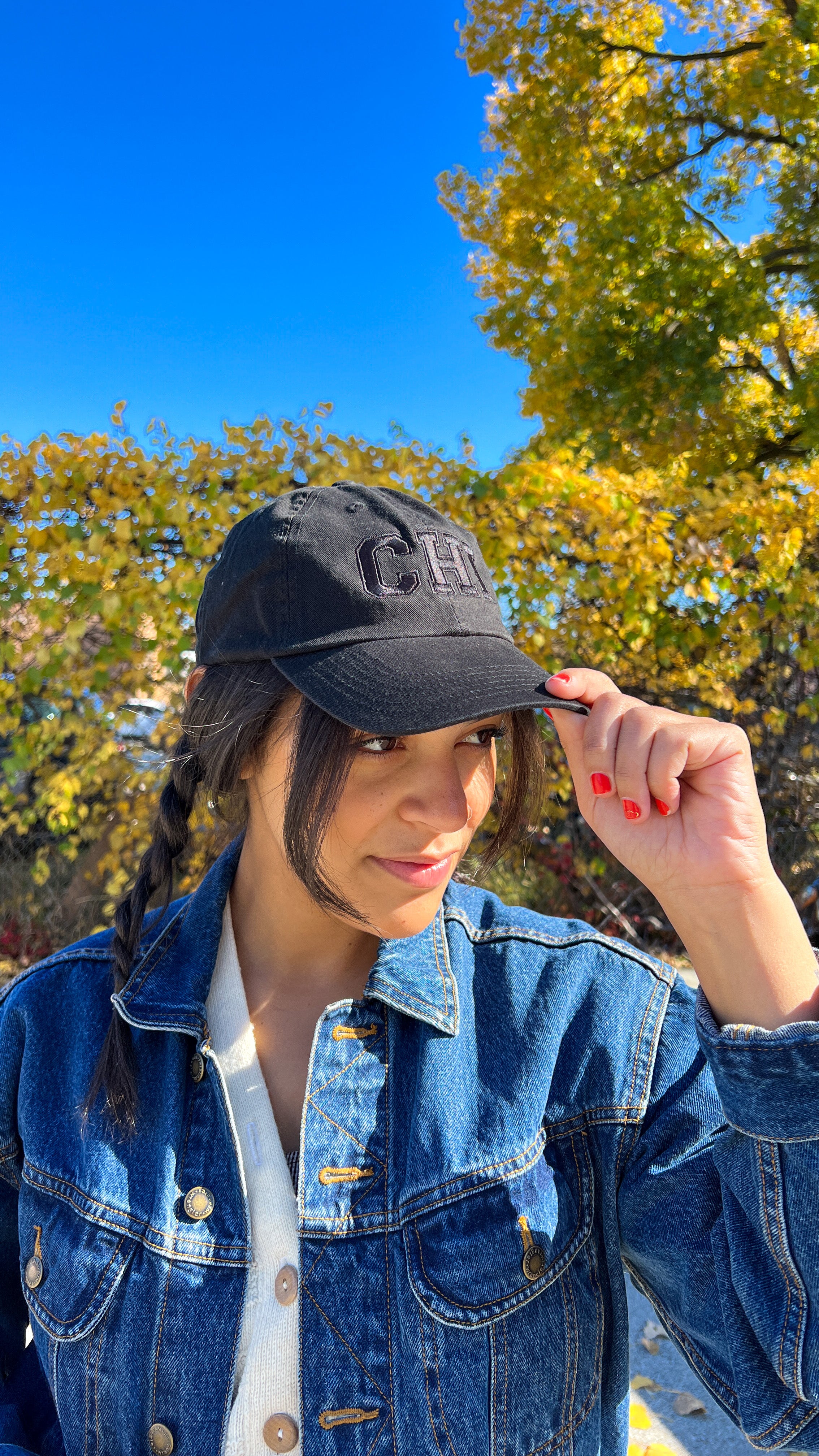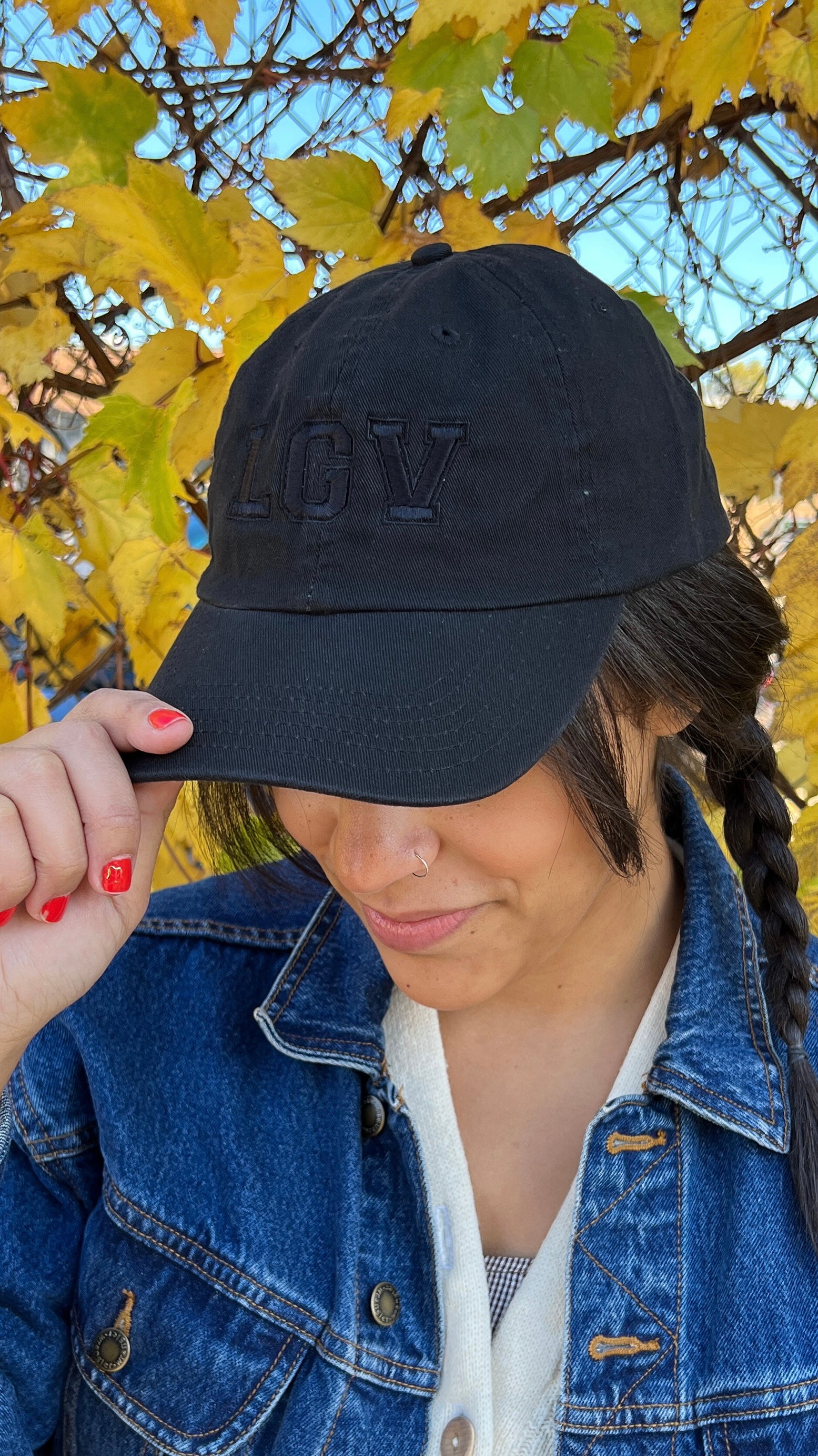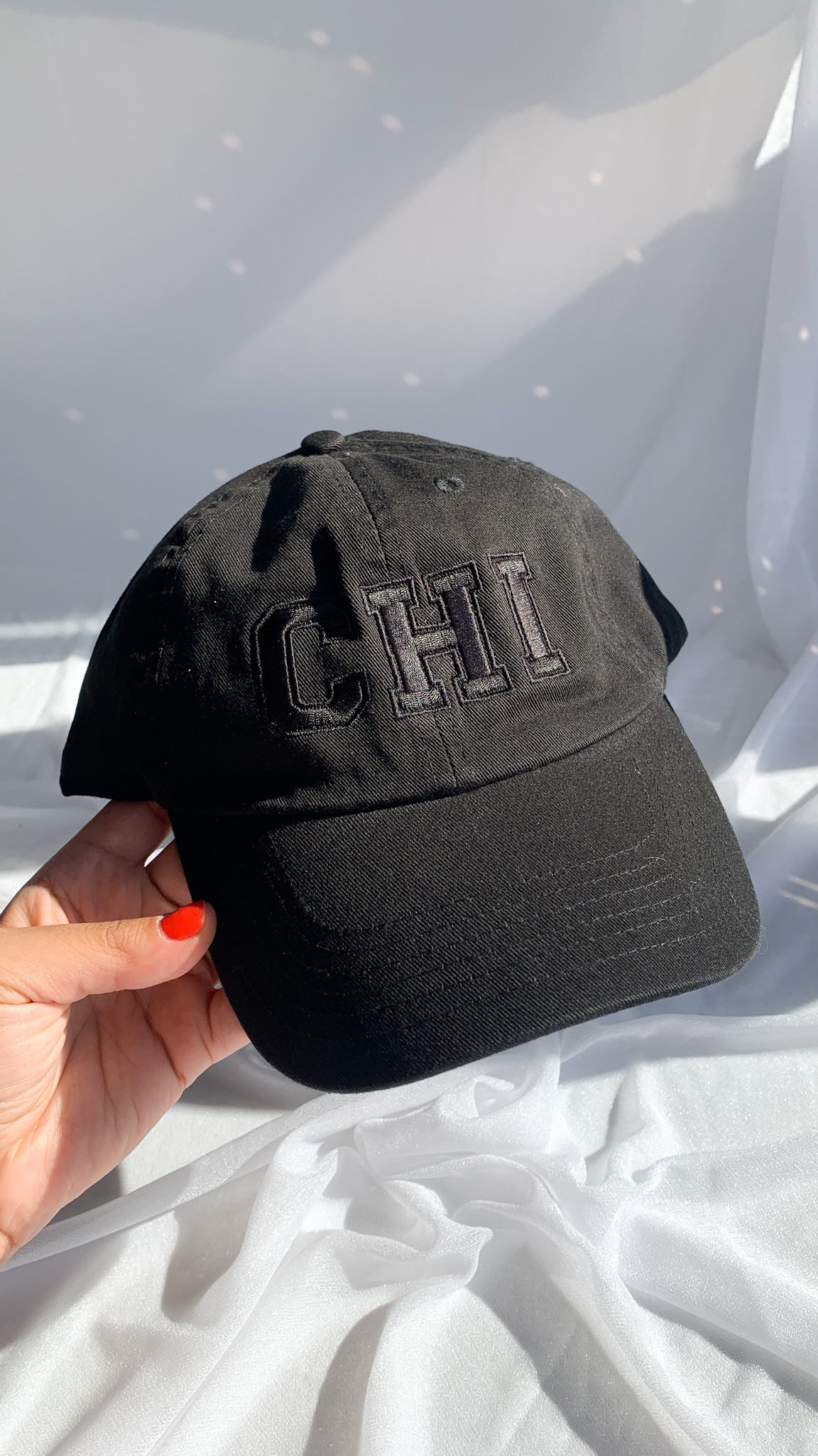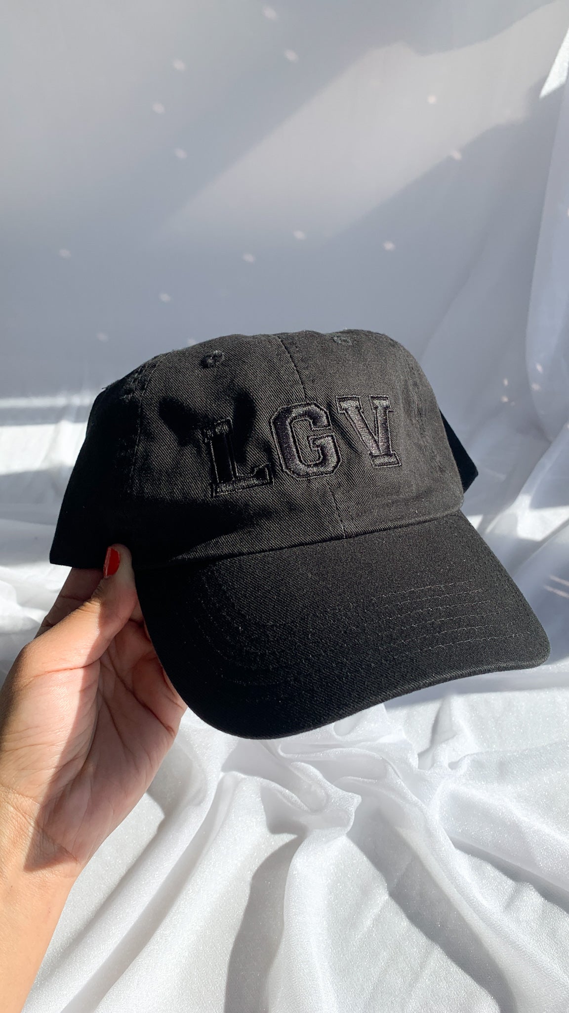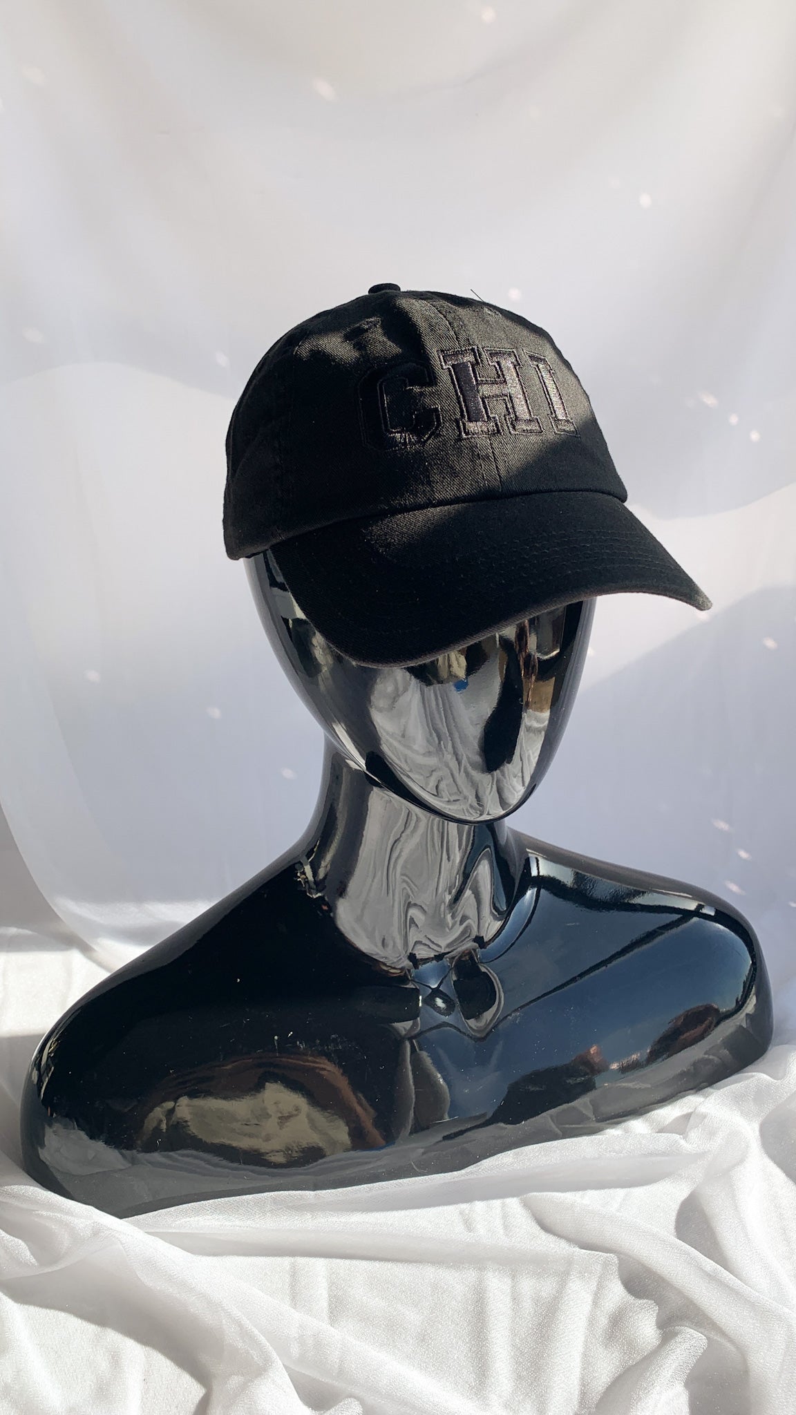 Black cap with black embroidered letters on the front. Adjustable back strap. Style has been designed and created by Lost Girls and embroidered in Chicago.