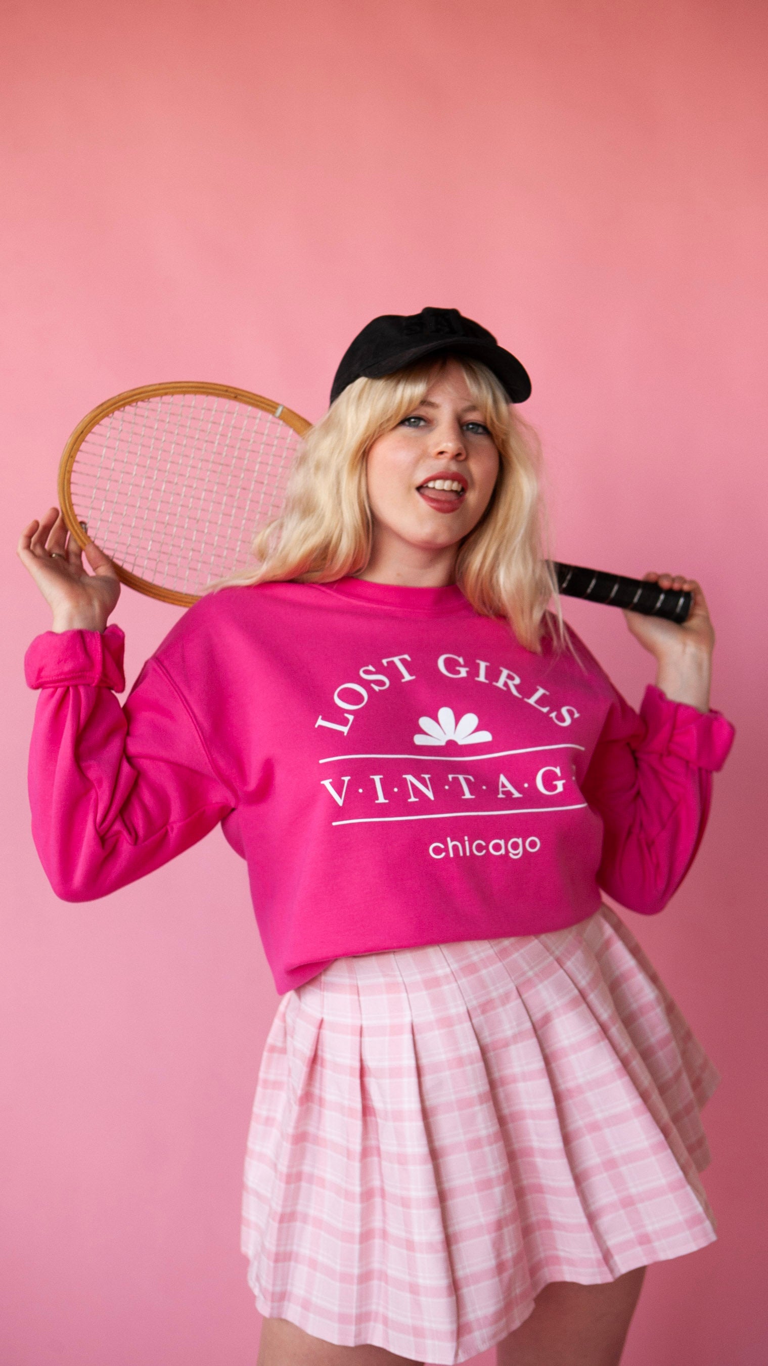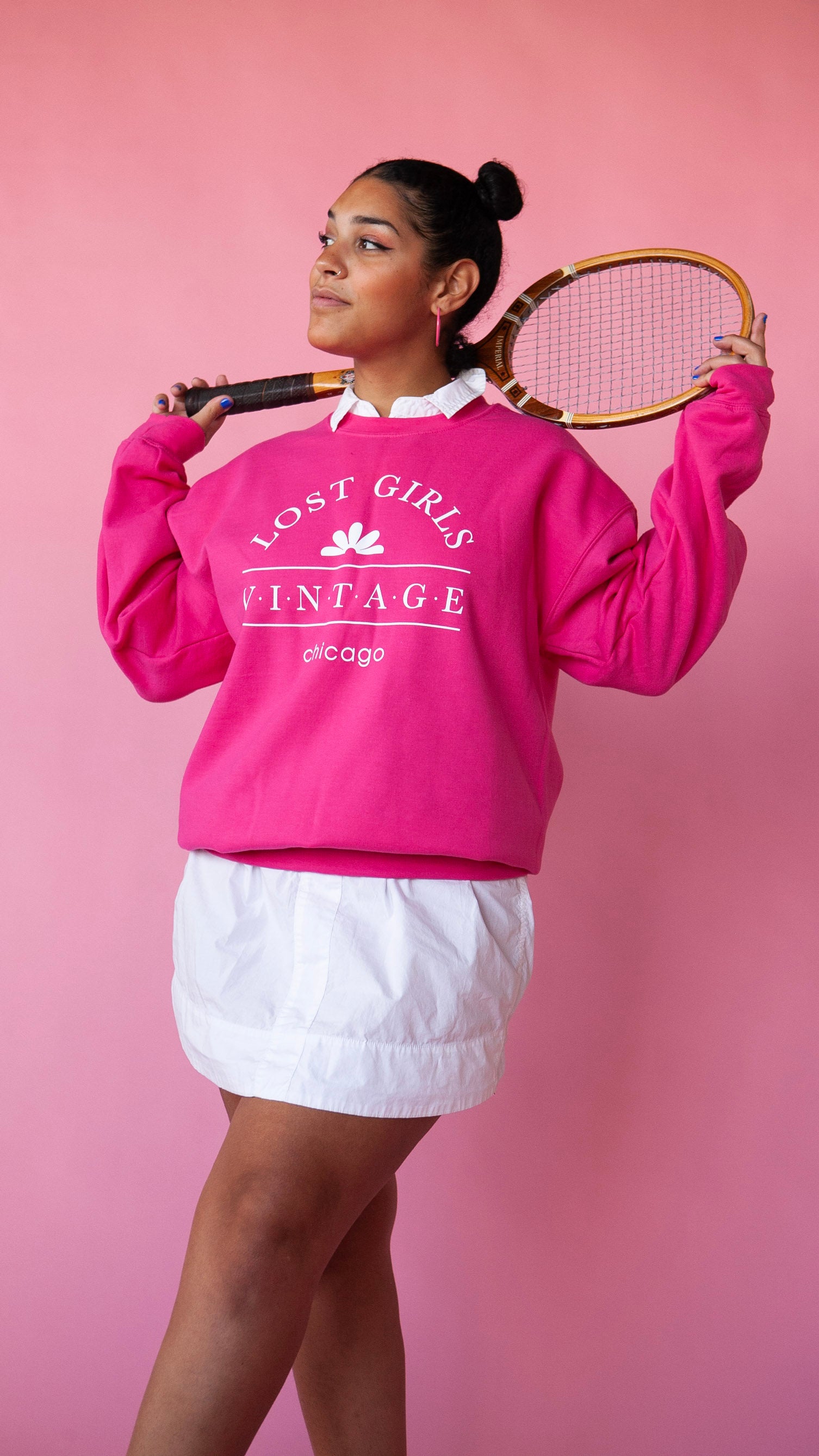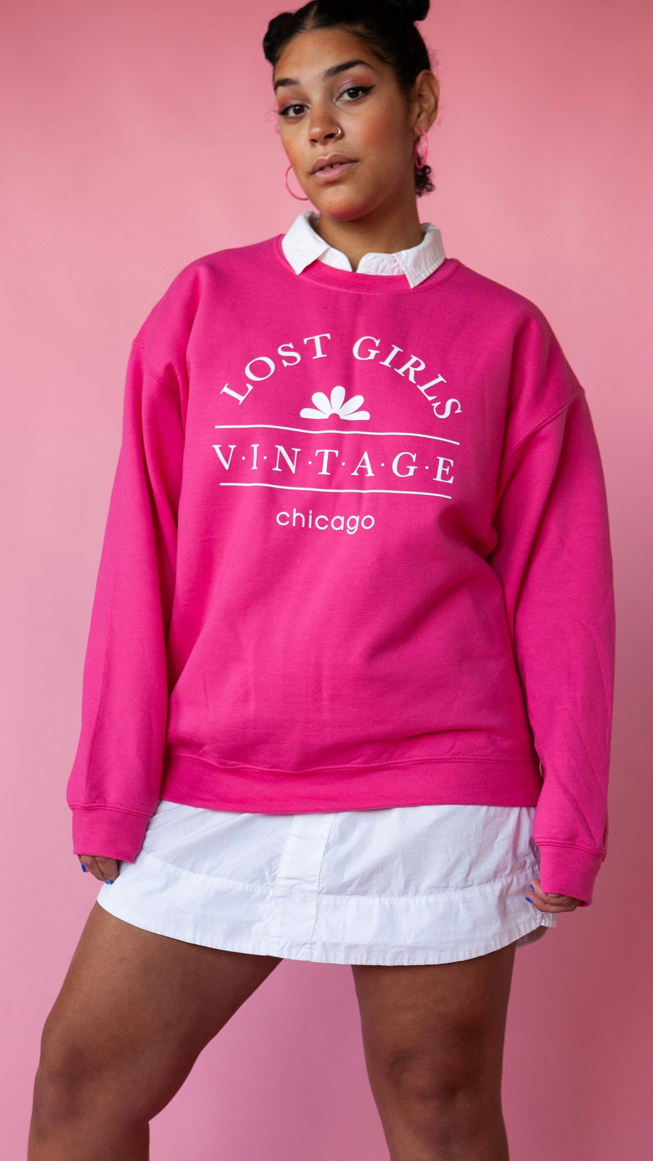 Hot pink crewneck sweatshirt with "Lost Girls Vintage Chicago" in white lettering. Design inspired by vintage sportswear. Super soft Gildan sweatshirt in sizes S-XL.