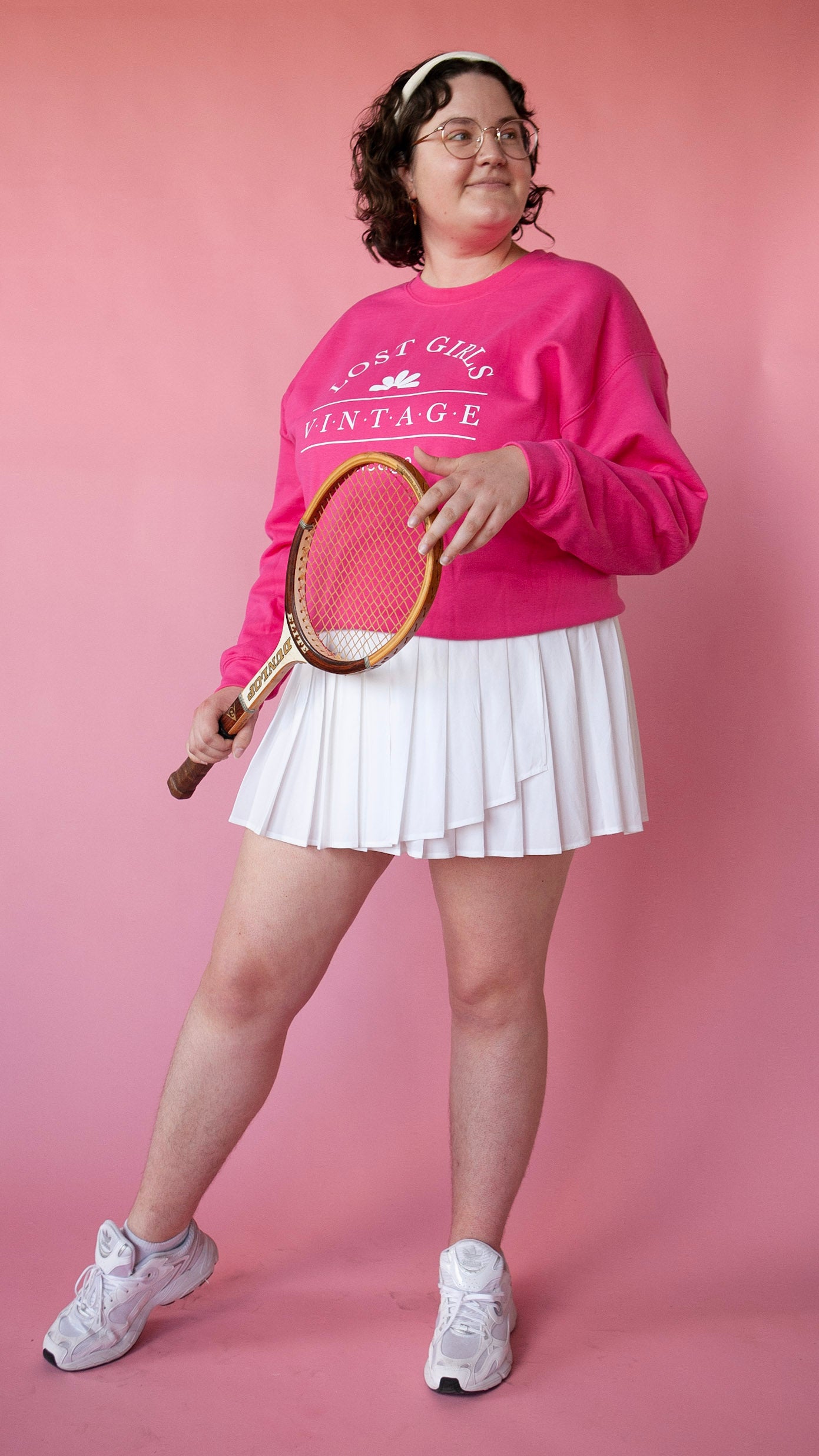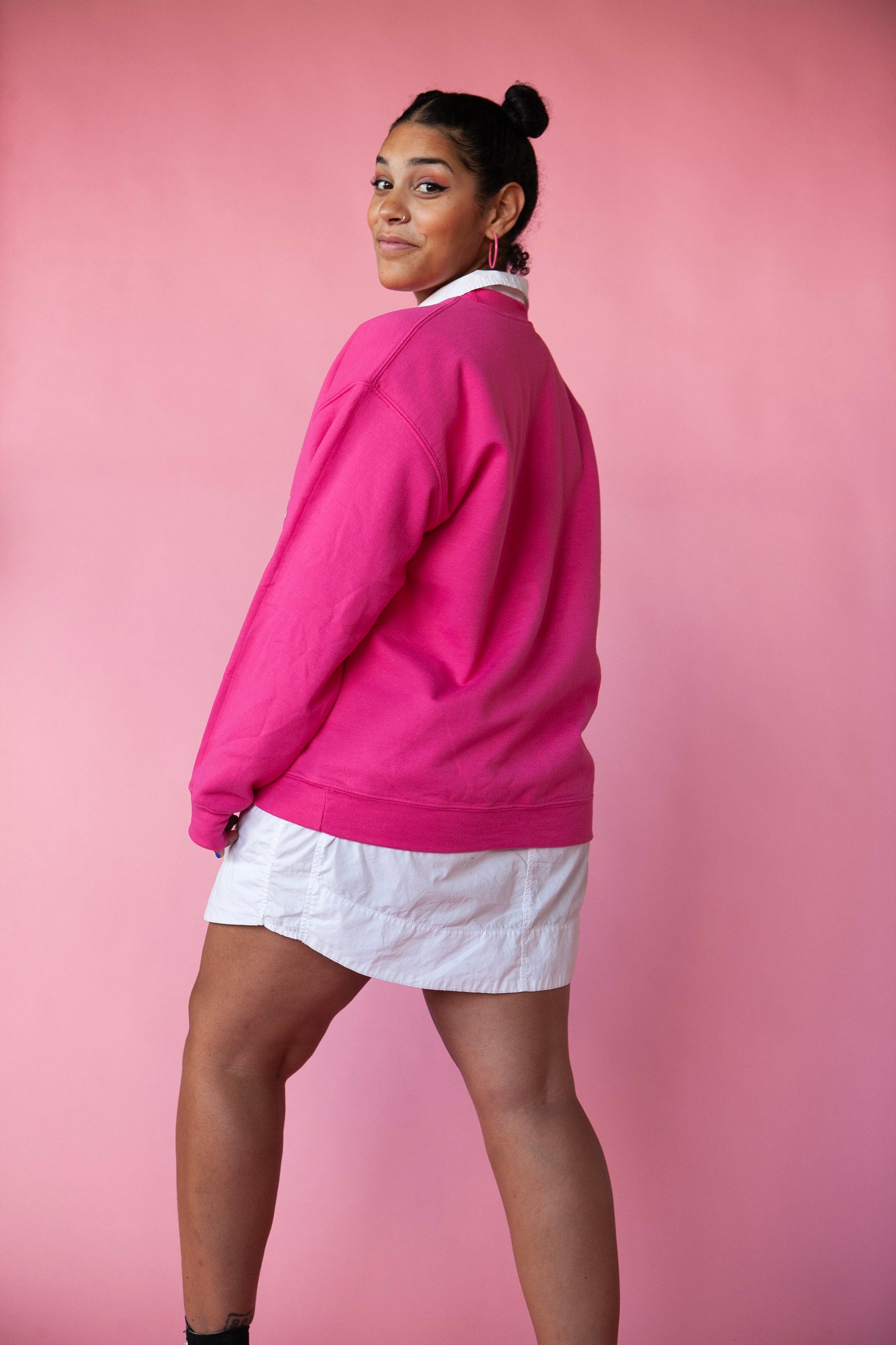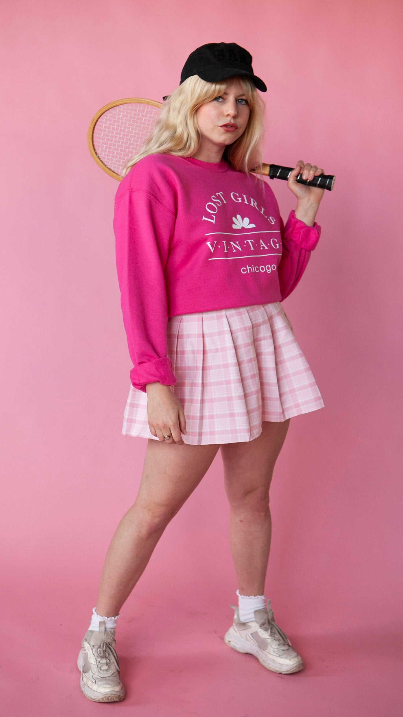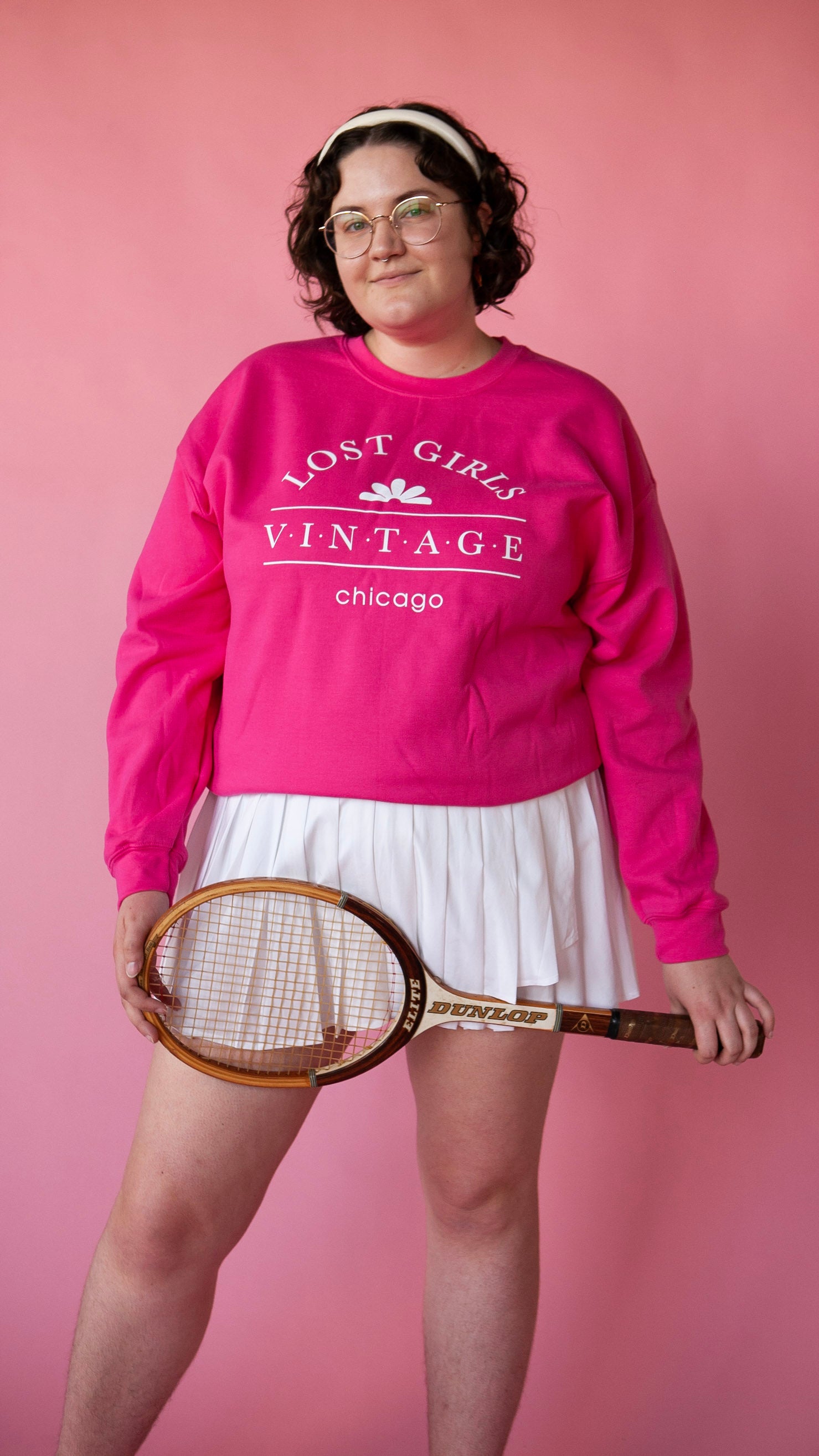 Hot pink crewneck sweatshirt with "Lost Girls Vintage Chicago" in white lettering. Design inspired by vintage sportswear. Super soft Gildan sweatshirt in sizes S-XL.