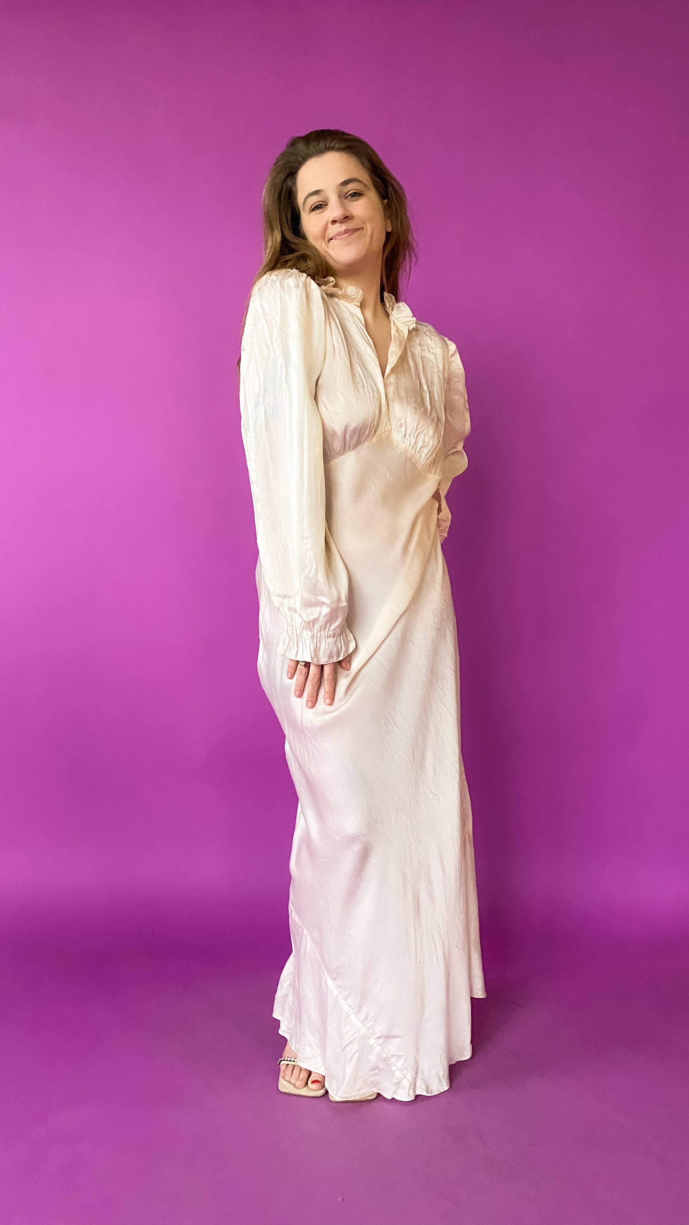 Simple ivory floor length gown with v neck empire waist that has slight asymmetrical flaring at the bottom. Ruffle details along neckline and wrists. Ribbon tie attached to the bust.