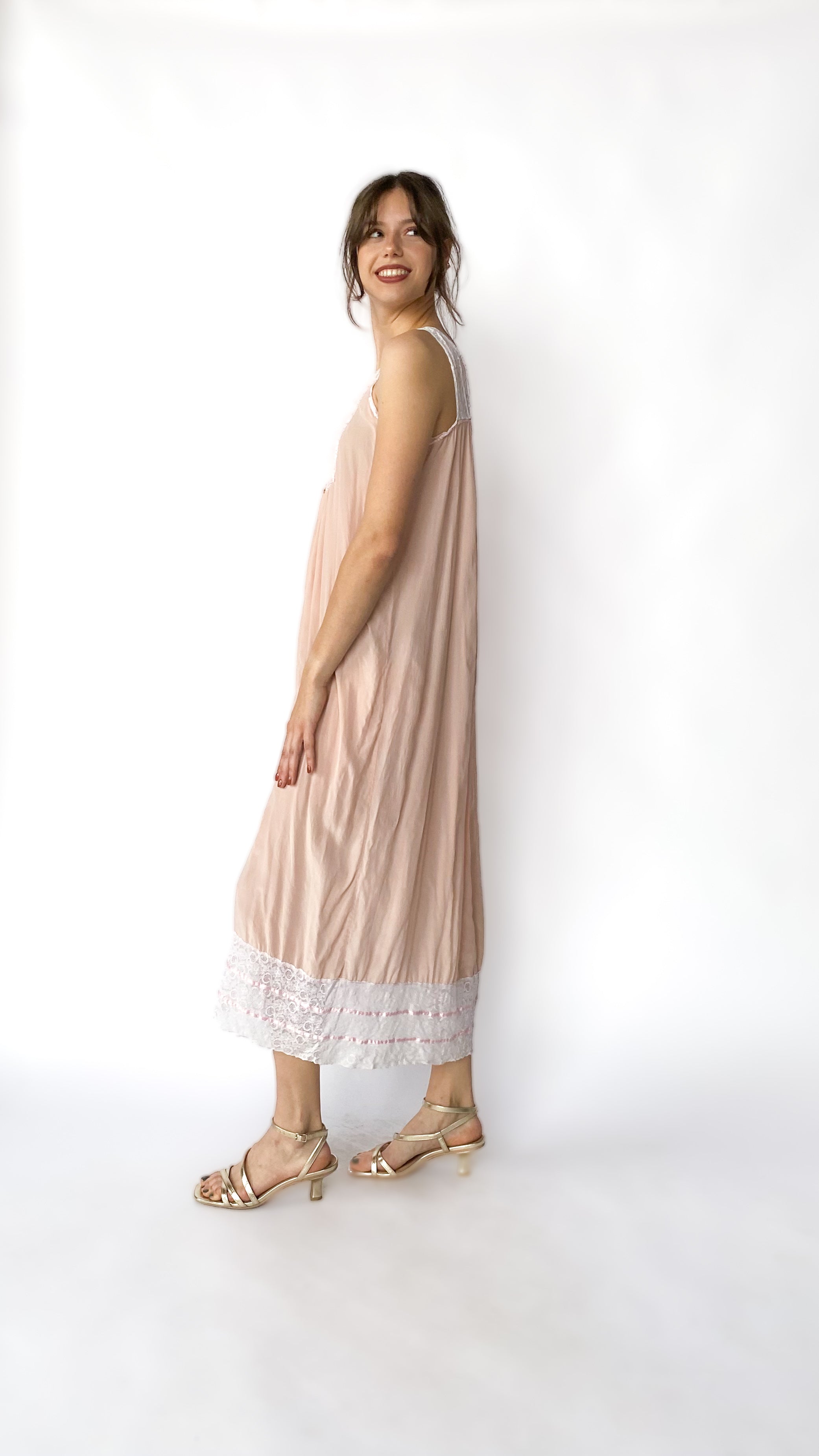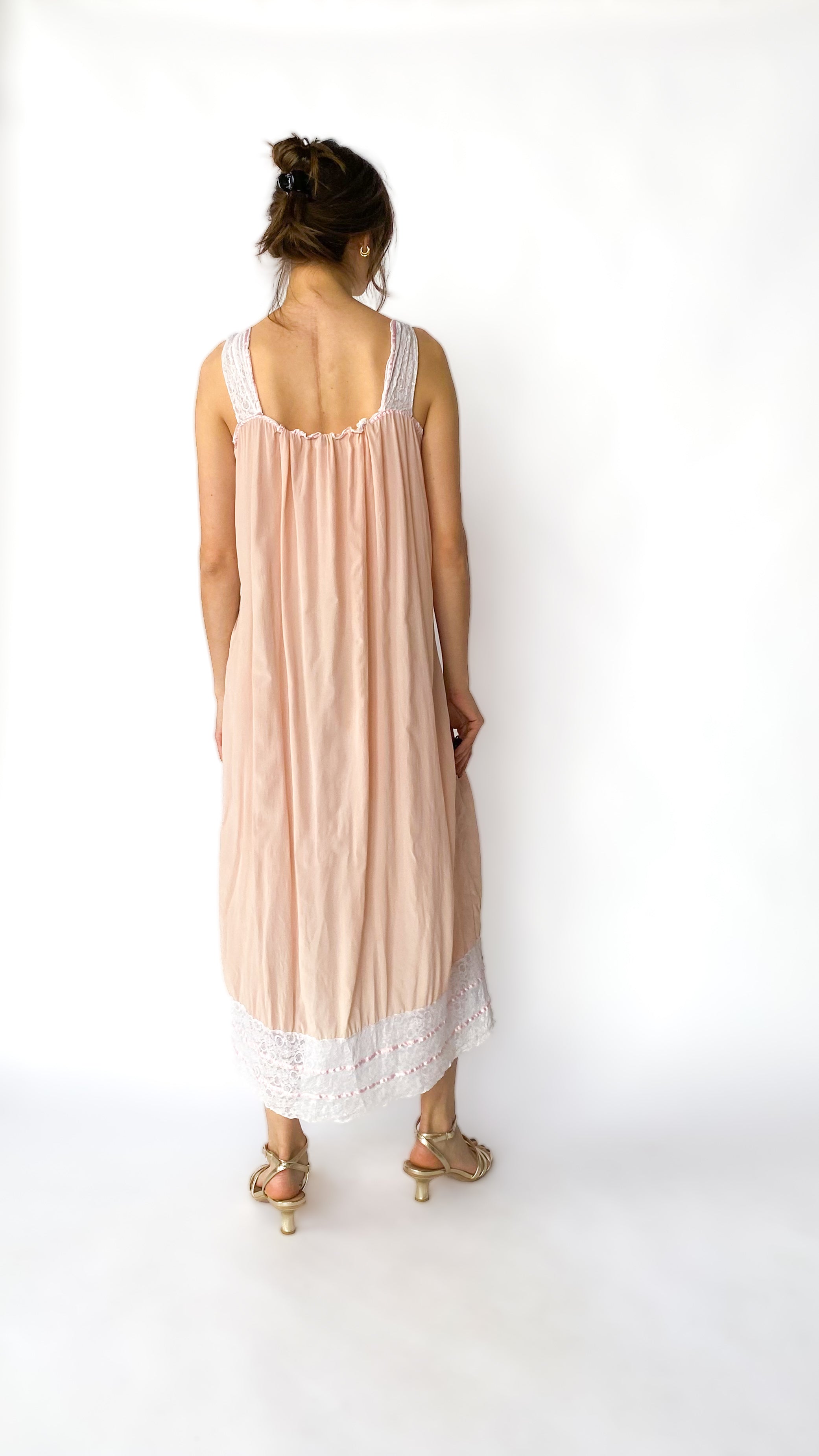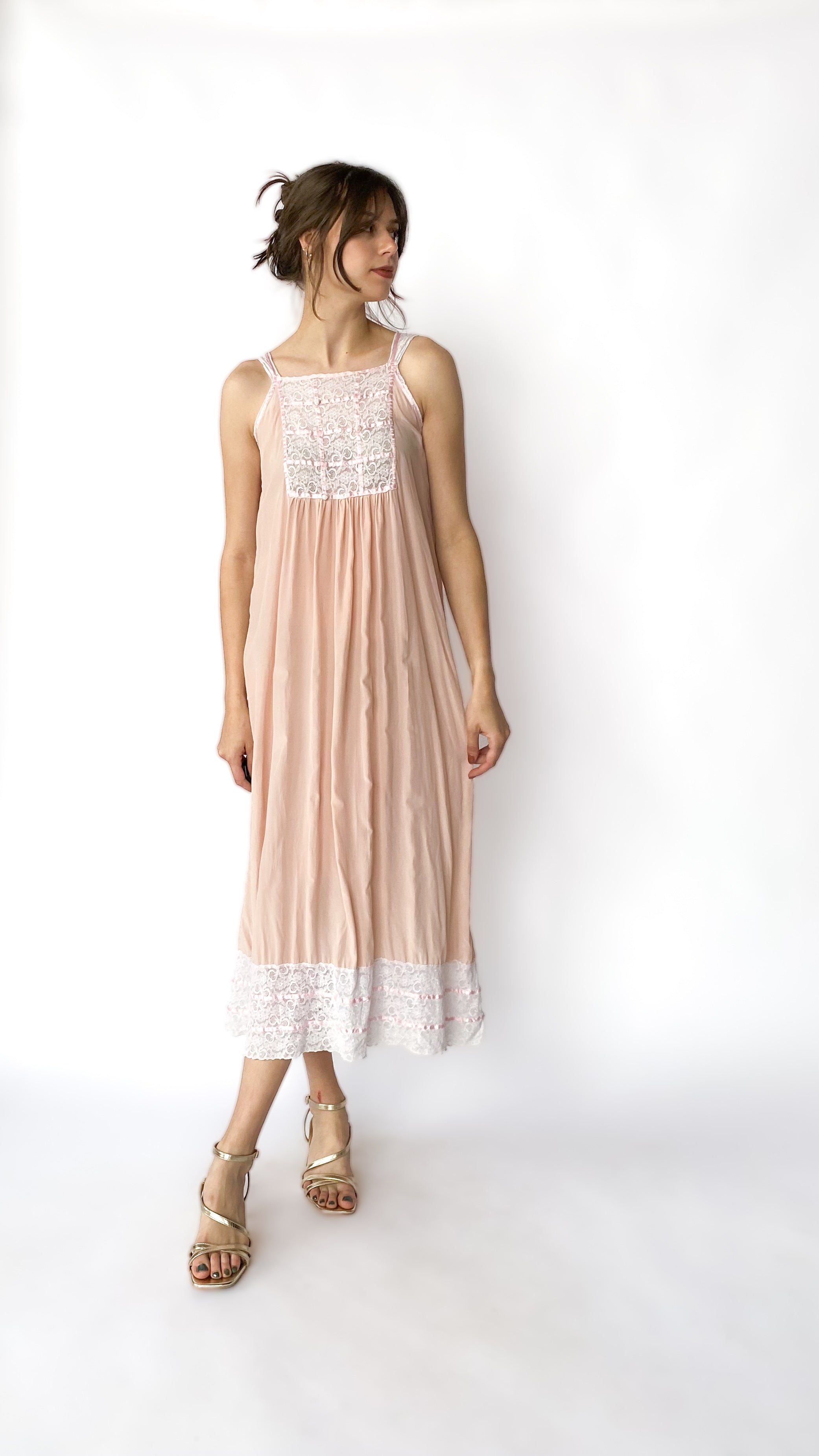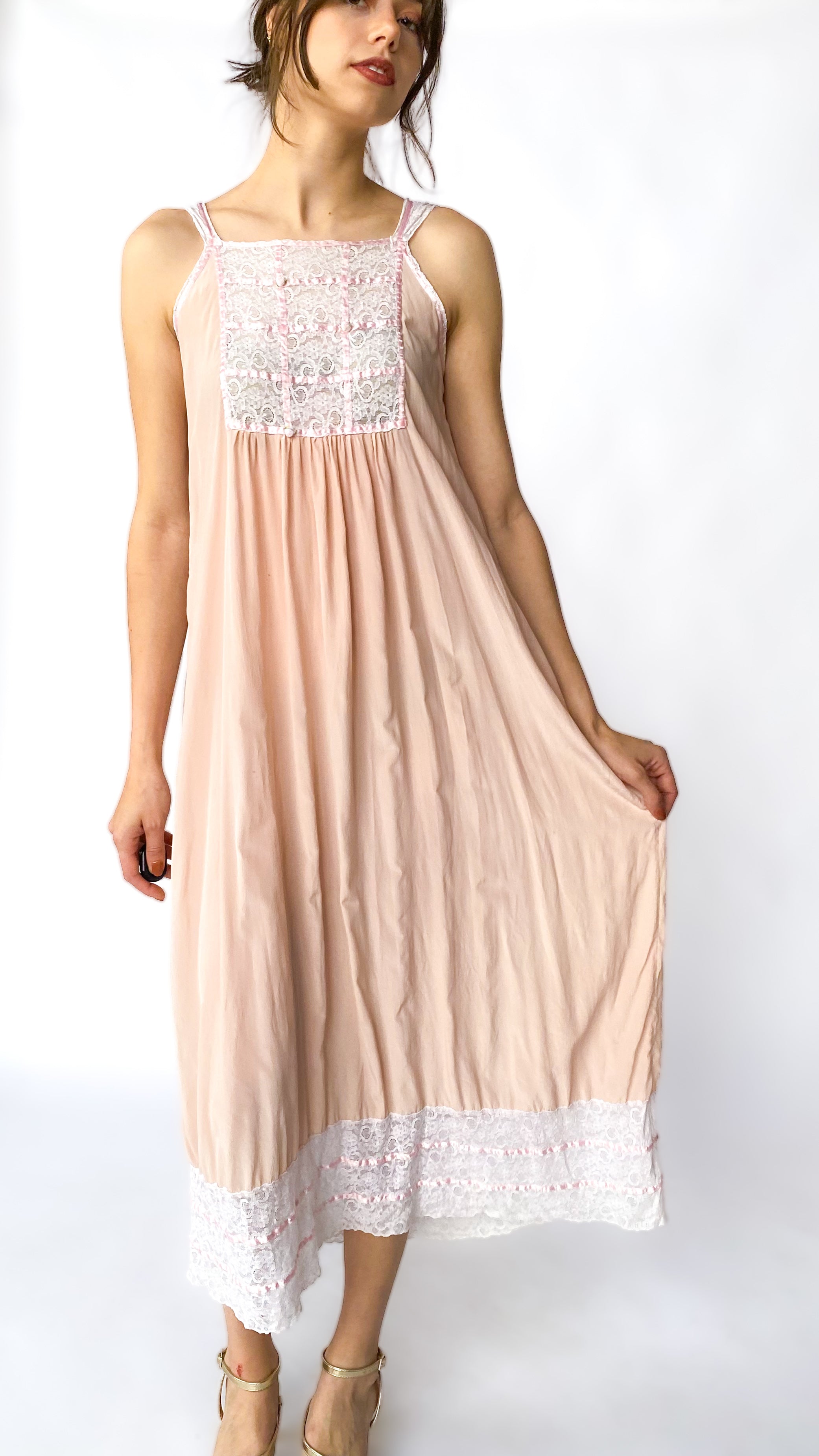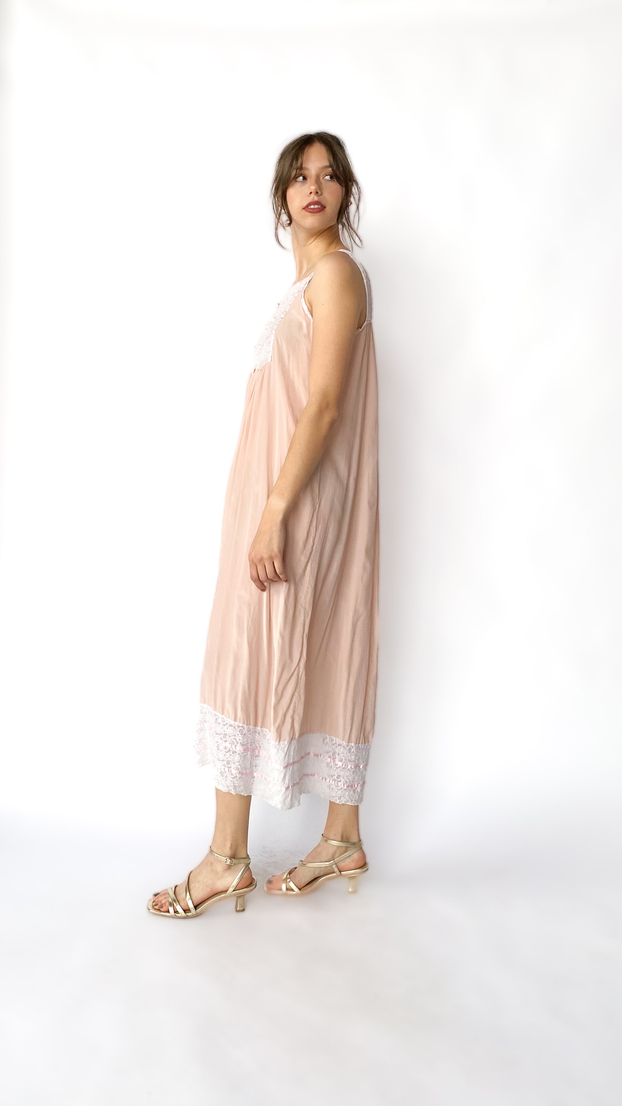 Light peach silk maxi dress with ivory lace panel in front. Has pink ribbon trim & rosette detailing. Hem has lace trim.