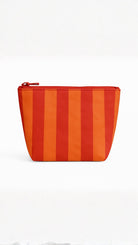 Orange and red preppy stripes on a sustainable tyvek outer fabric with waterproof lining on the inside. Resin zipper w/ gold pull.