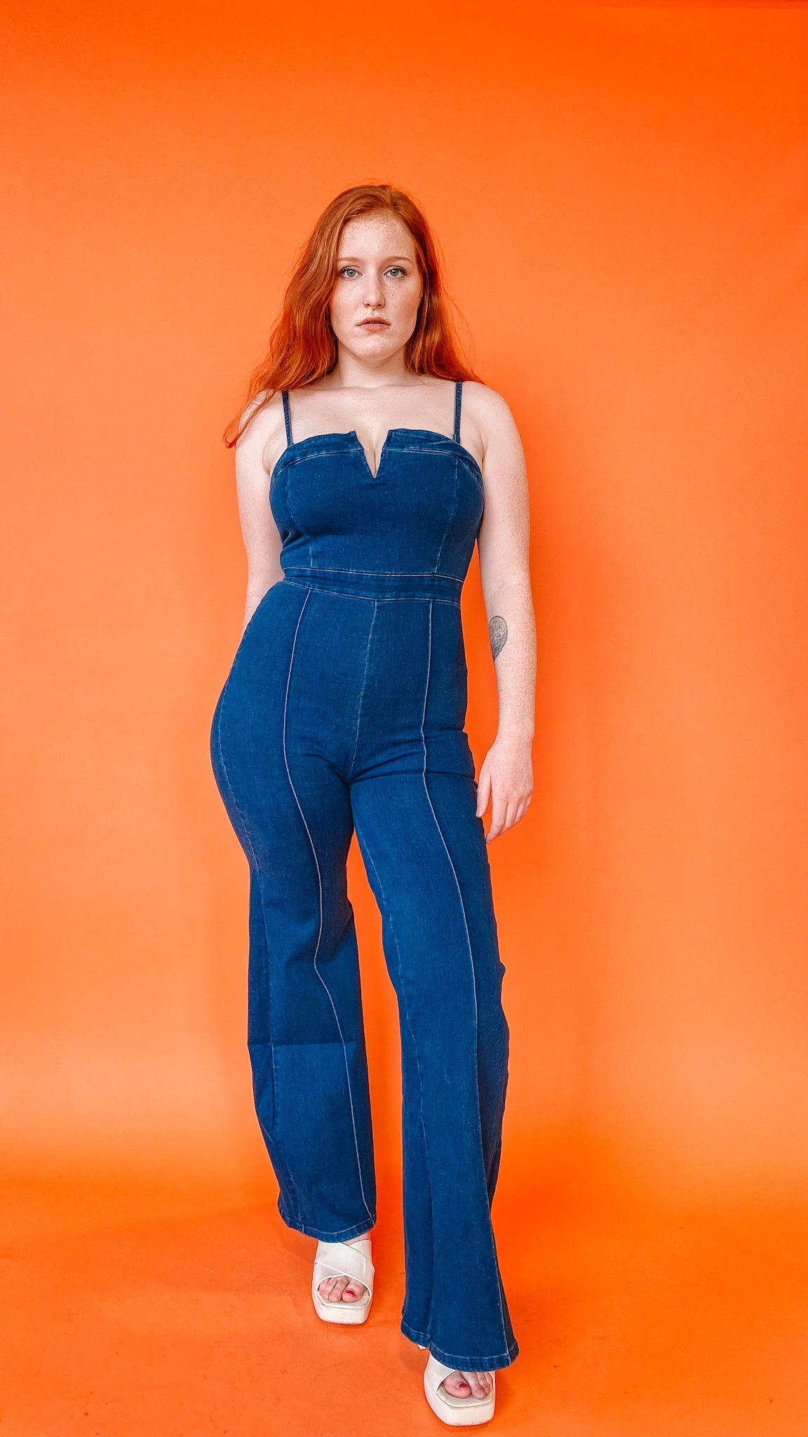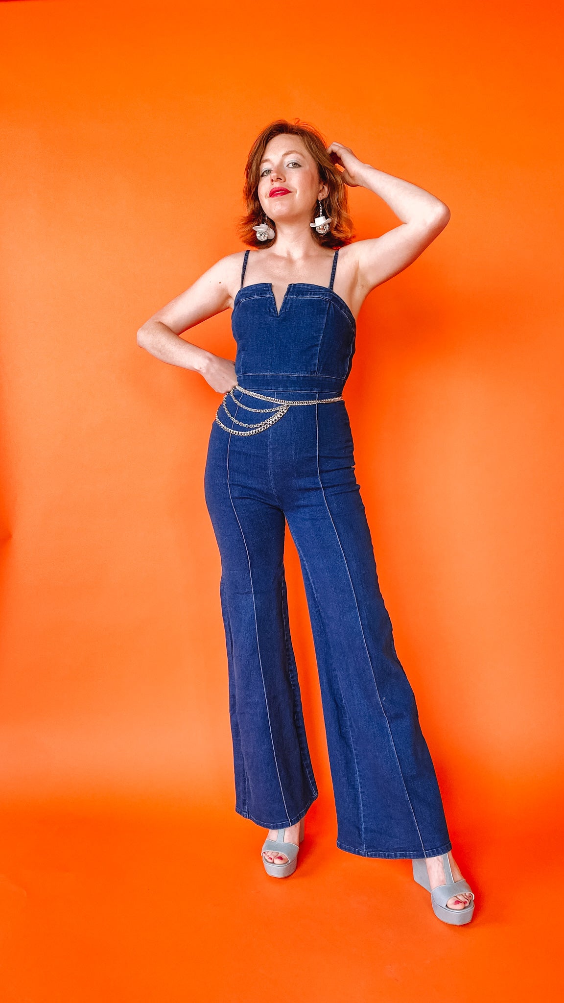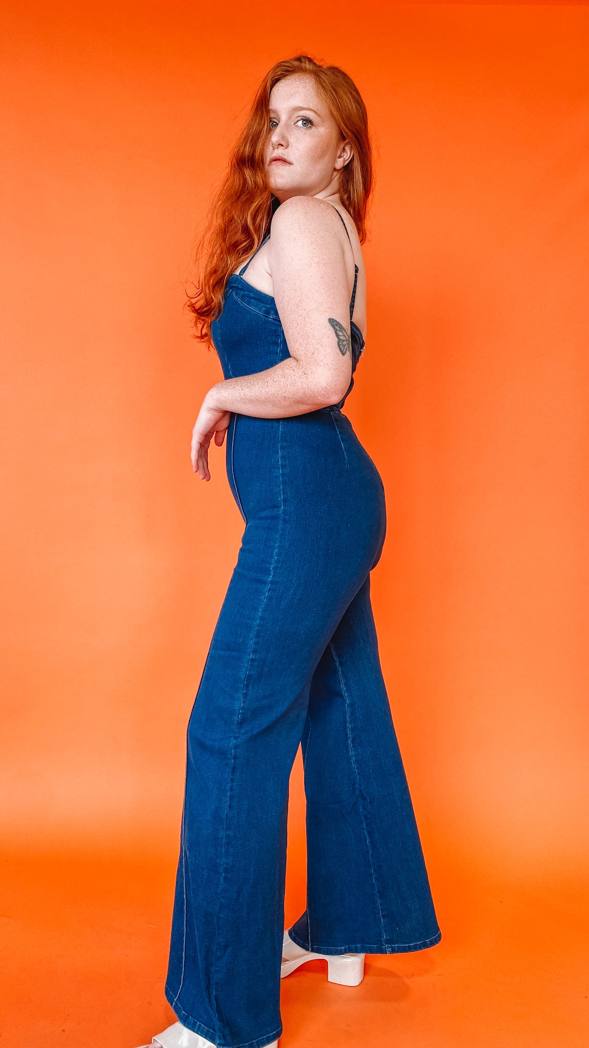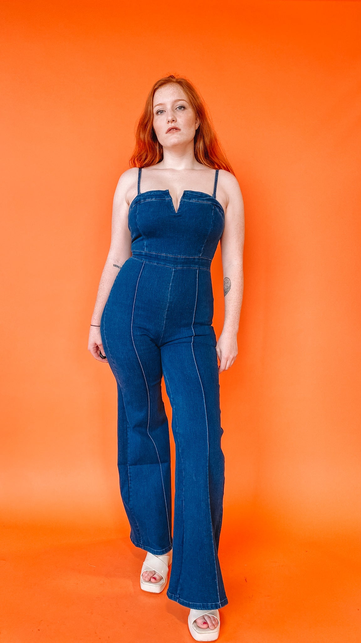 A vintage-inspired denim jumpsuit featuring straight neckline with V opening detail, adjustable spaghetti straps, flare leg with seam at center front and back zipper closure. Stretchy material.