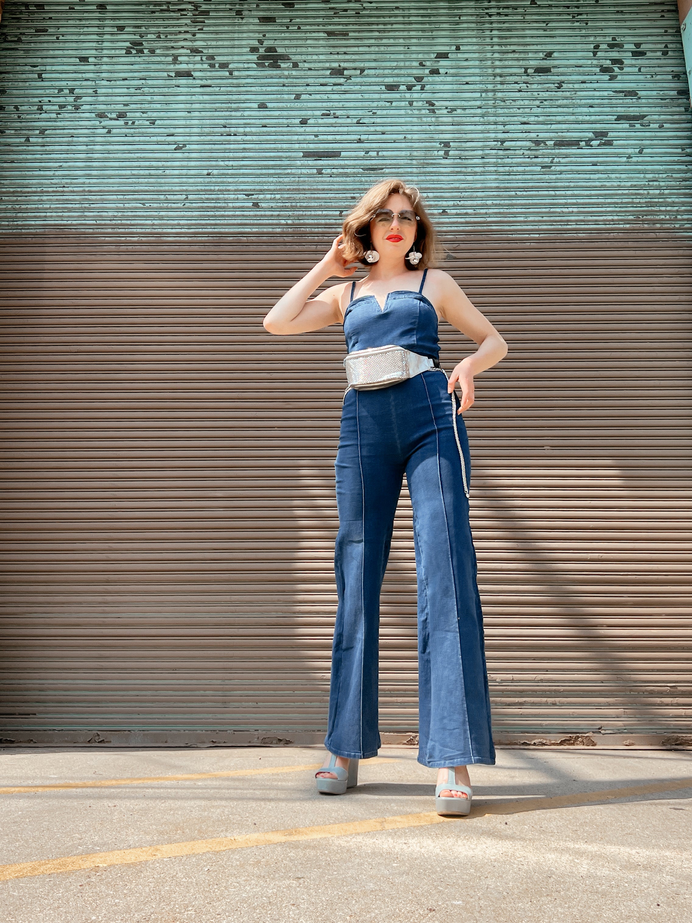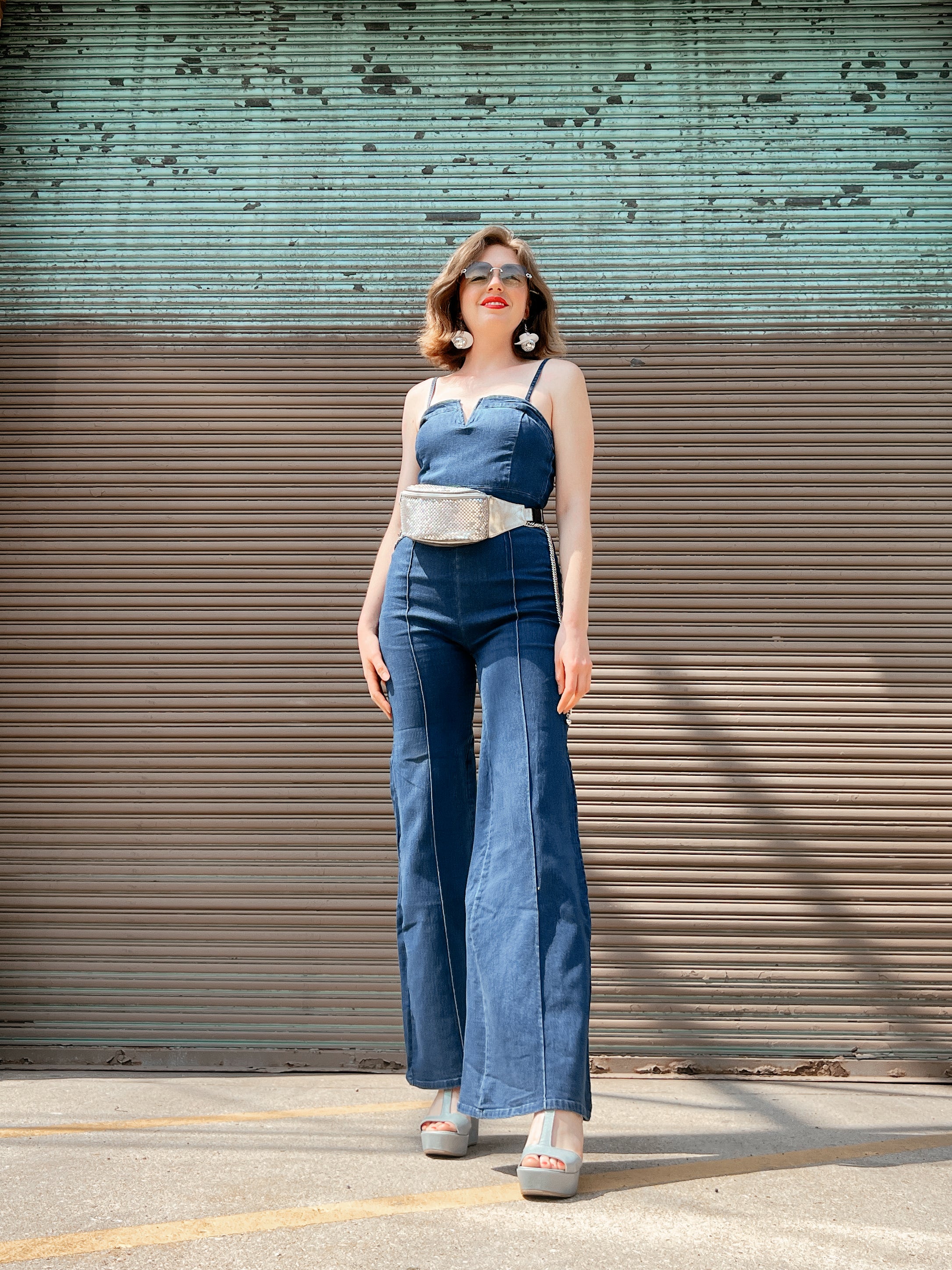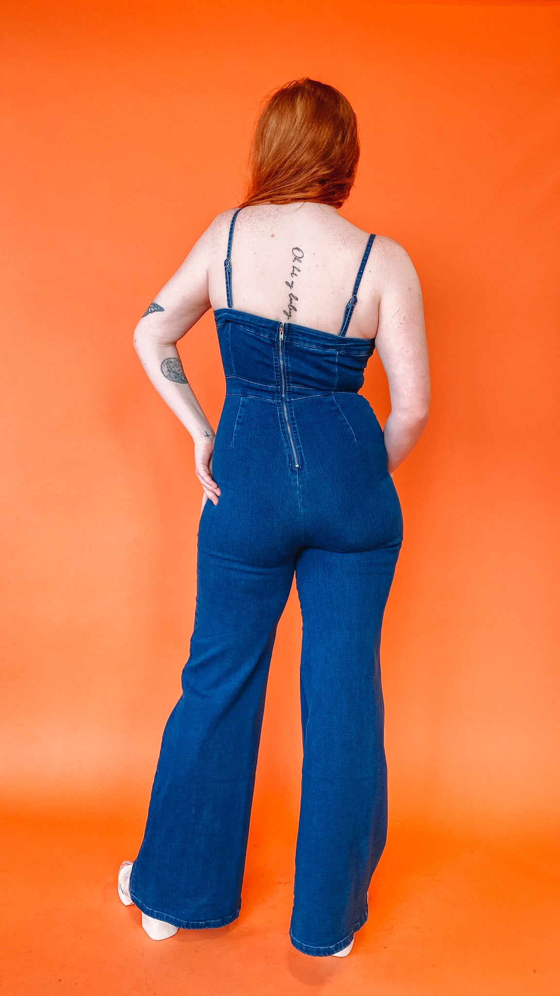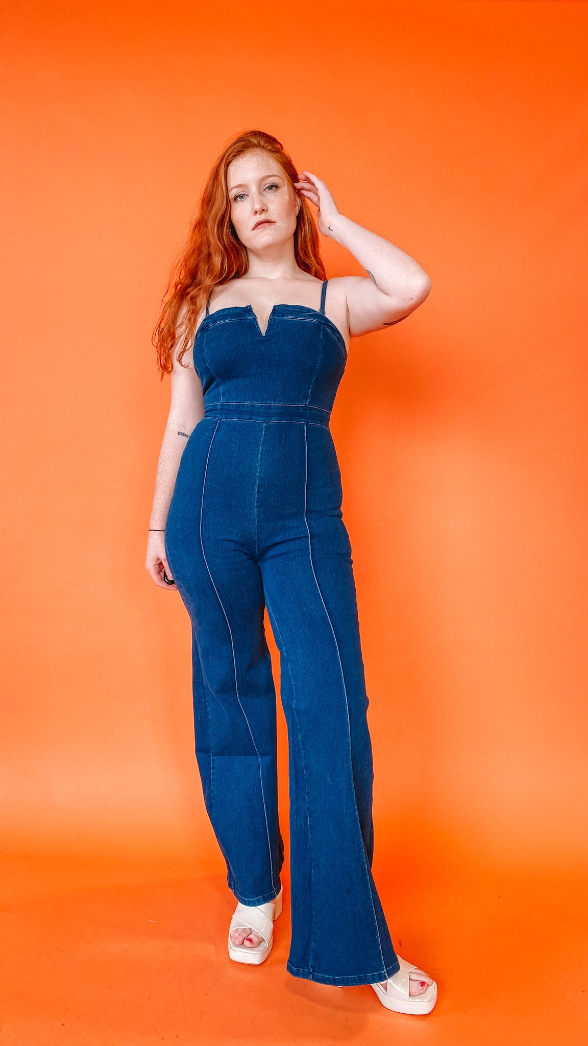 A vintage-inspired denim jumpsuit featuring straight neckline with V opening detail, adjustable spaghetti straps, flare leg with seam at center front and back zipper closure. Stretchy material.