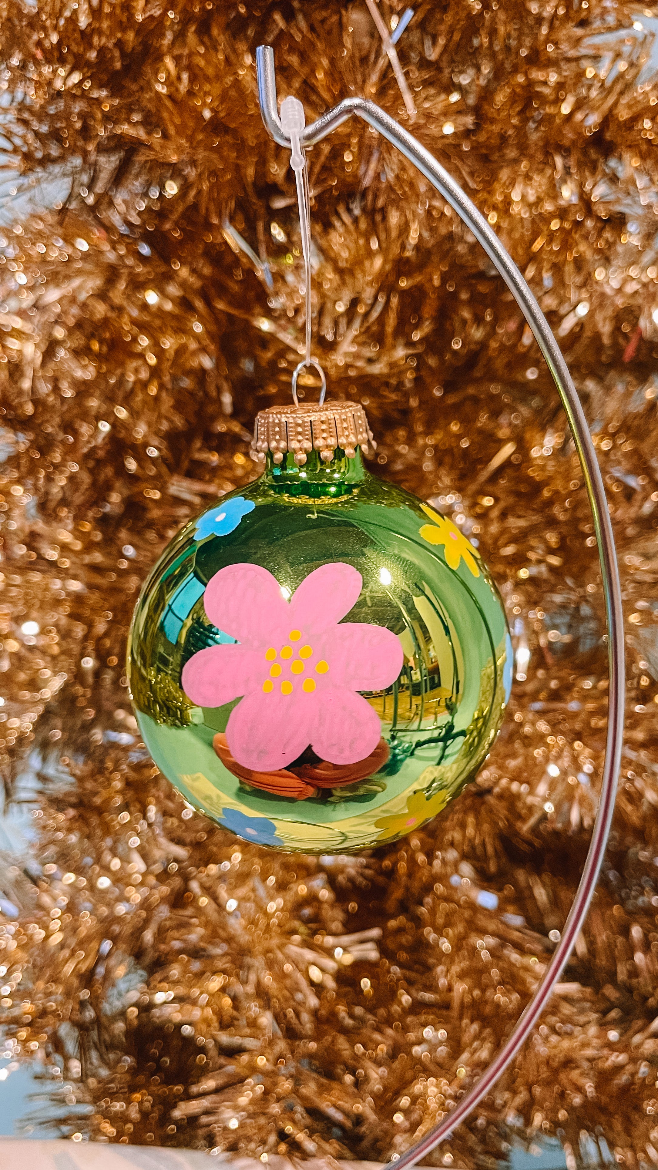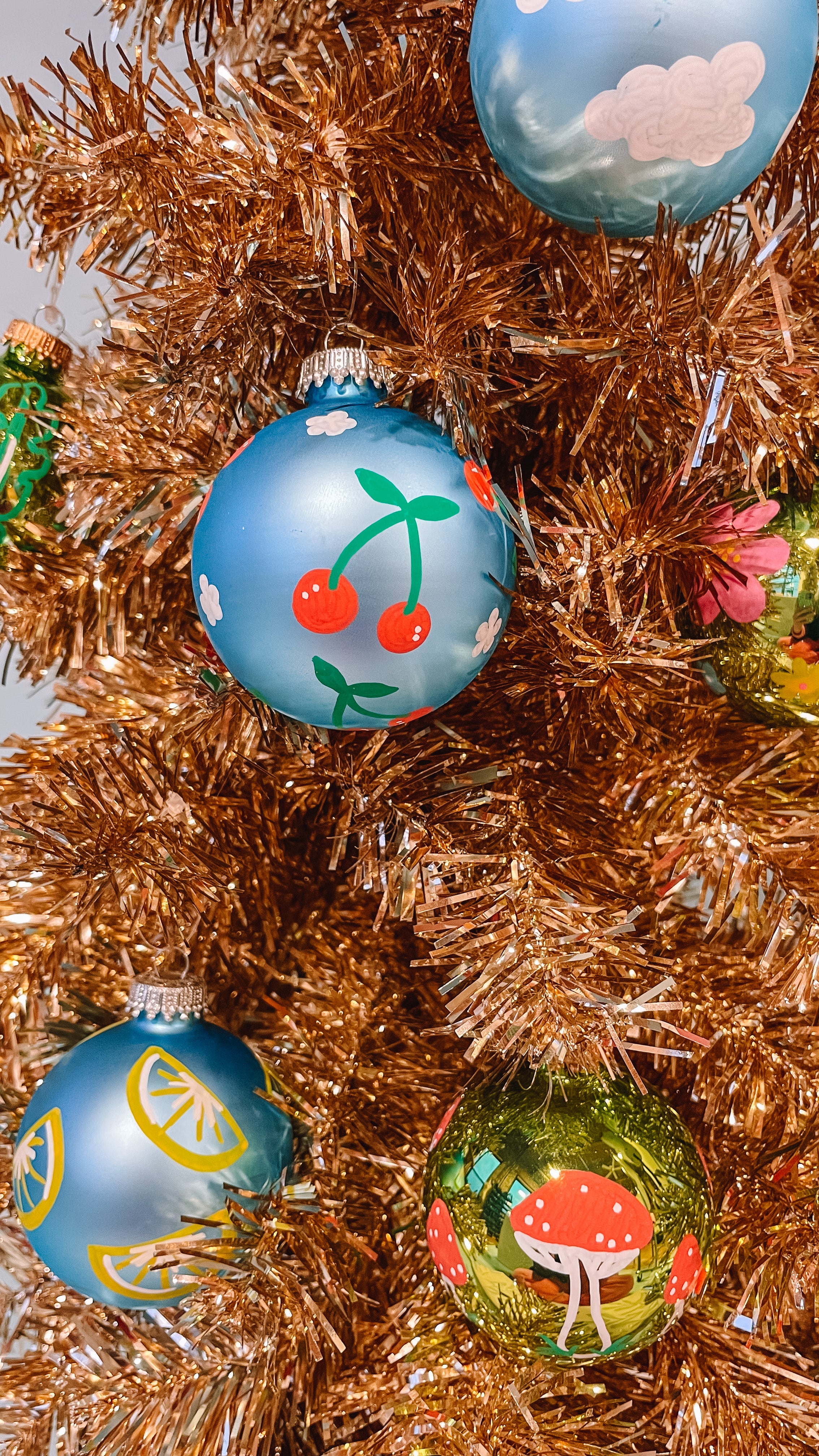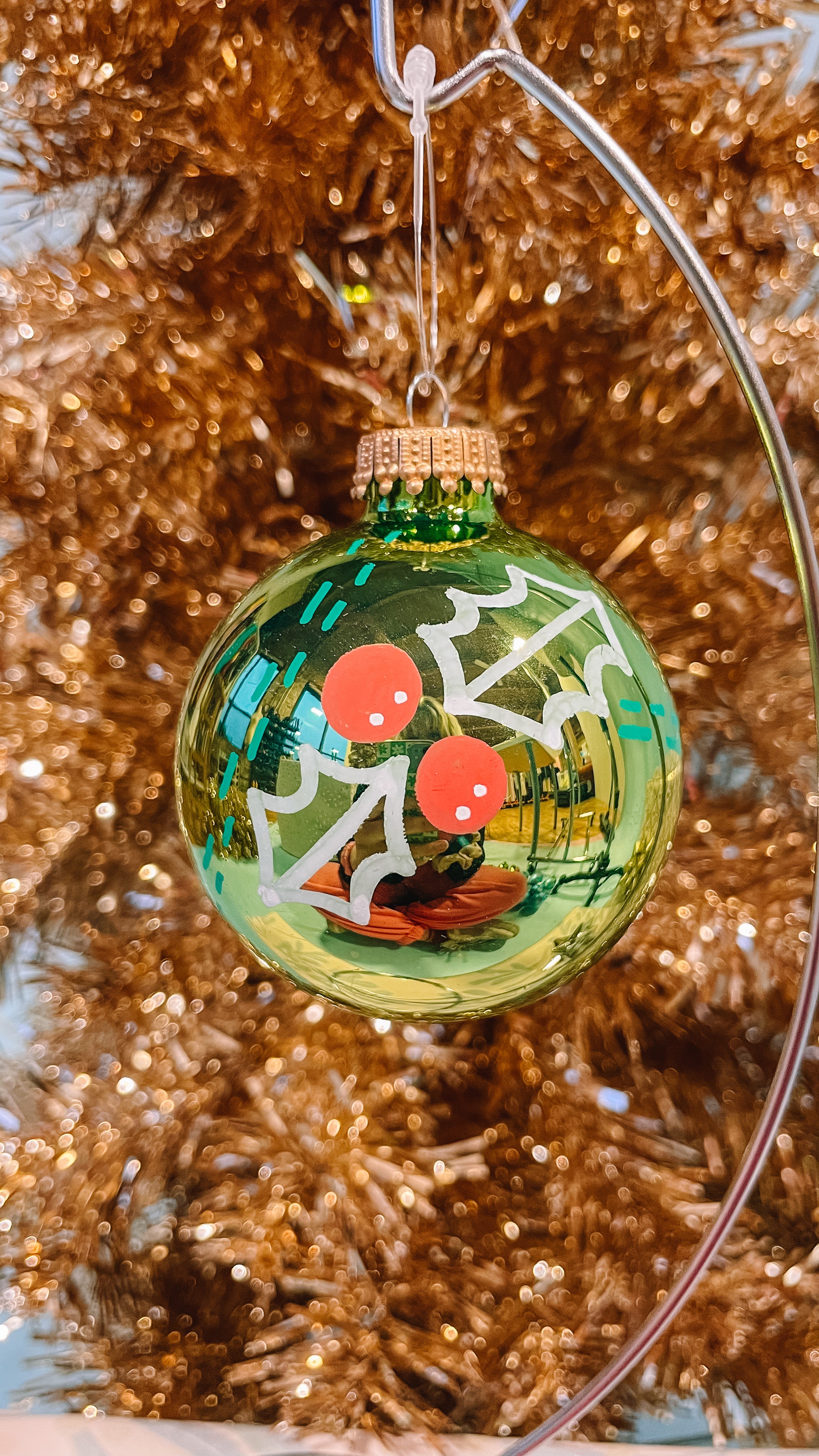 Spherical ornaments in reflective green and matte blue with various colorful designs hand-painted by our team in our Chicago studio.