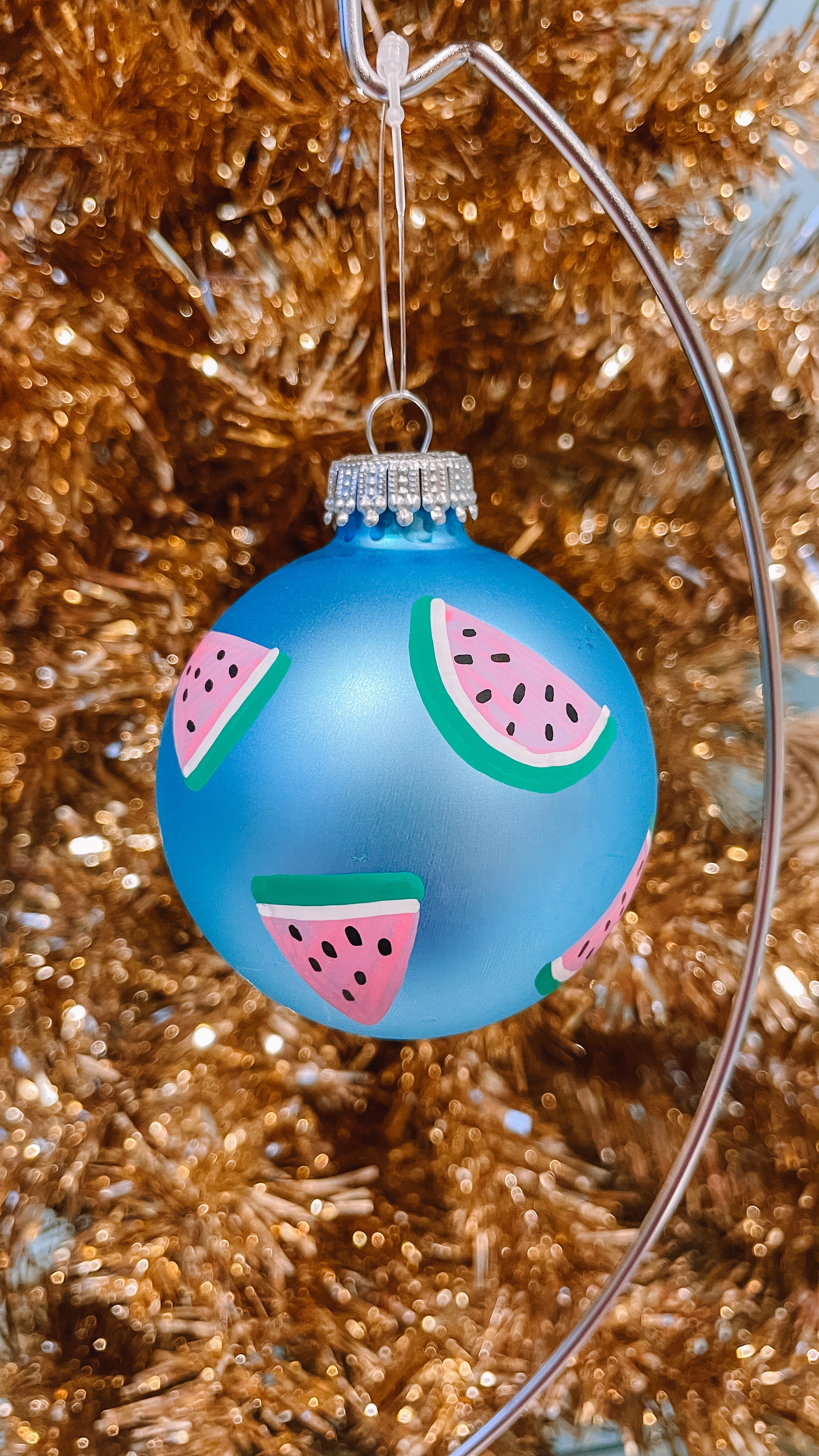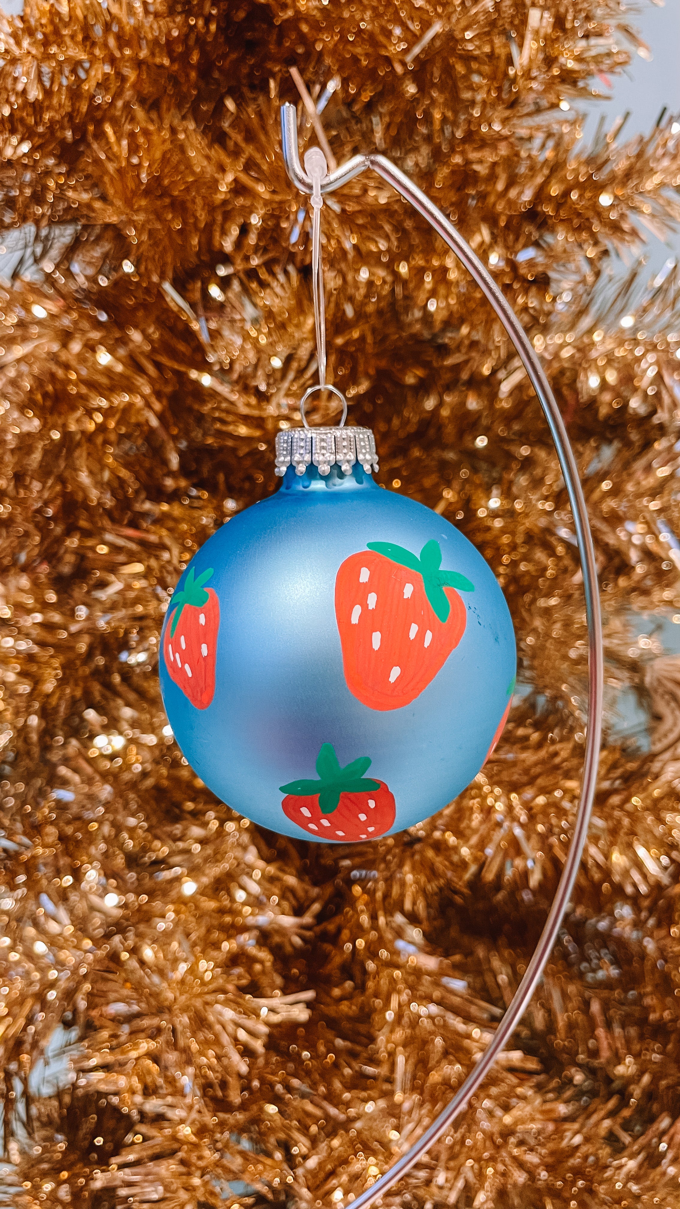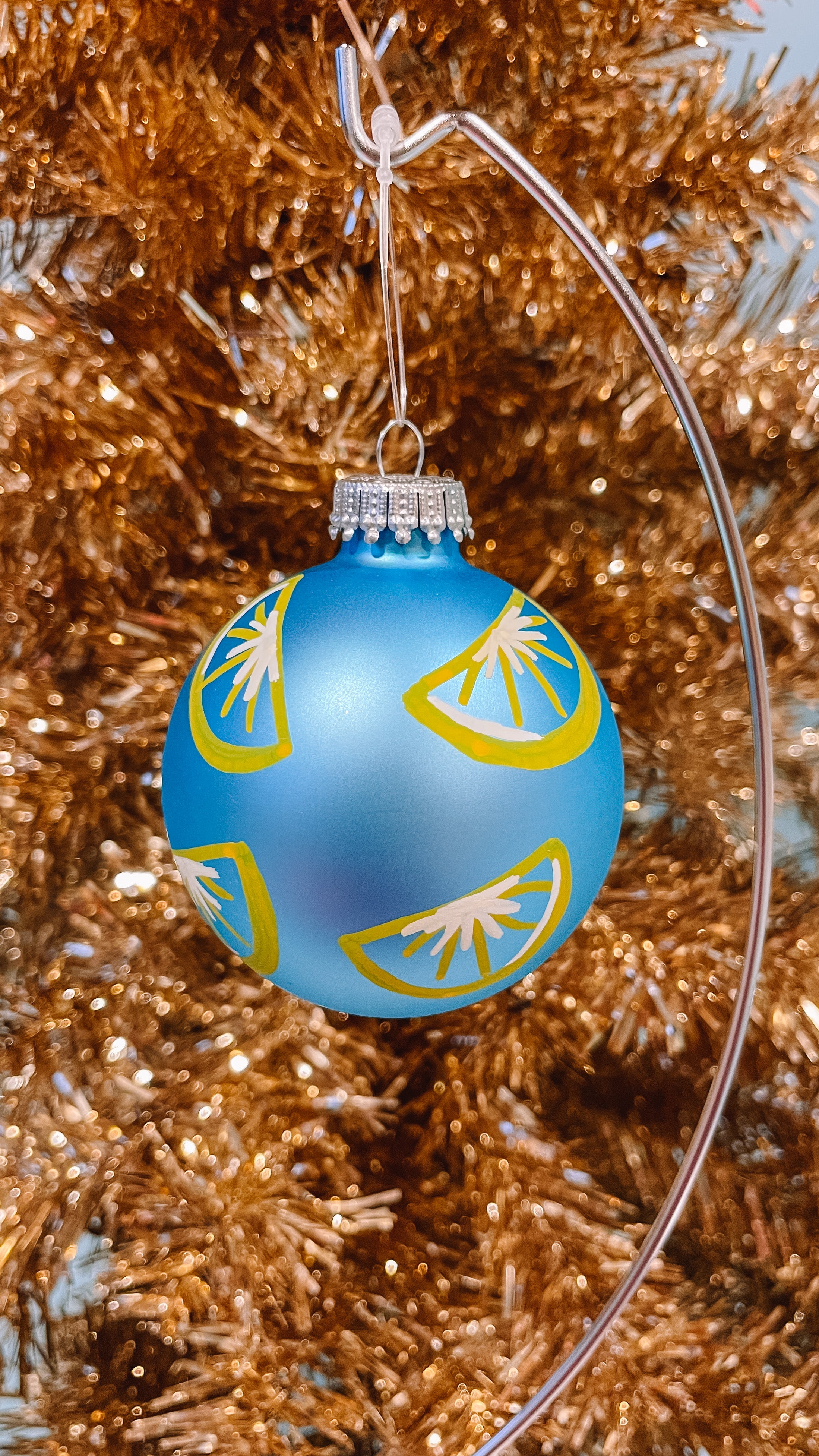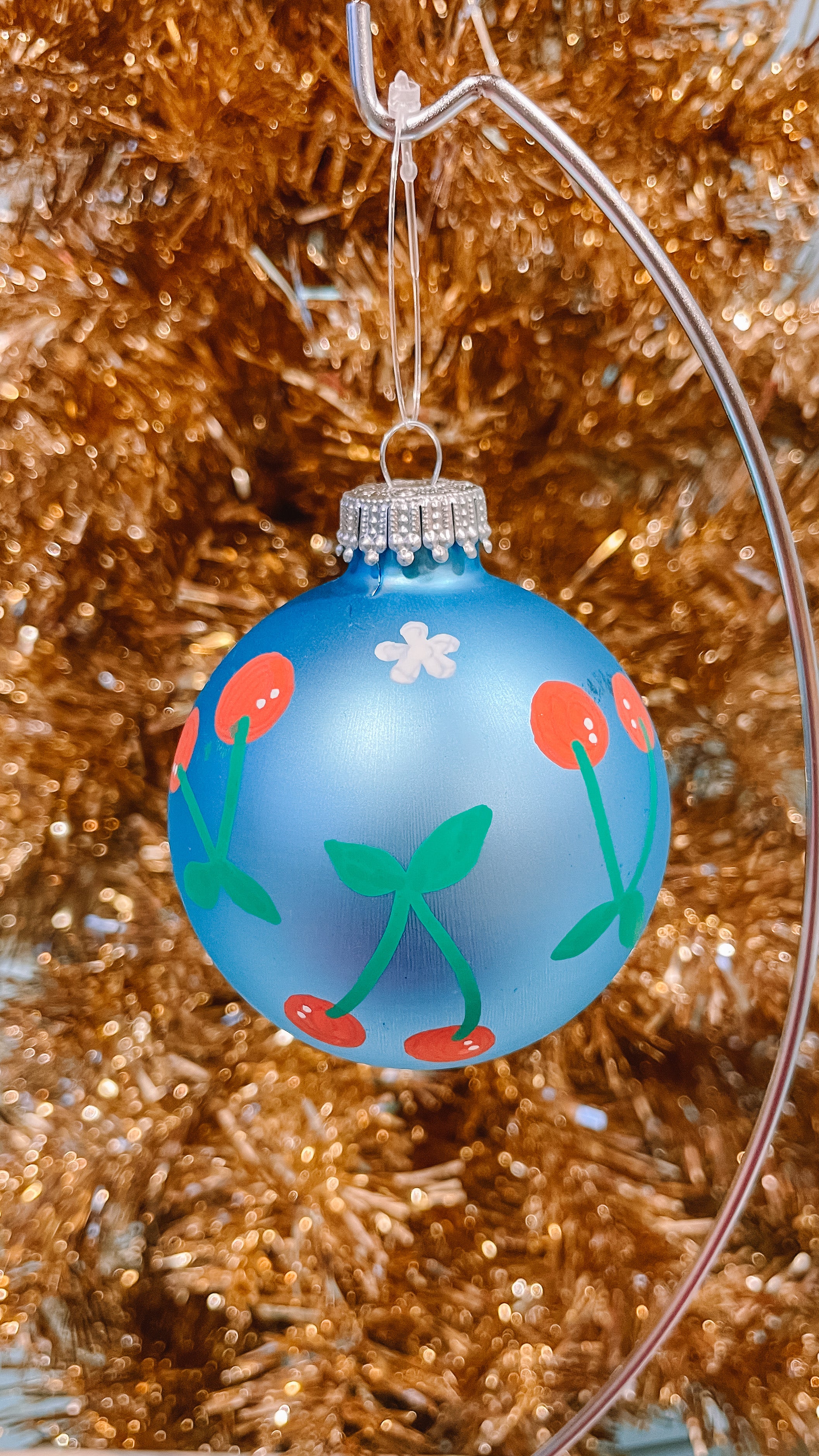 Spherical ornaments in reflective green and matte blue with various colorful designs hand-painted by our team in our Chicago studio.