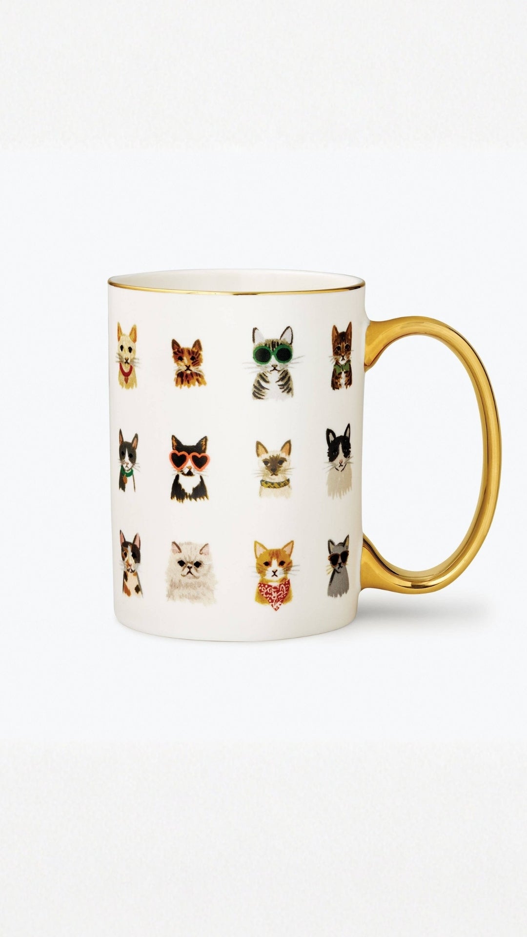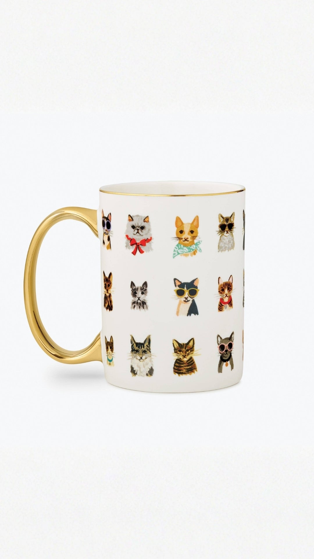Feline friends rocking their favorite accessories. Celebrate your favorite cat every morning with our Cool Cats mug. Our porcelain mugs feature illustrated designs and a gilded rim and handle to add a little something special to your favorite beverage. DETAILS - 4.5" L × 3.125" W - Porcelain - Full-color illustration with metallic gold accents - 16 oz. - Not microwave safe - Hand wash