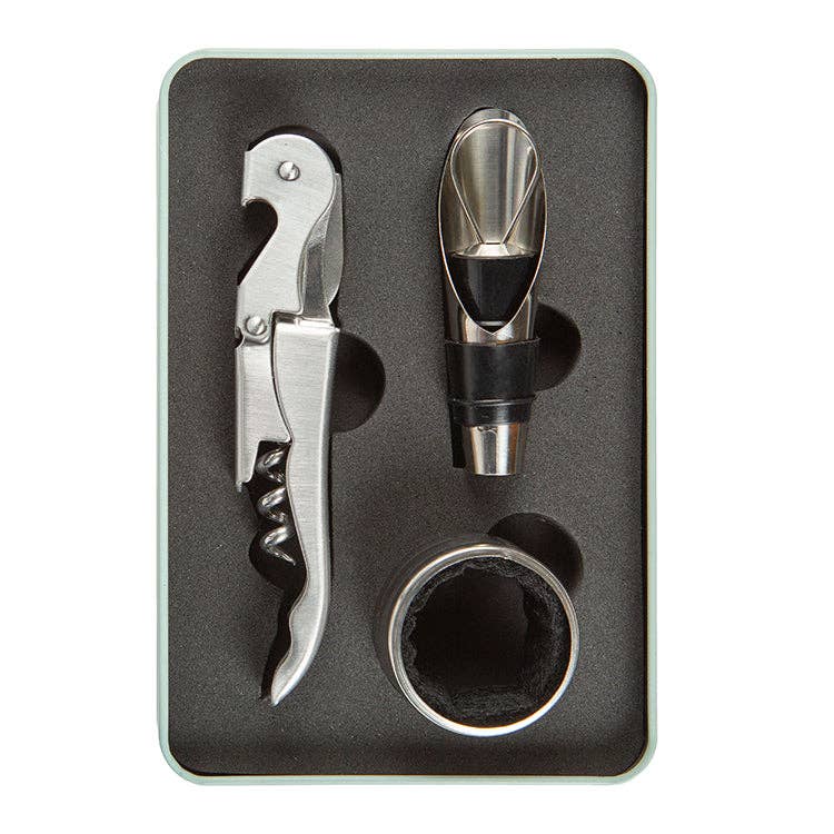 A complete set of wine tools in a sleek tin: corkscrew, pourer, stopper, and drip ring.