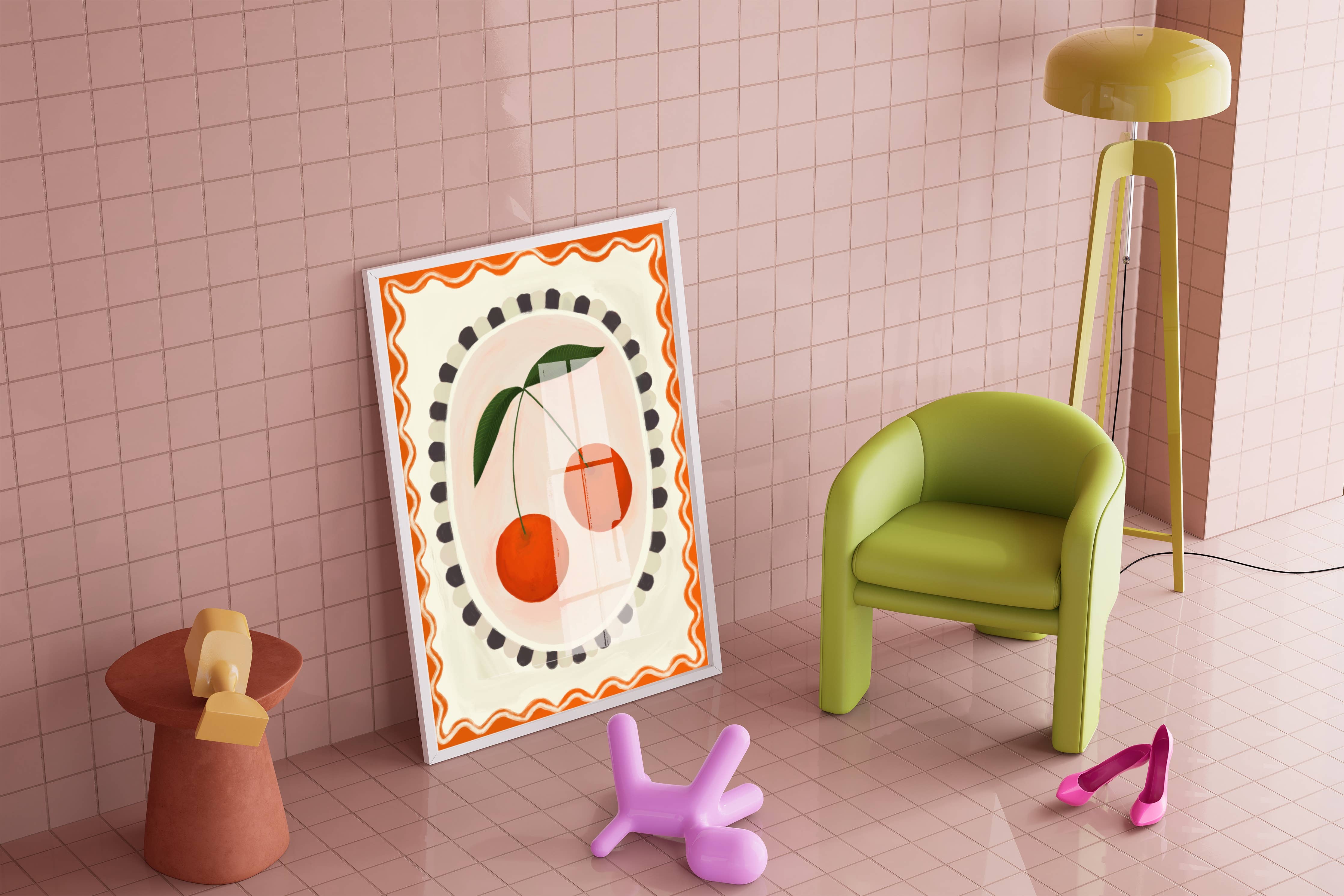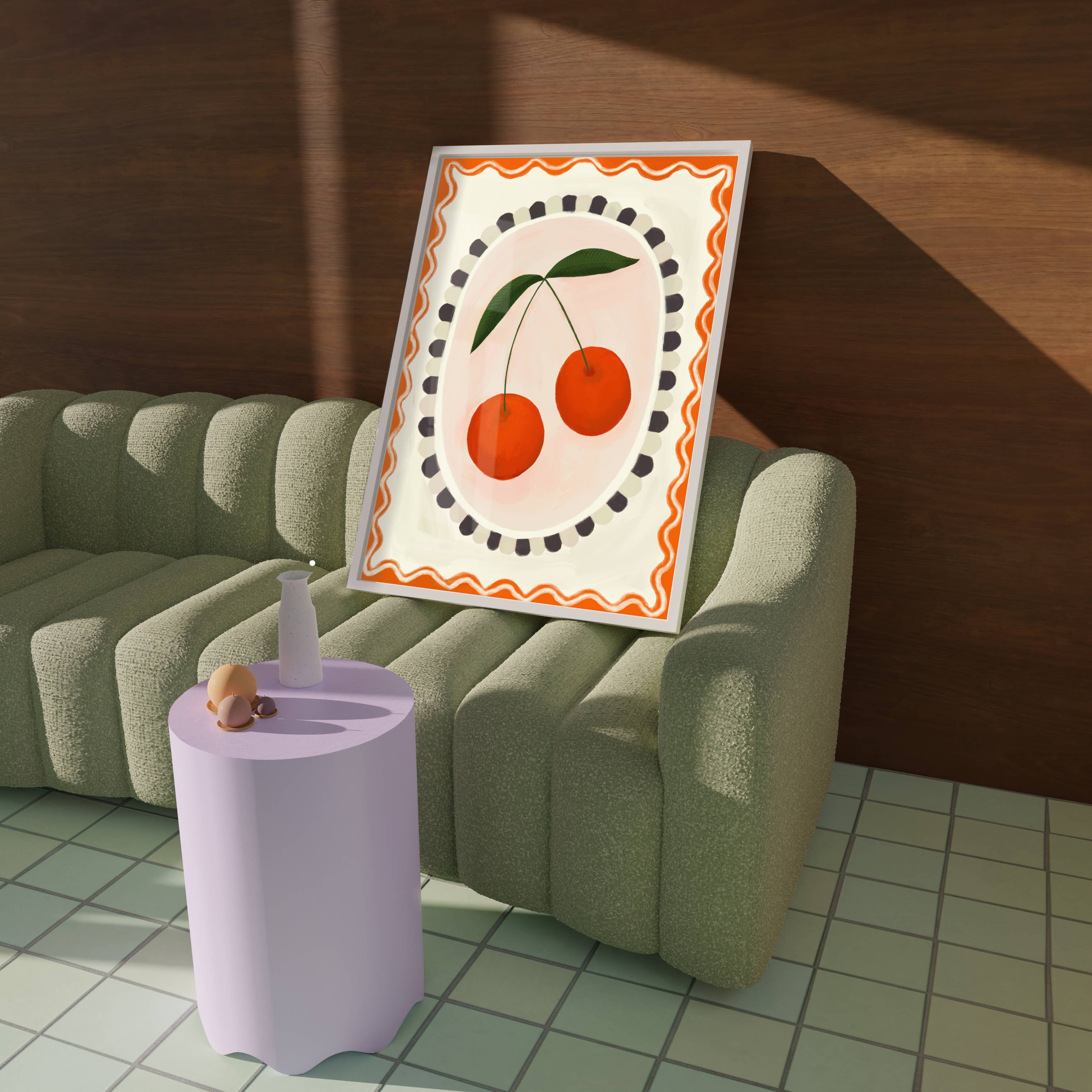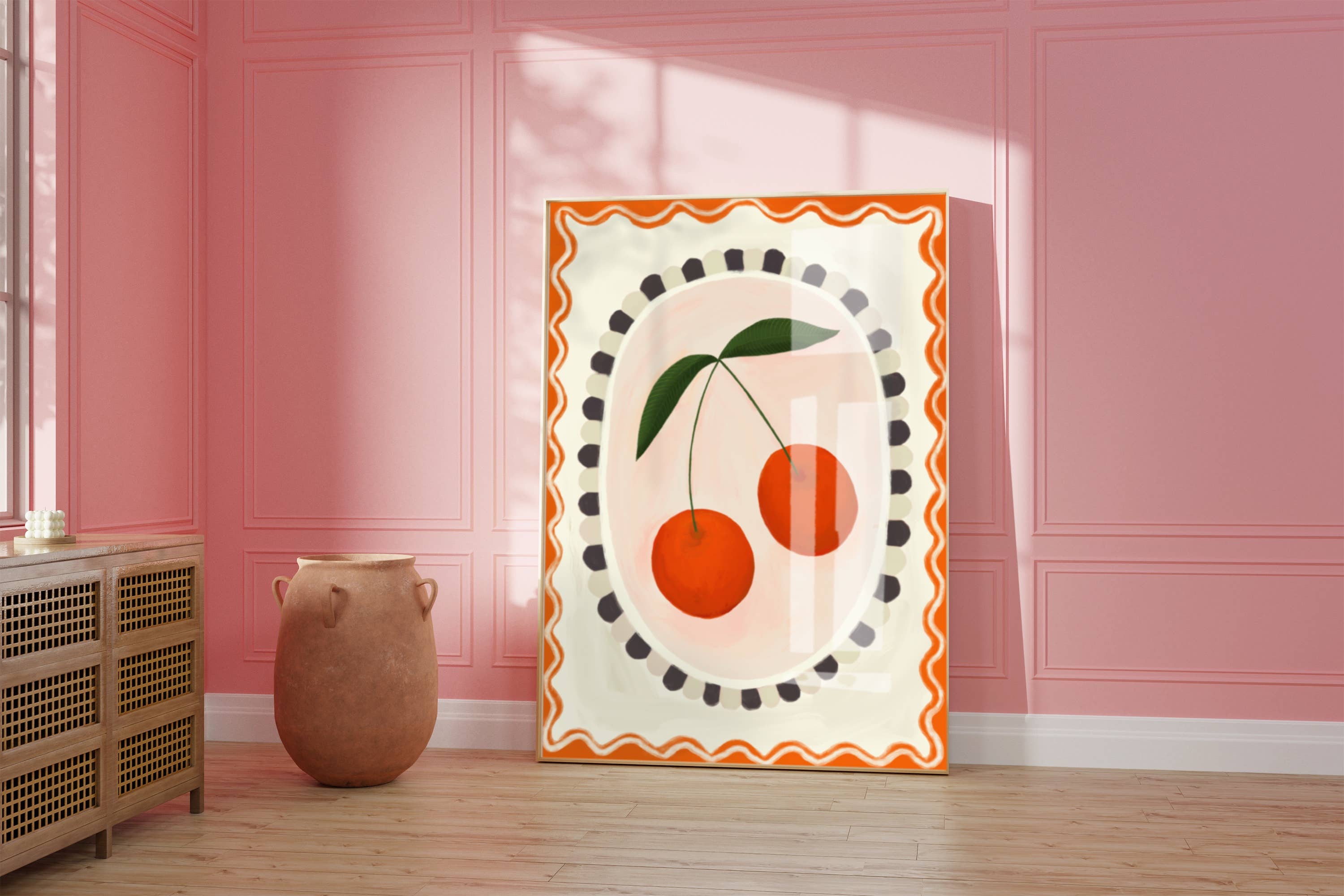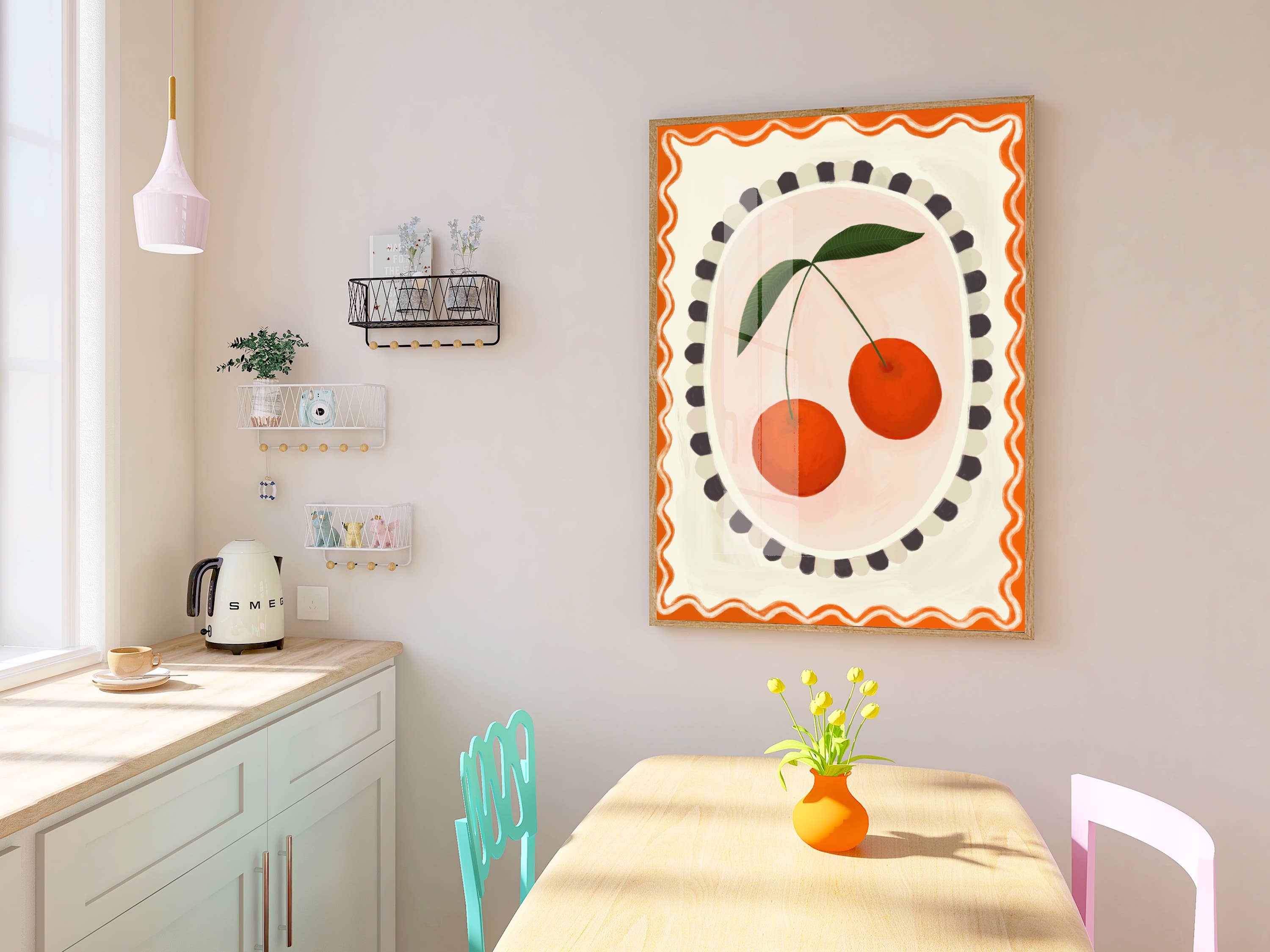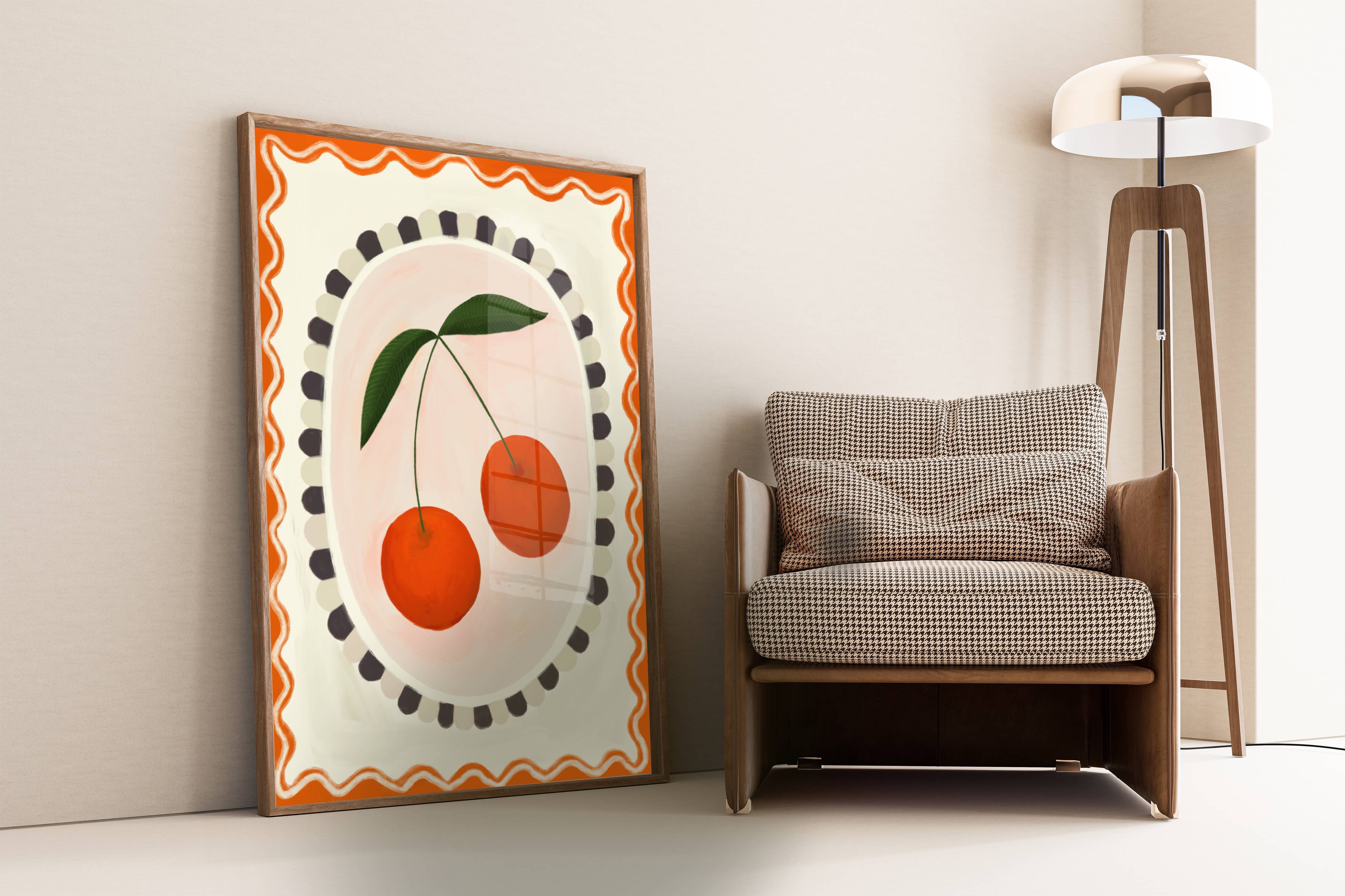 Hand drawn art print of cherry with scalloped frame border. Printed on 350gsm FSC-certified paper from sustainable sources. Packaged inside a biodegradable bag.