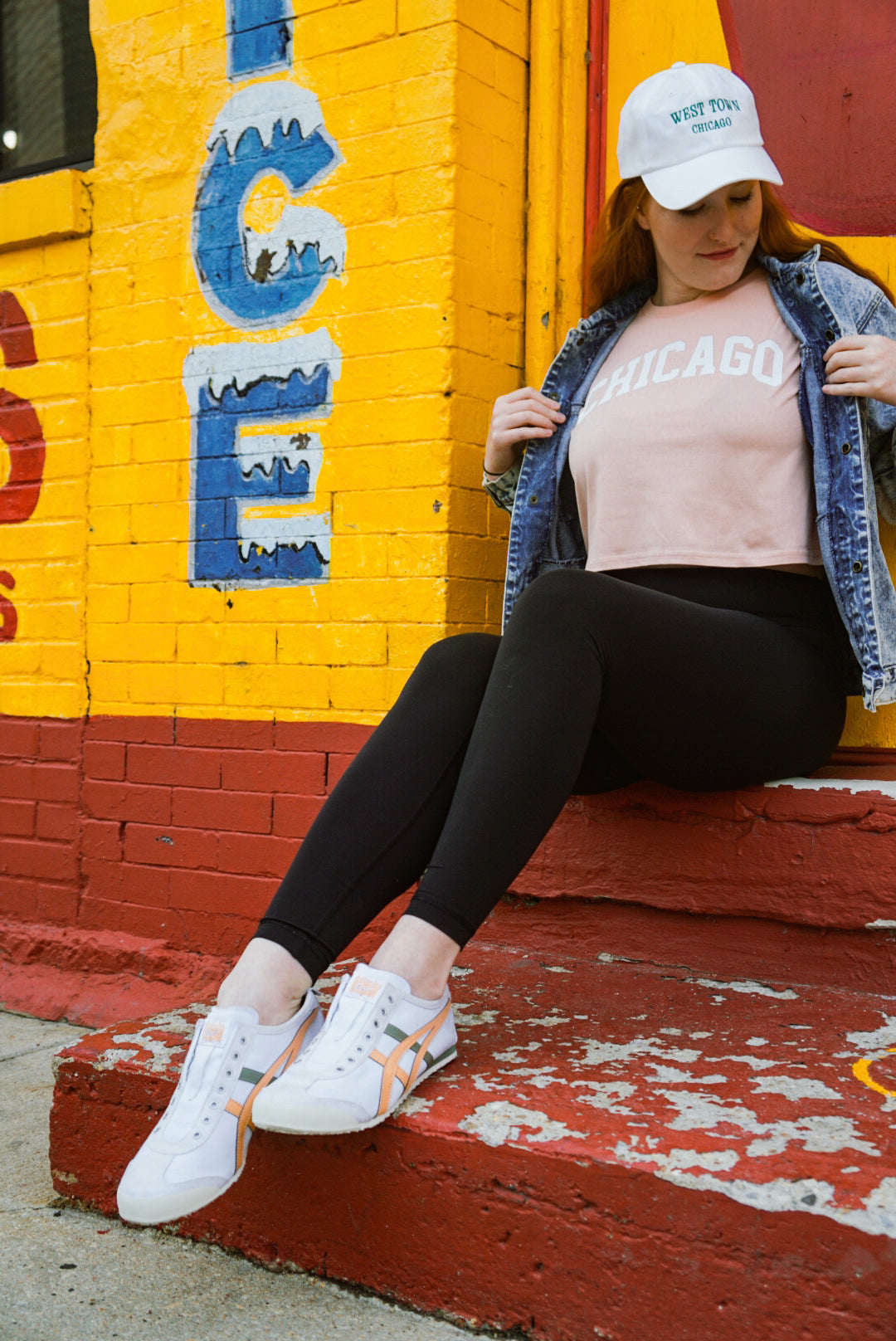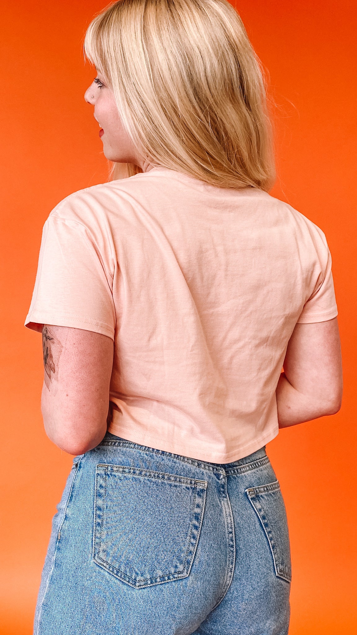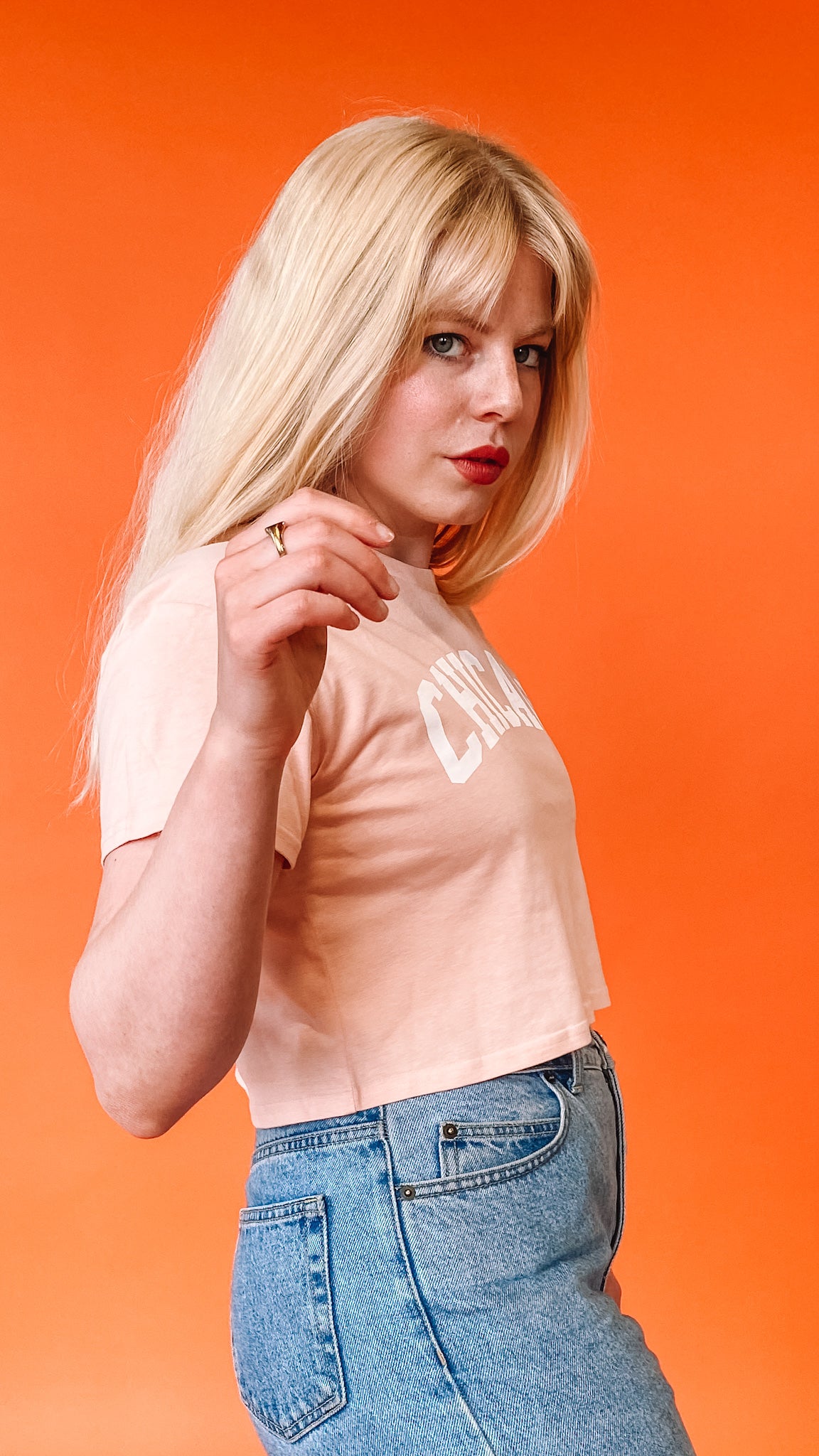 Cropped crew neck t-shirt in blush pink with white block lettering that reads "Chicago."