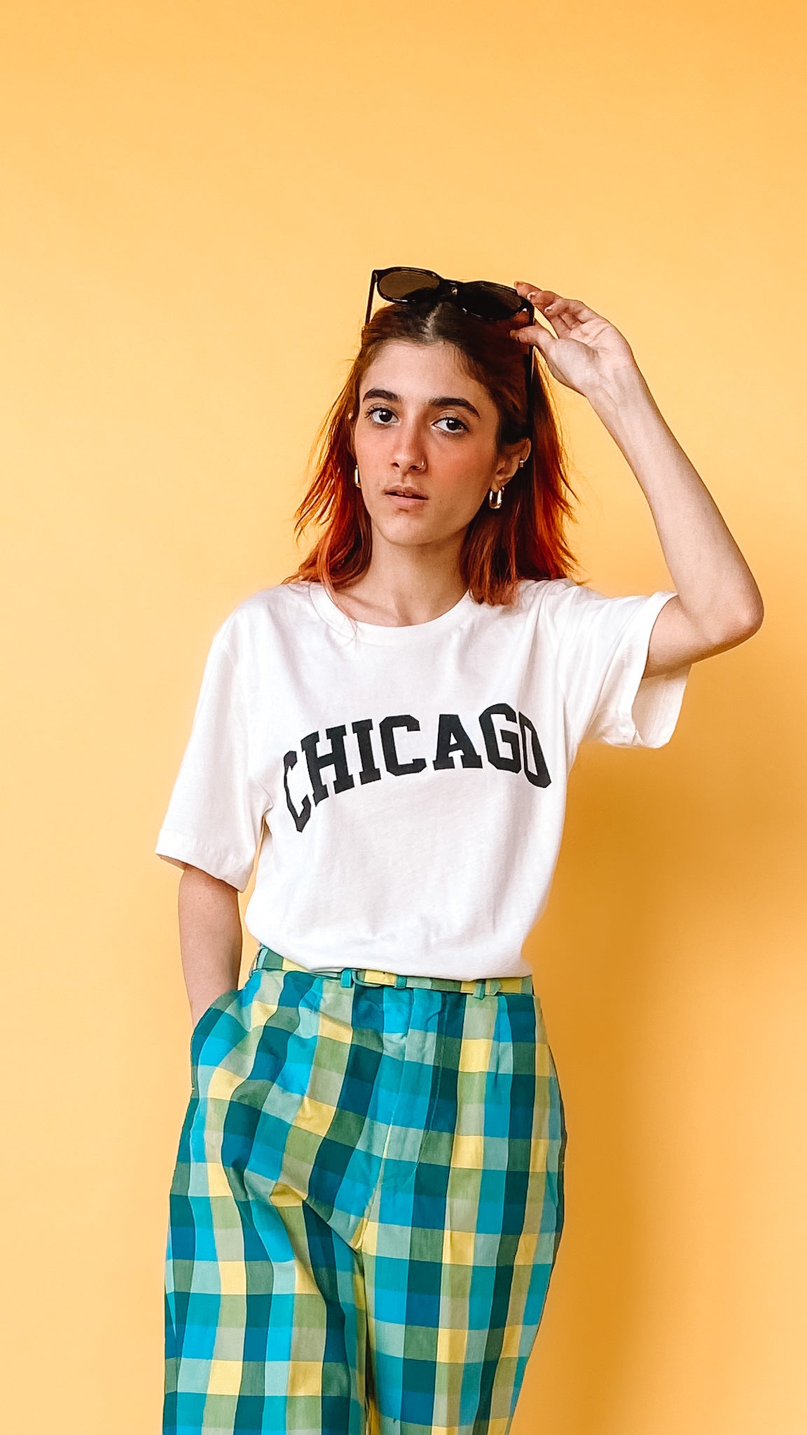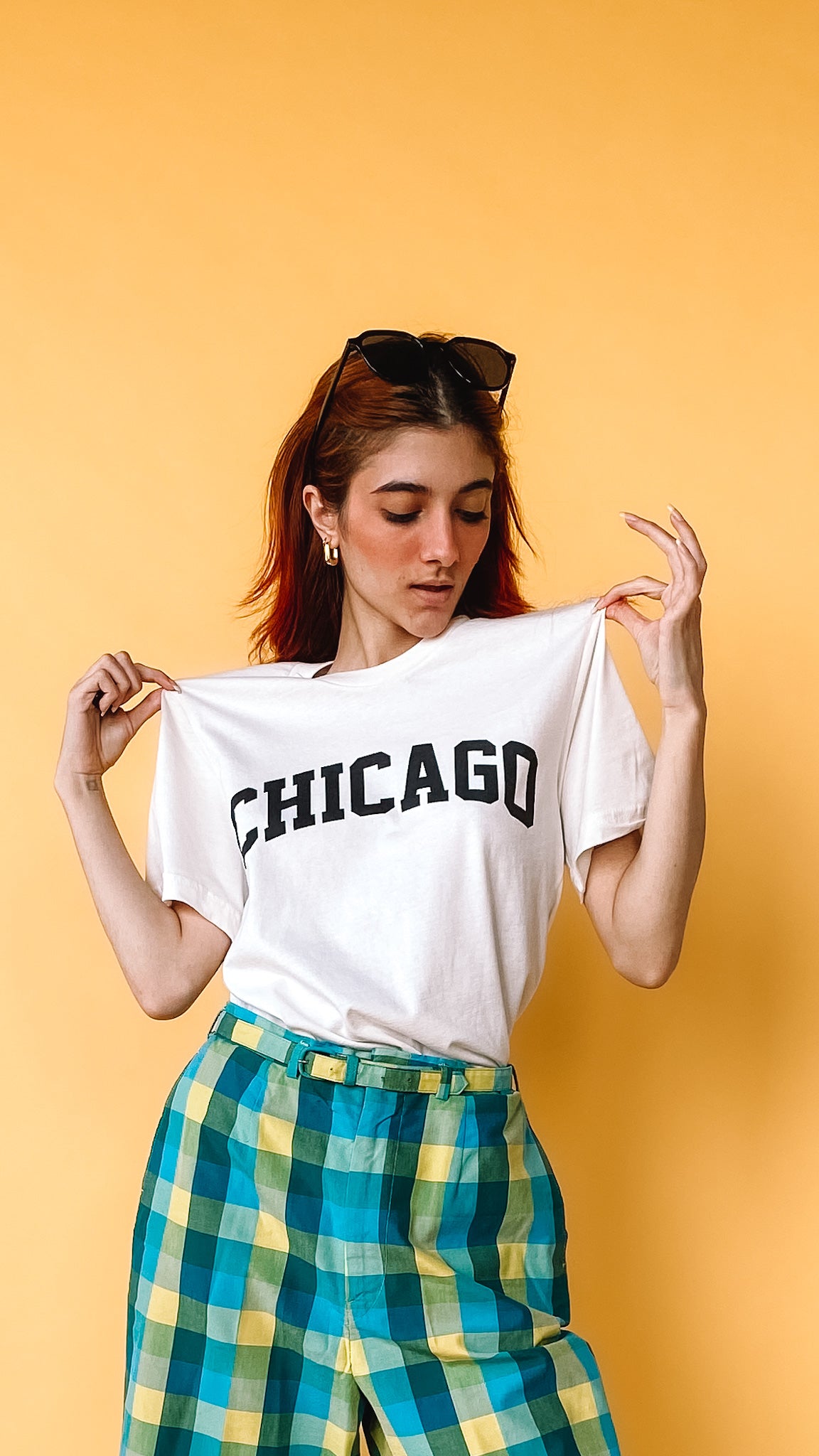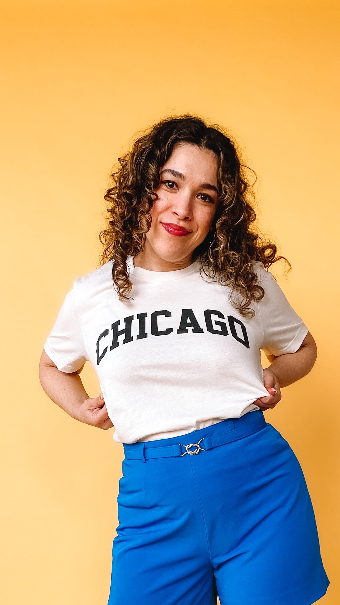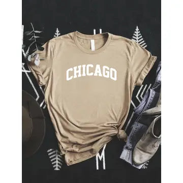 Off-white cotton tee with black block letters spelling out "Chicago." Short sleeves. Unisex sizing.