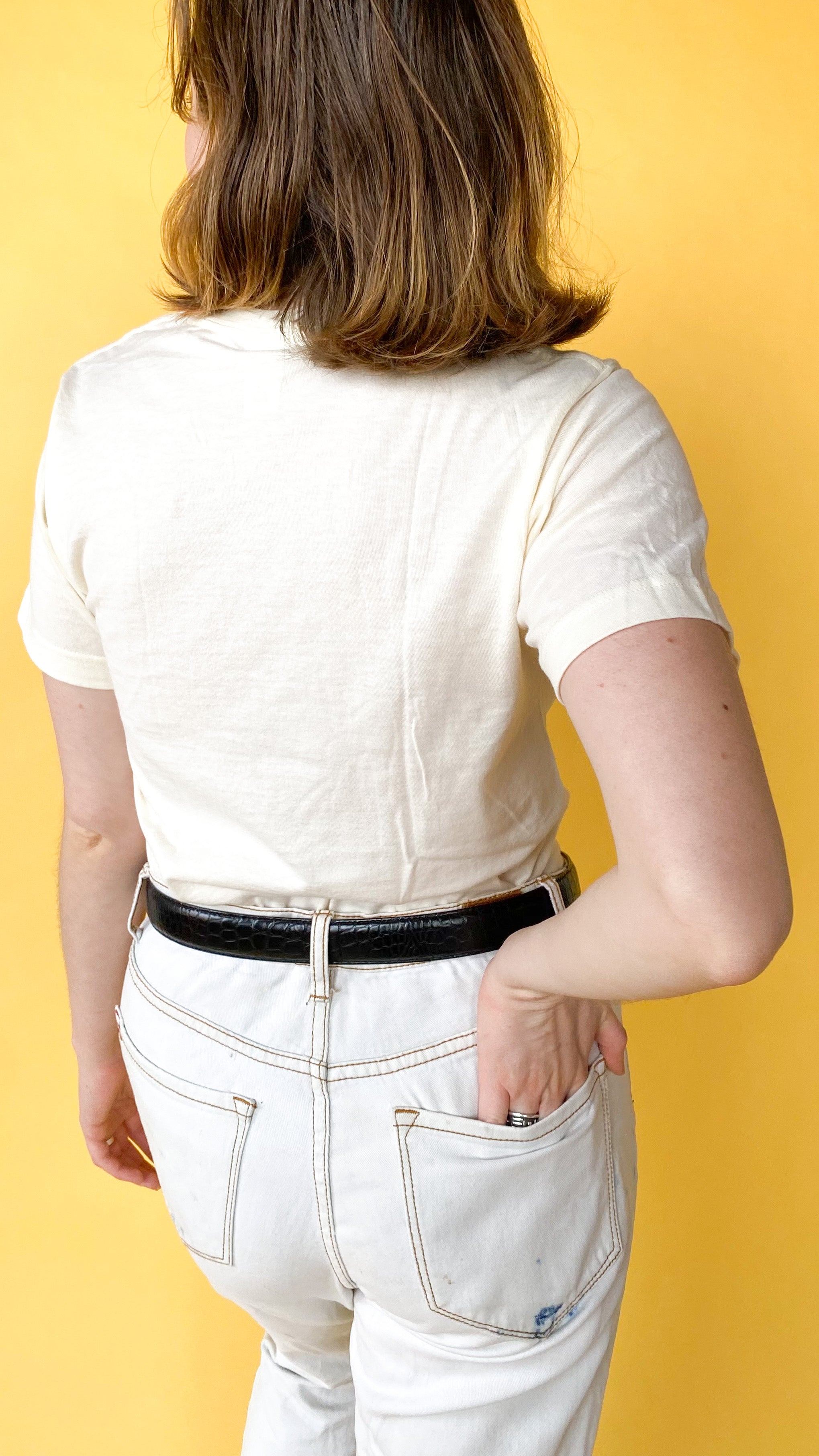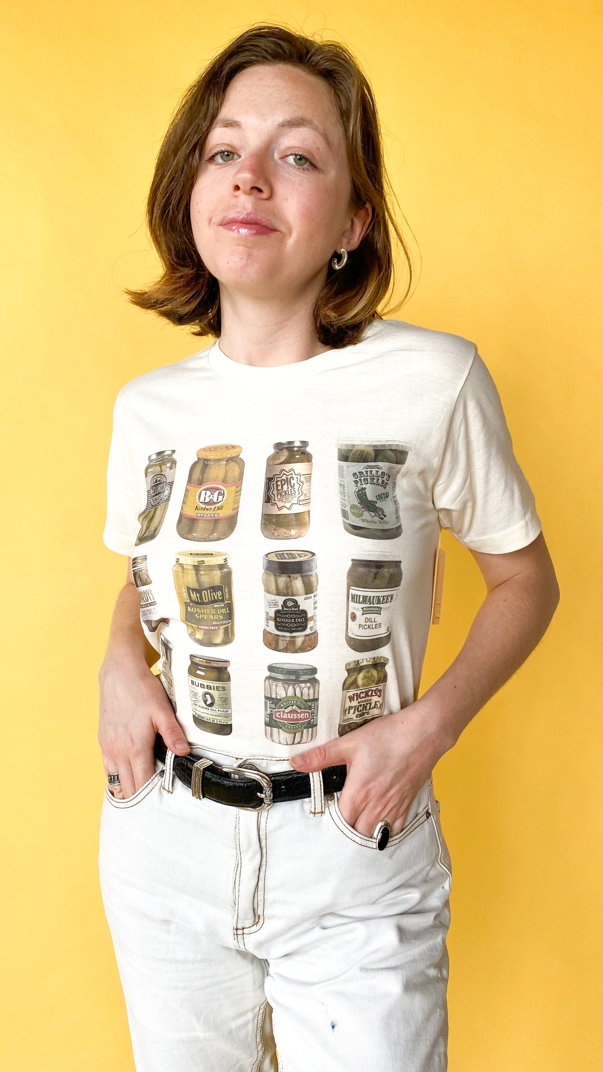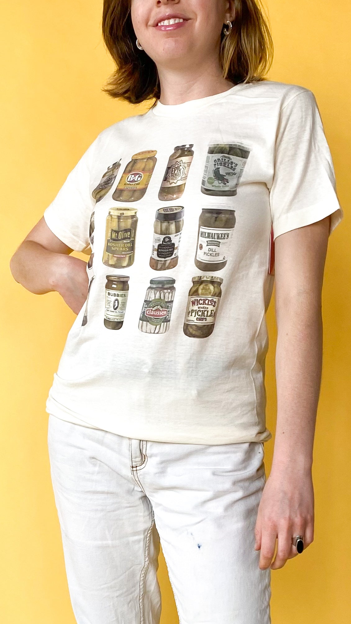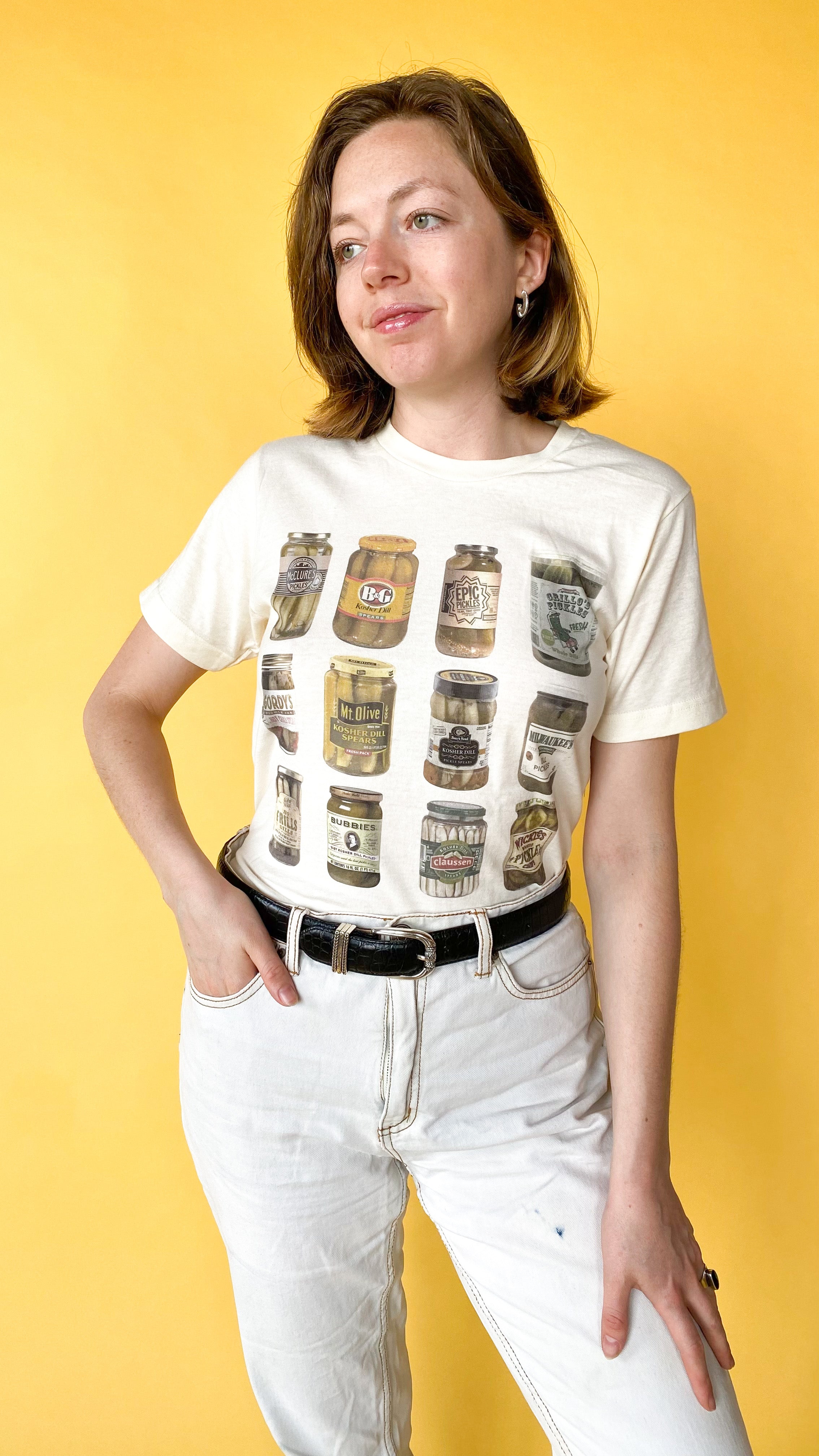 Graphic print of various jars of pickles on a cream short-sleeved t-shirt. Unisex sizing.