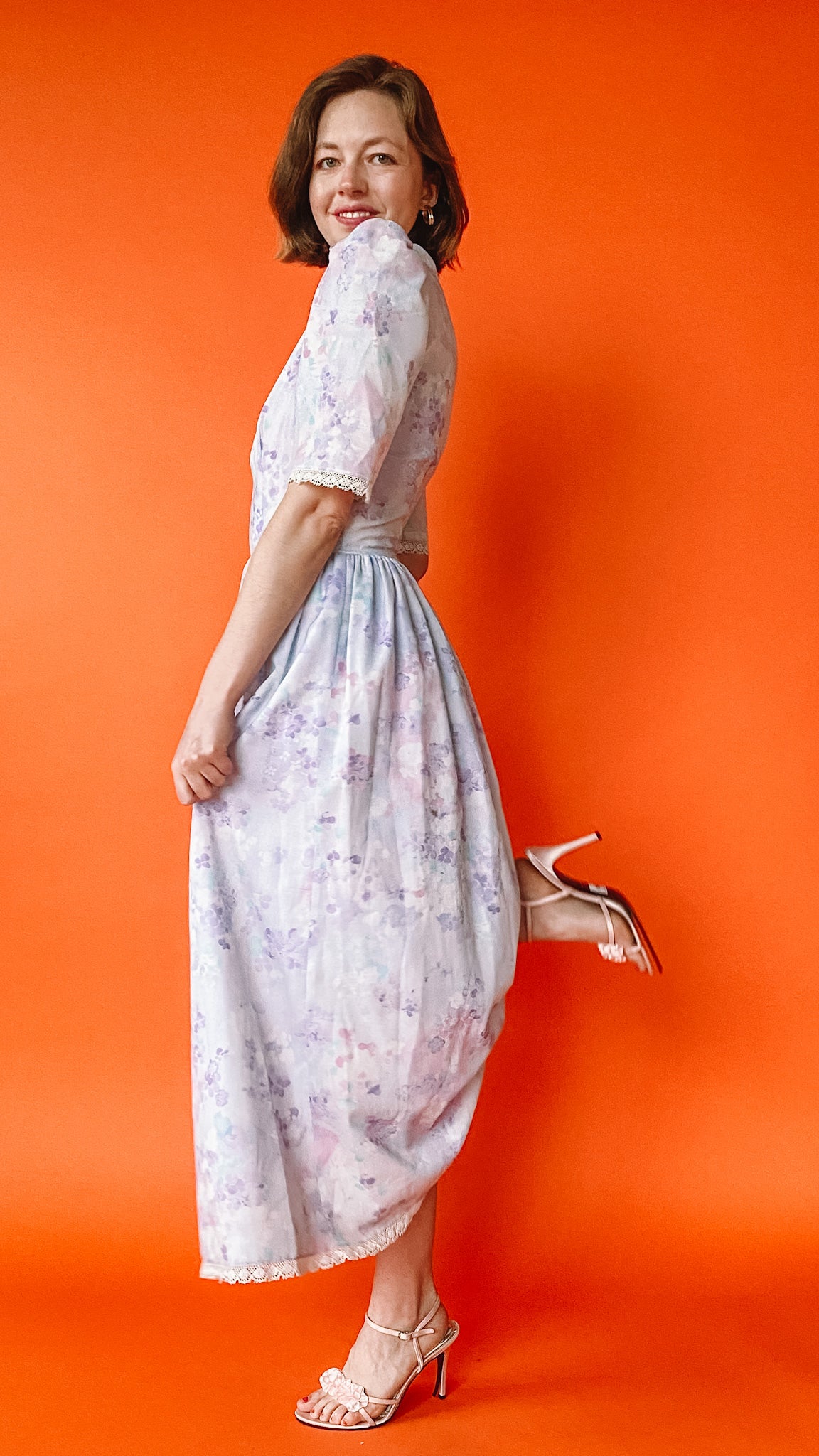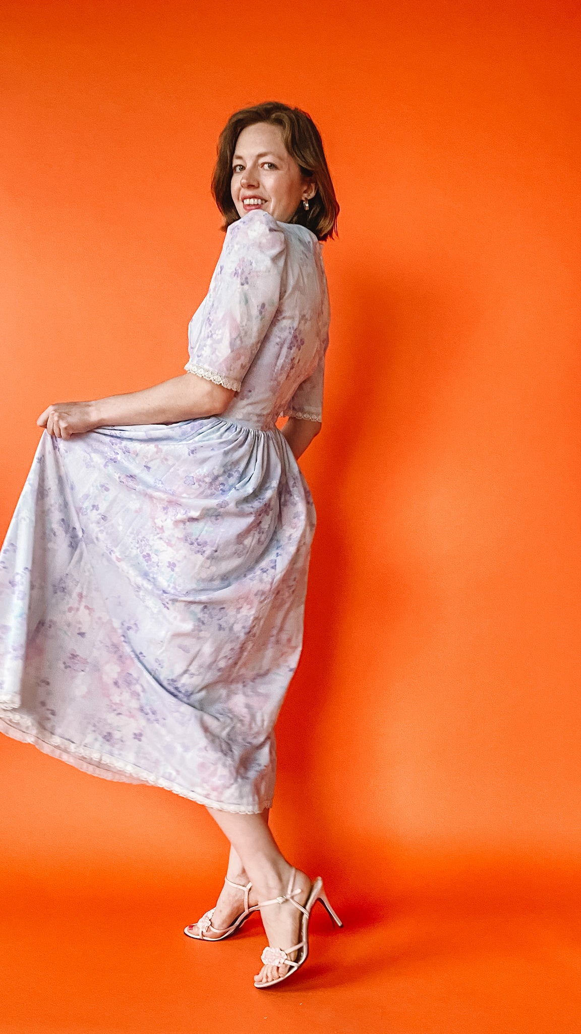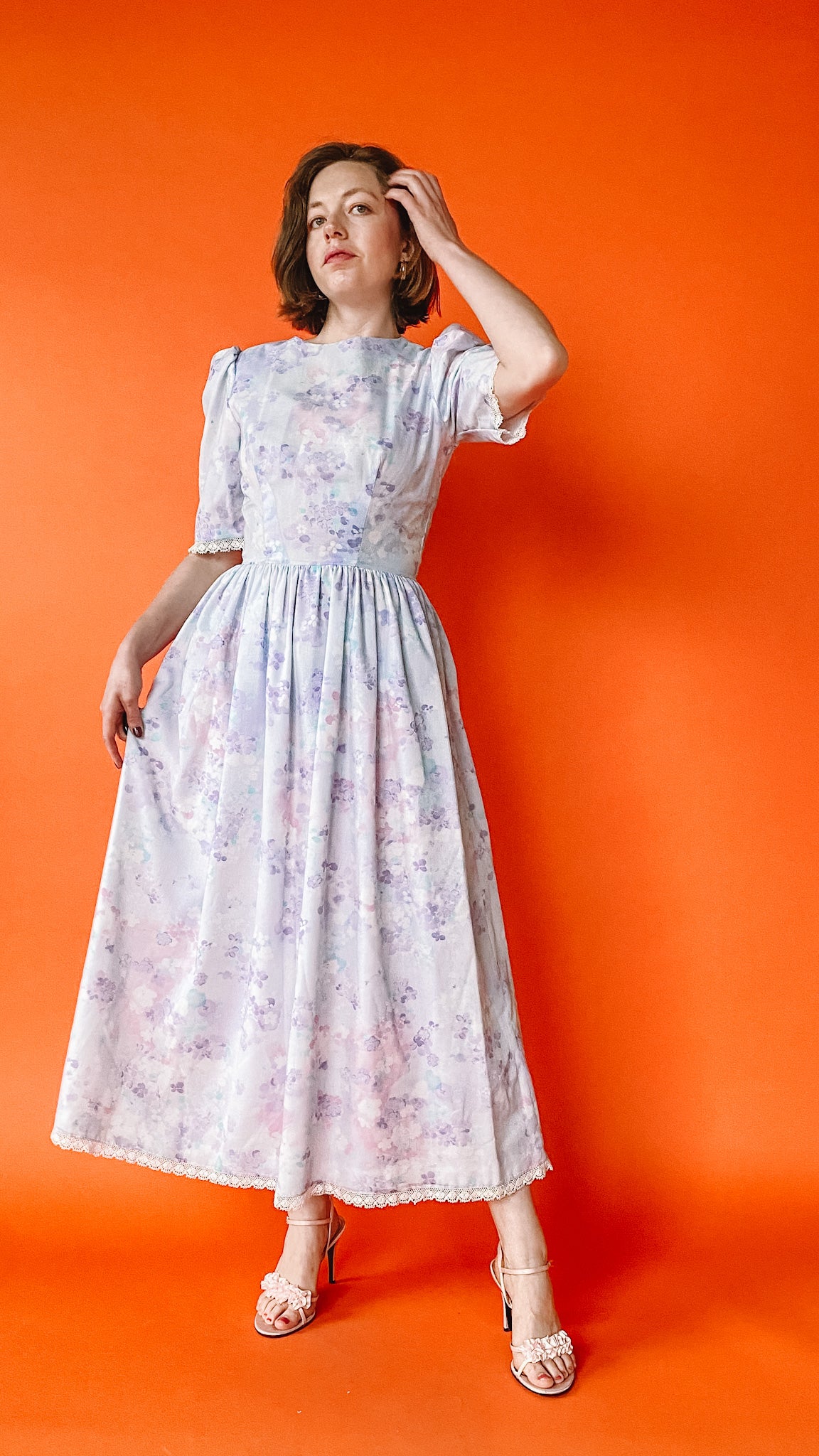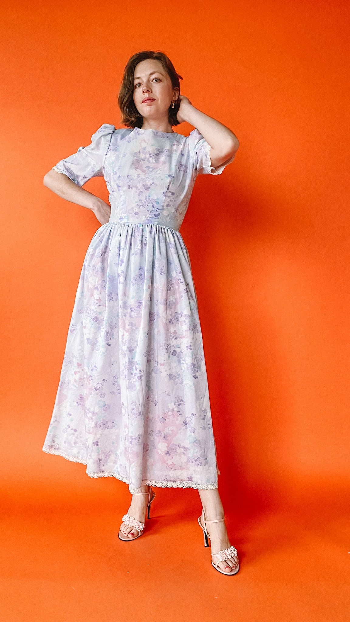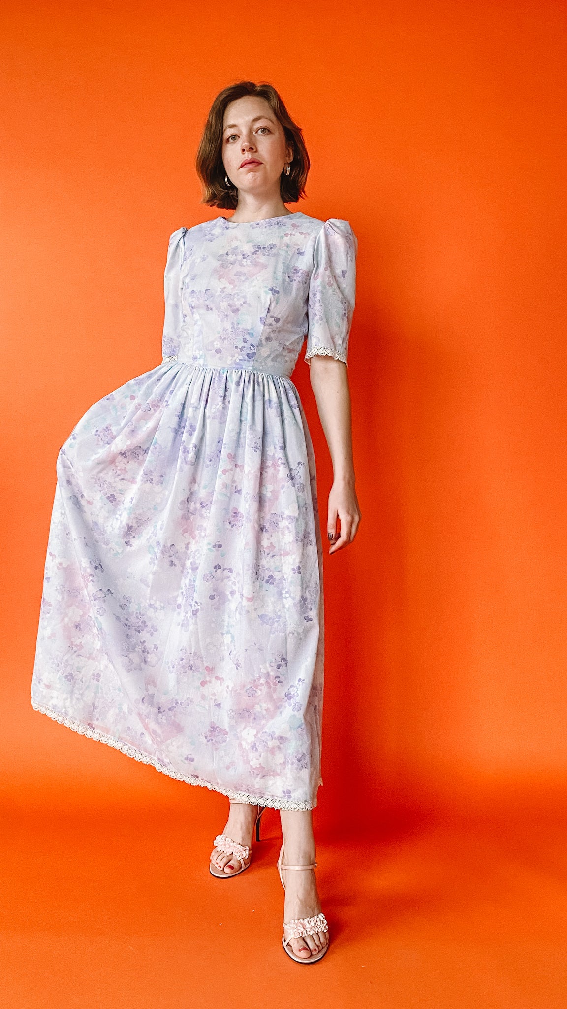 1980s Lilac Floral Puff Sleeve Dress, sz S