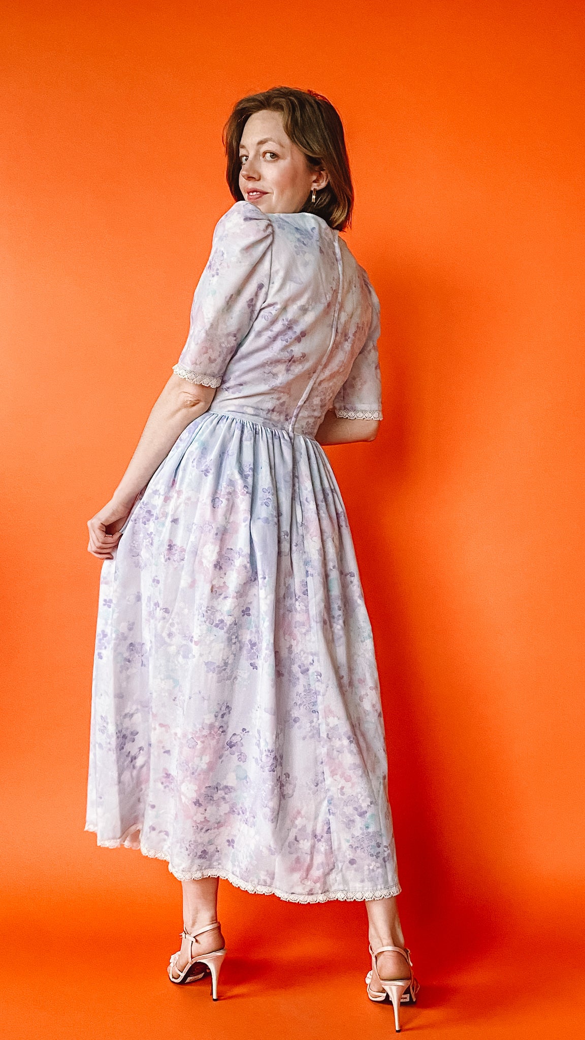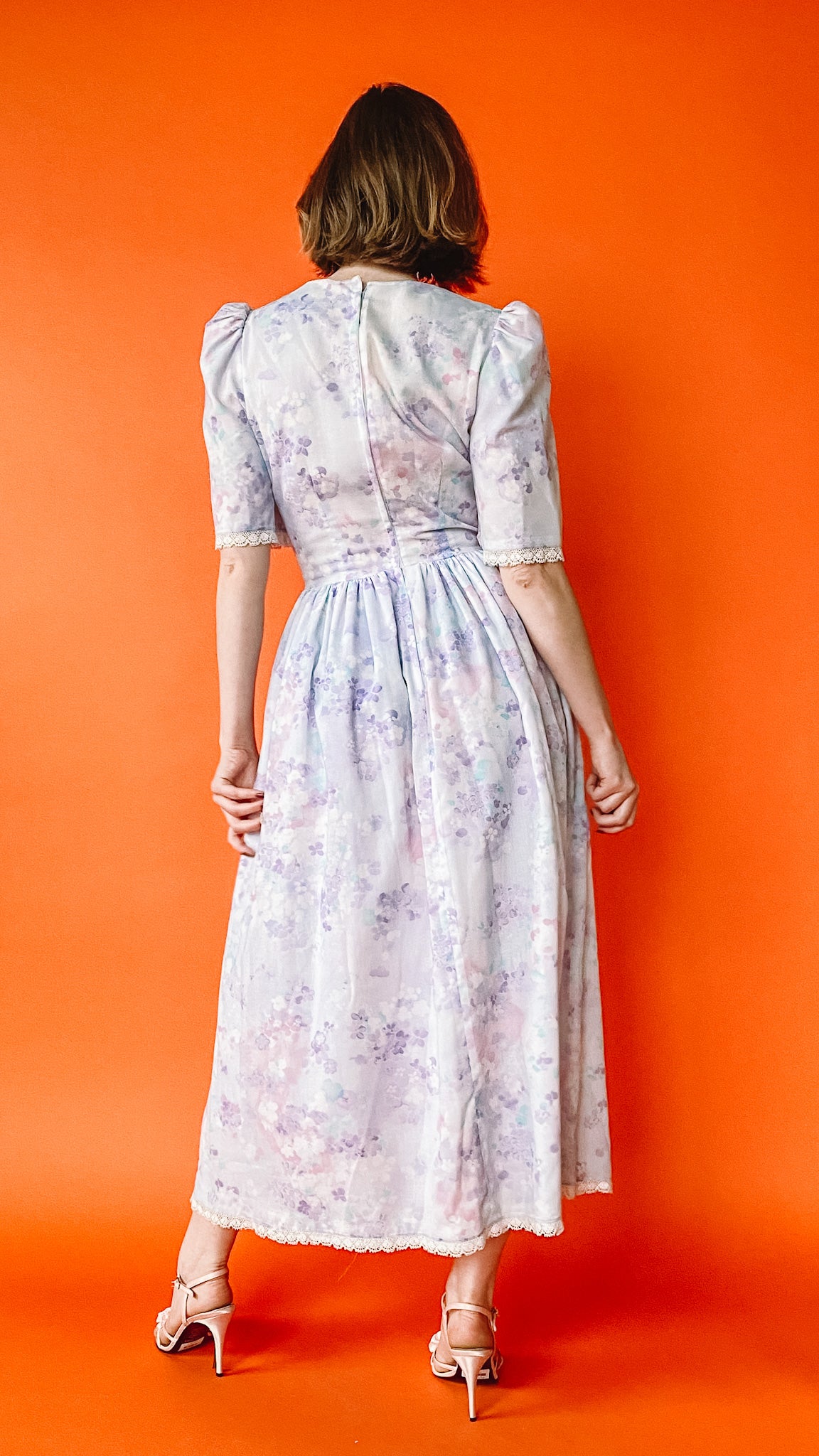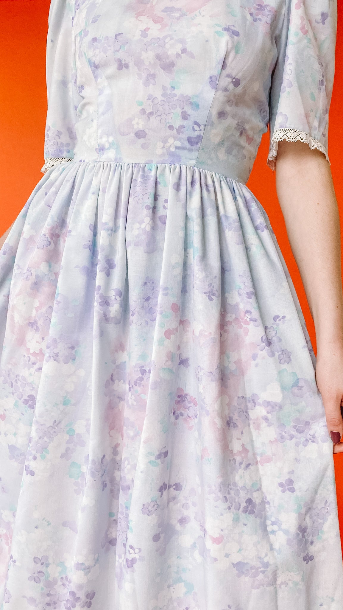 Light purple dress with floral pattern; putt sleeves & shoulder pads, zipper closure in back. Lace trim on armholes & hem.