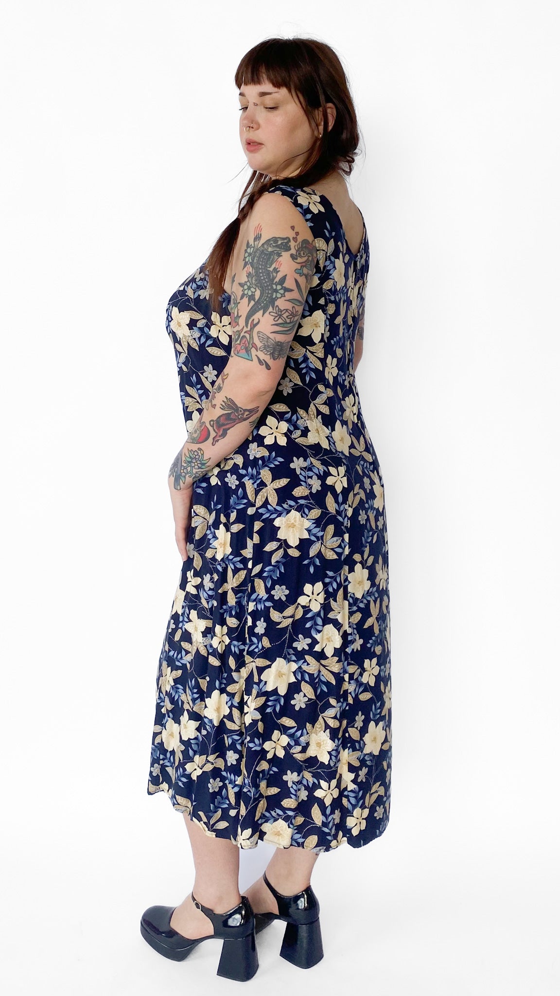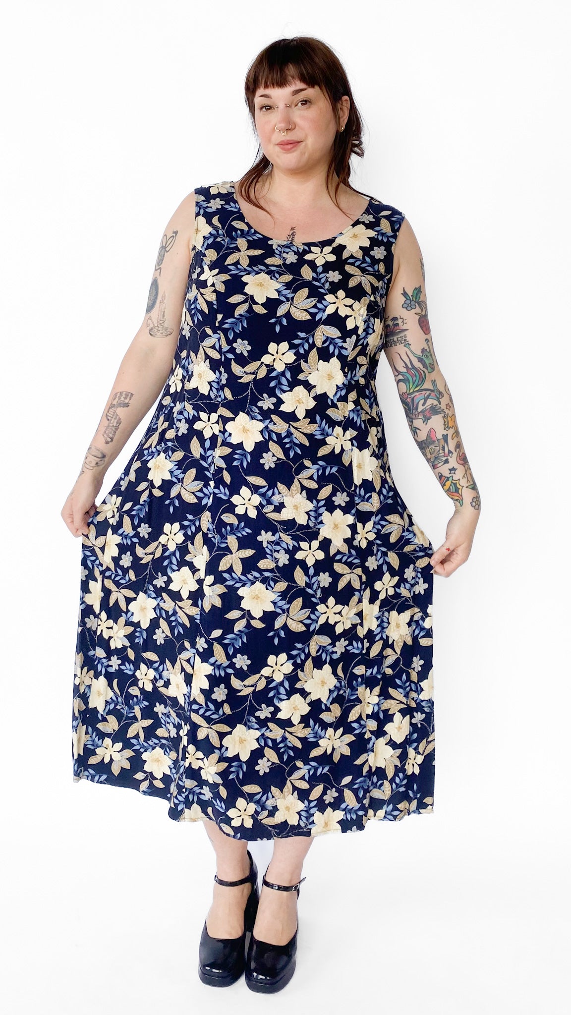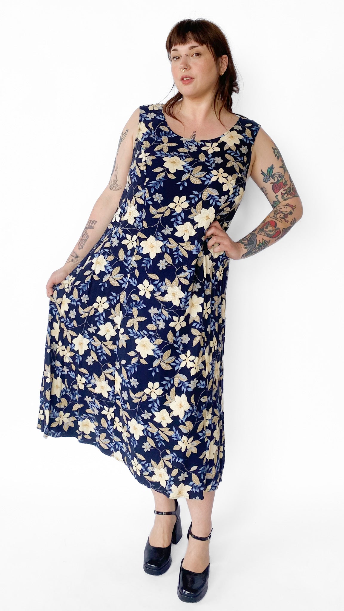 1990s Floral Navy Maxi Dress, sz. 3XL