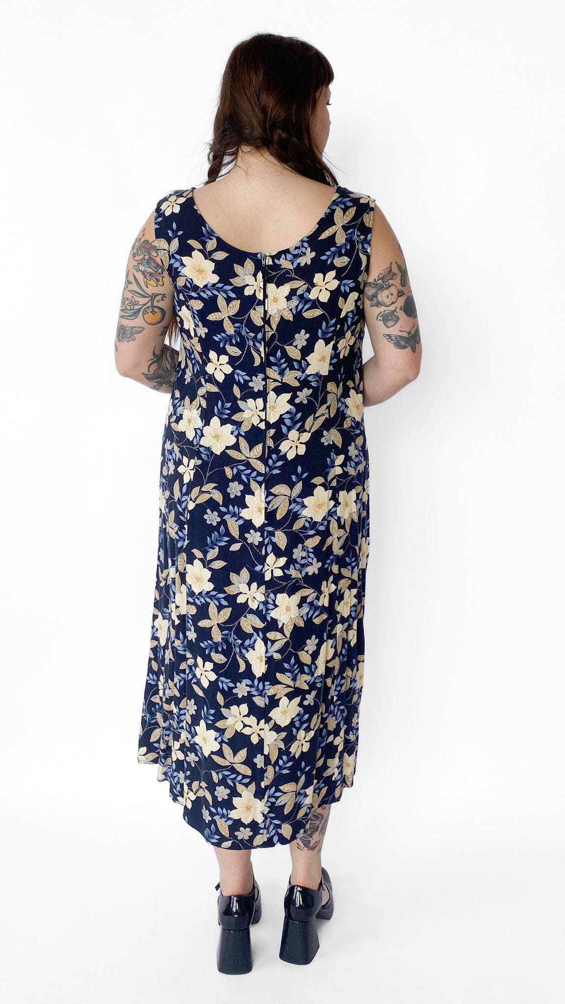 Description: Sleeveless navy dress with floral pattern of creams, yellows and light blues. Dress zippers in the back.