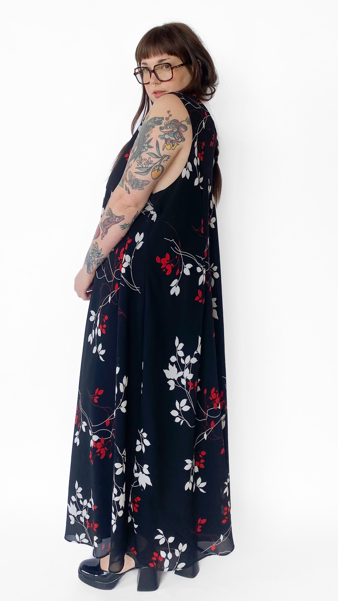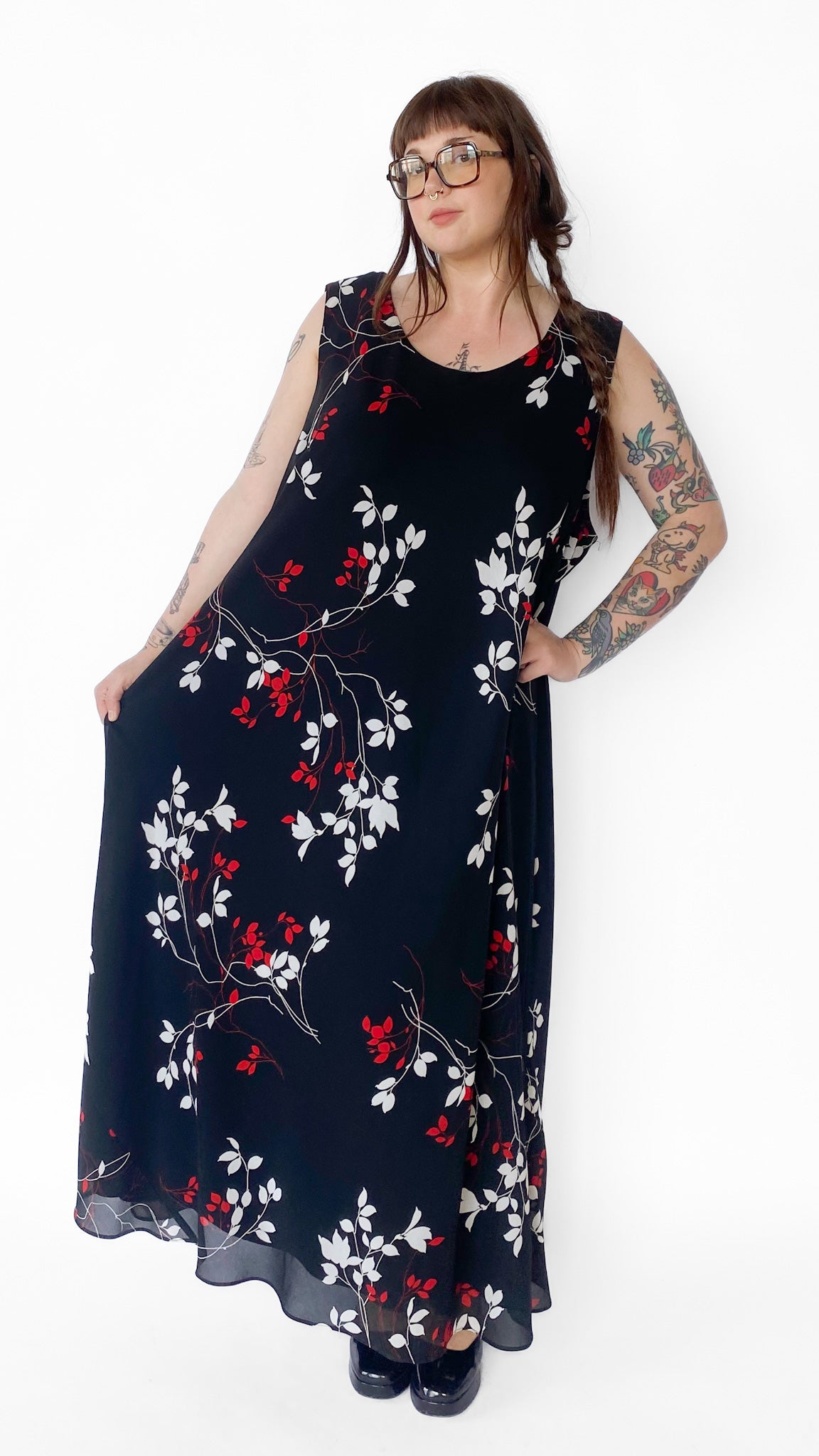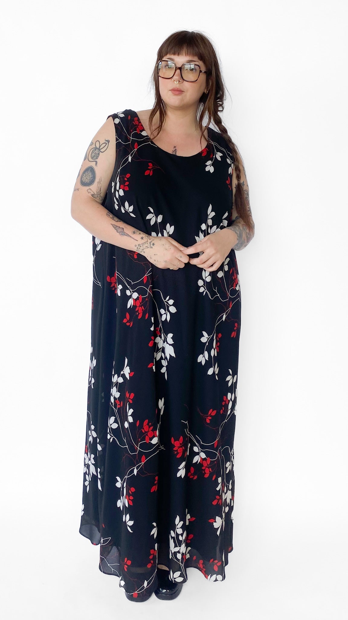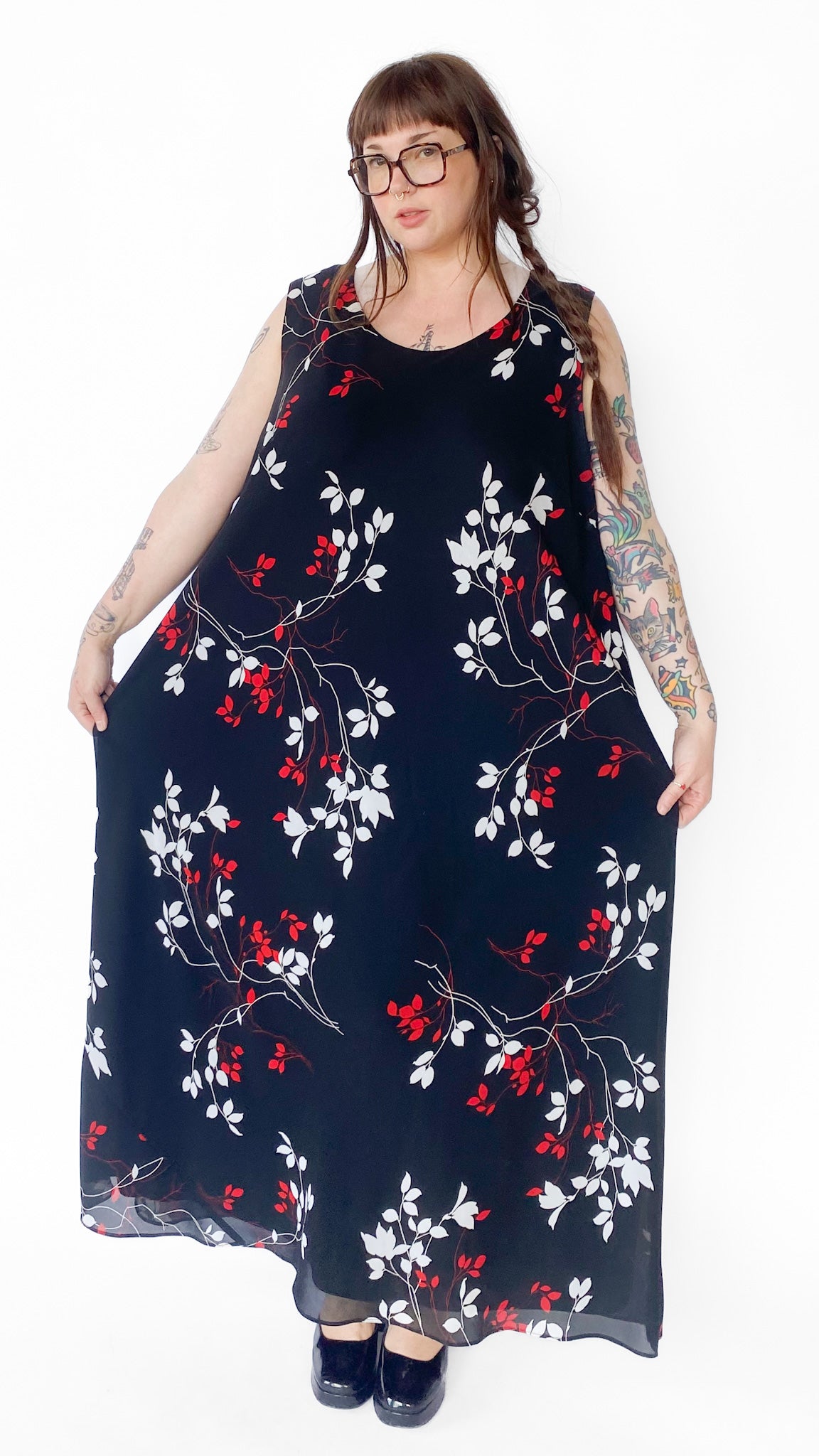 1990s Red & White Floral Black Maxi Dress, sz. 7XL