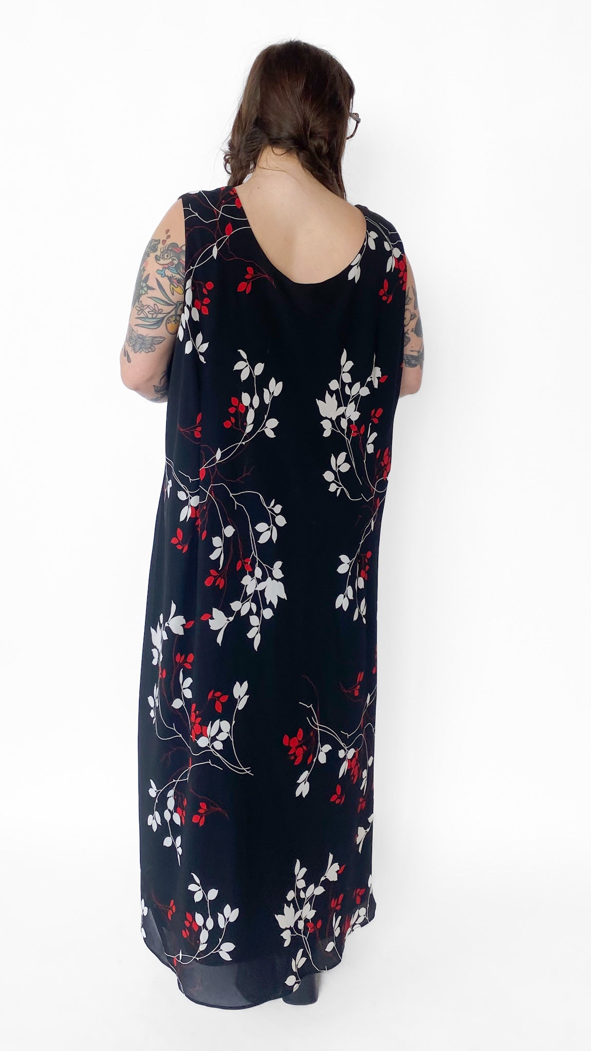 Description: Black sleeveless maxi dress with vine/leaf patterns in white and red. Dress does not have zipper, button or elastic.