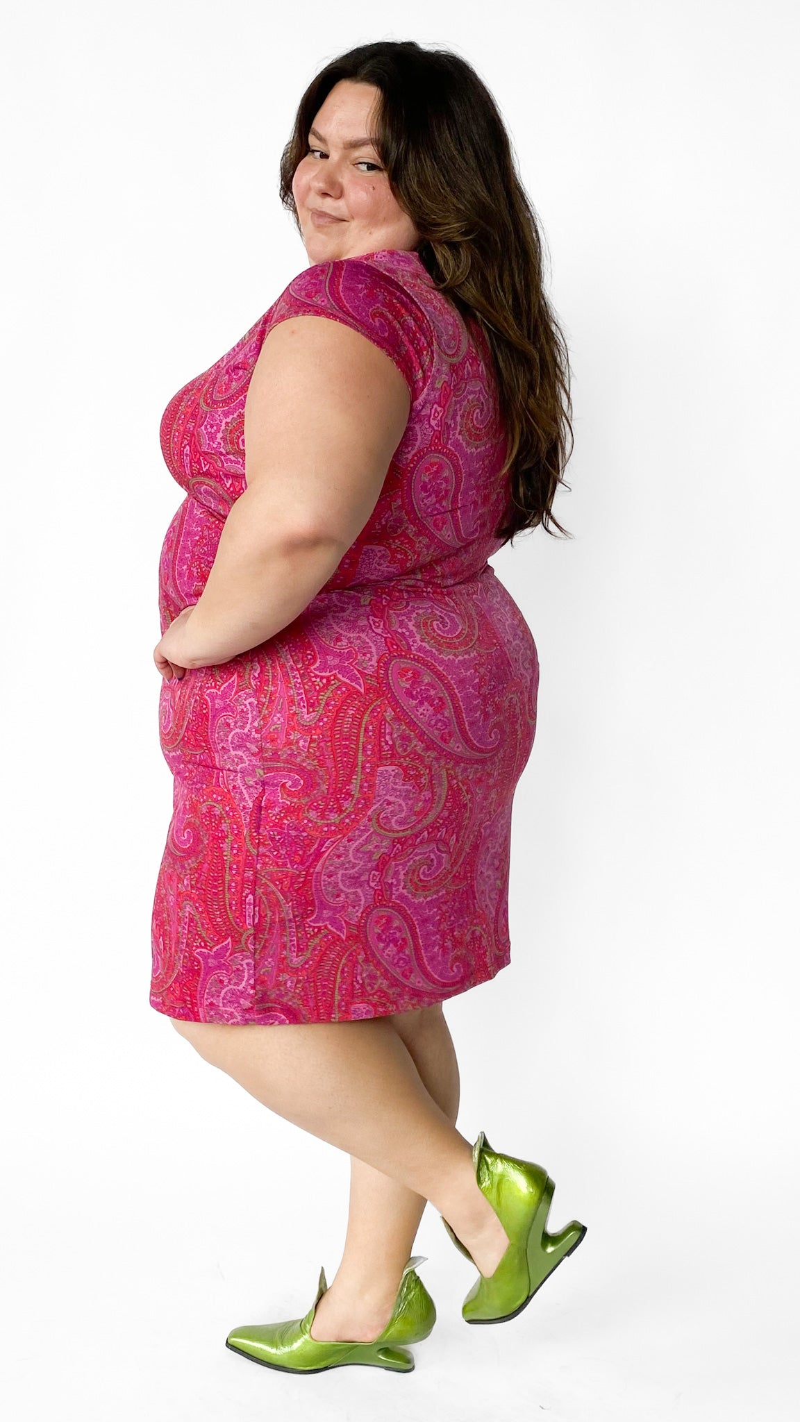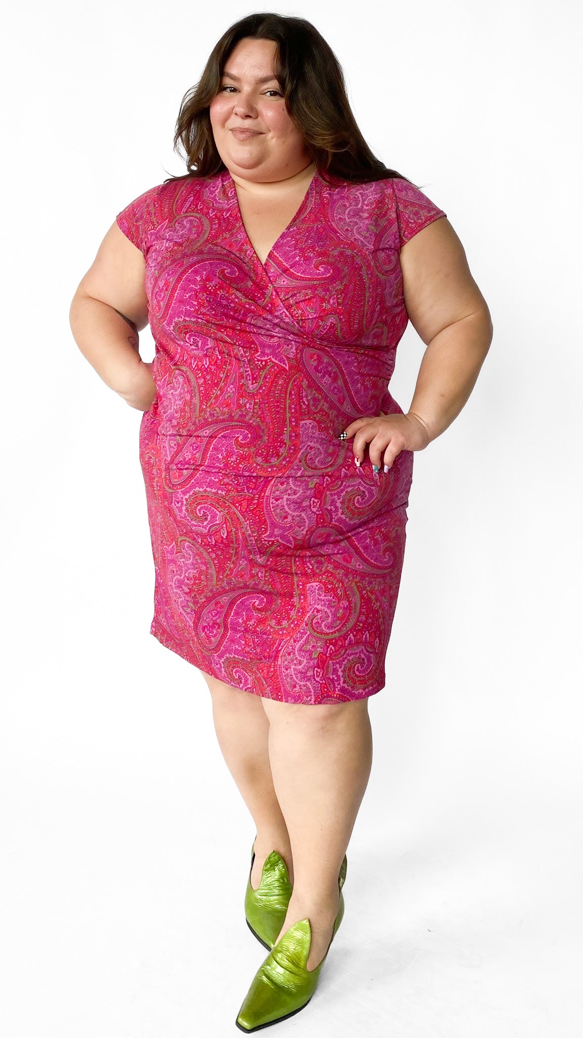 Stretchy magenta short sleeve dress with wrap style neckline. Abstract geometric paisley pattern throughout.