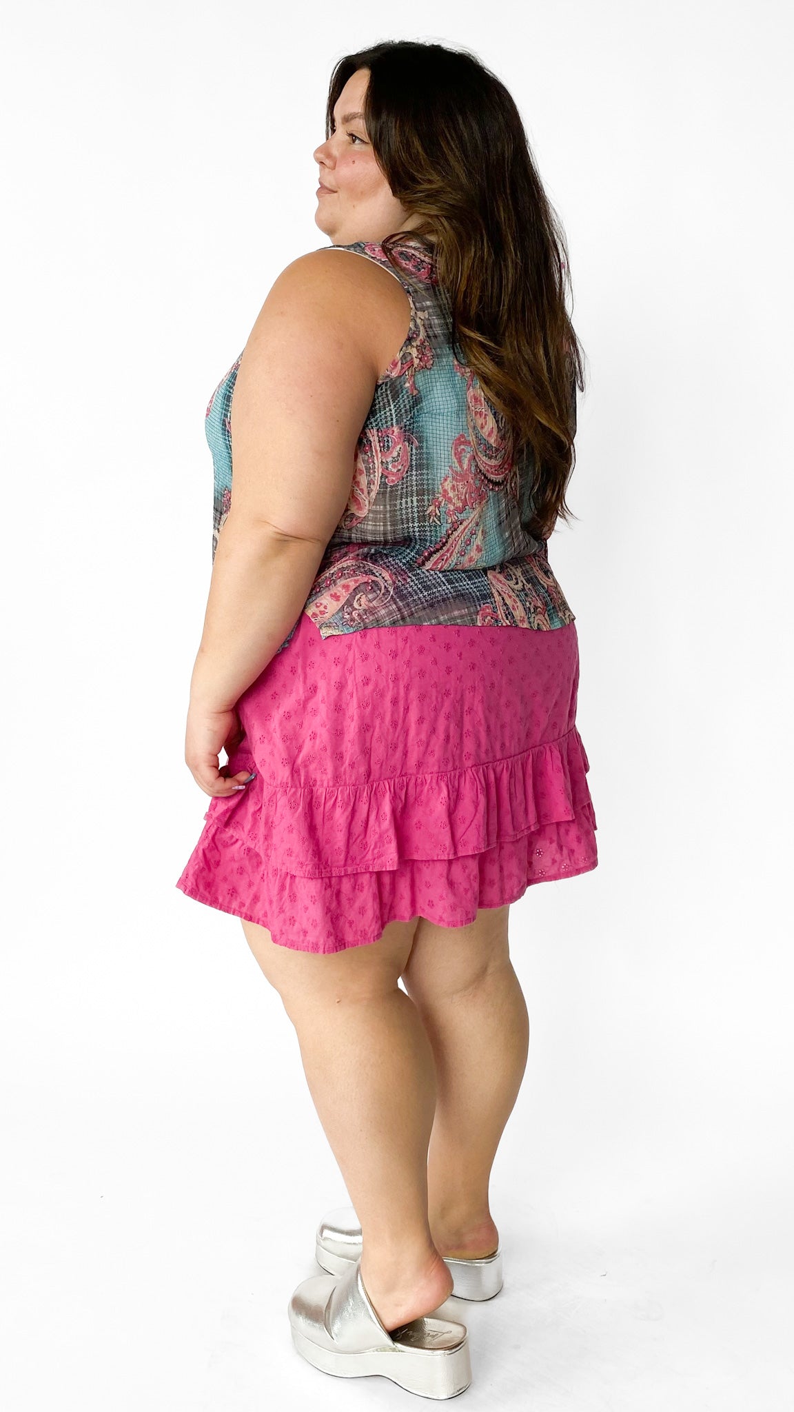 Pink floral eyelet ruffle mini skirt with elastic waistband.