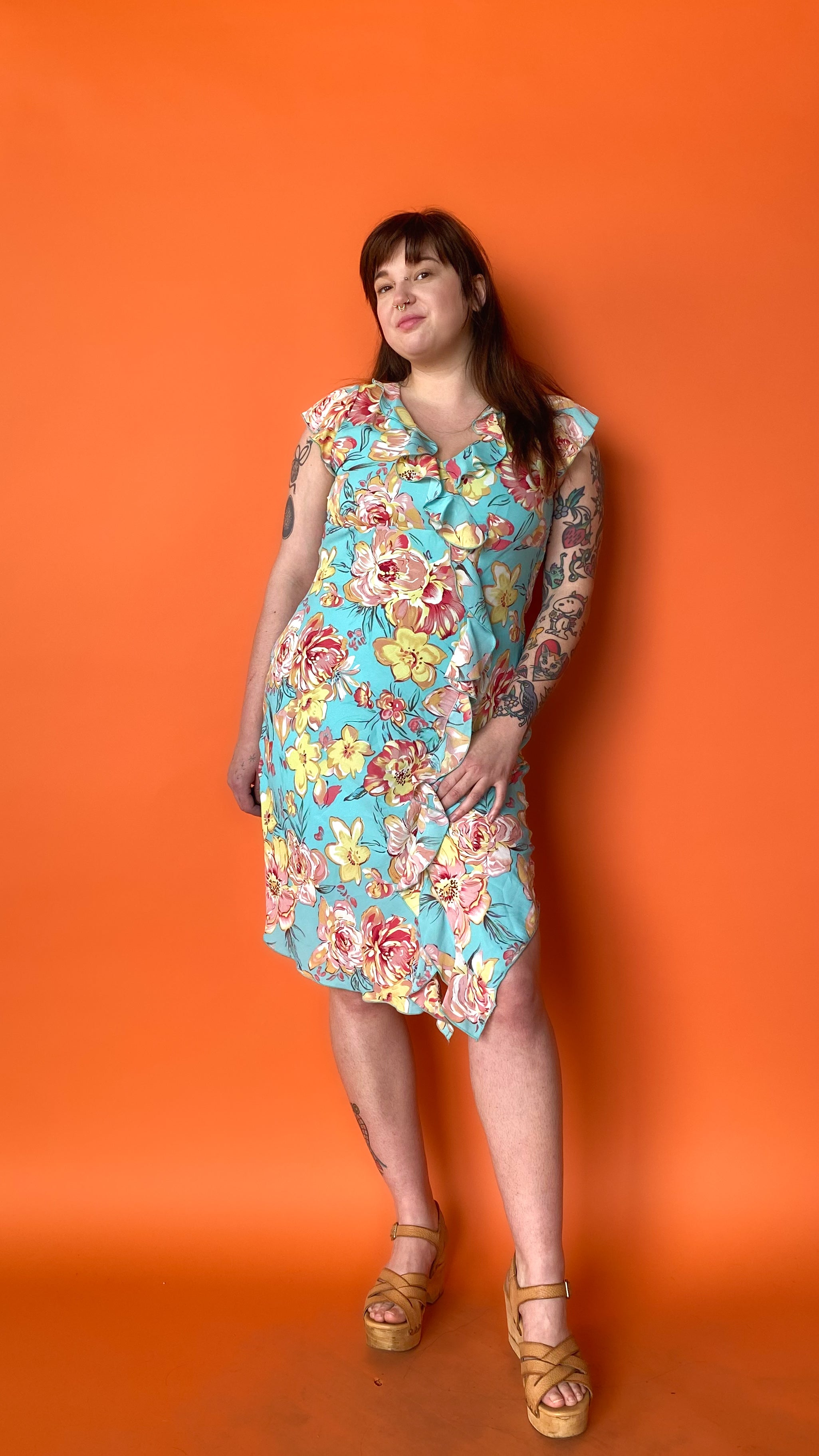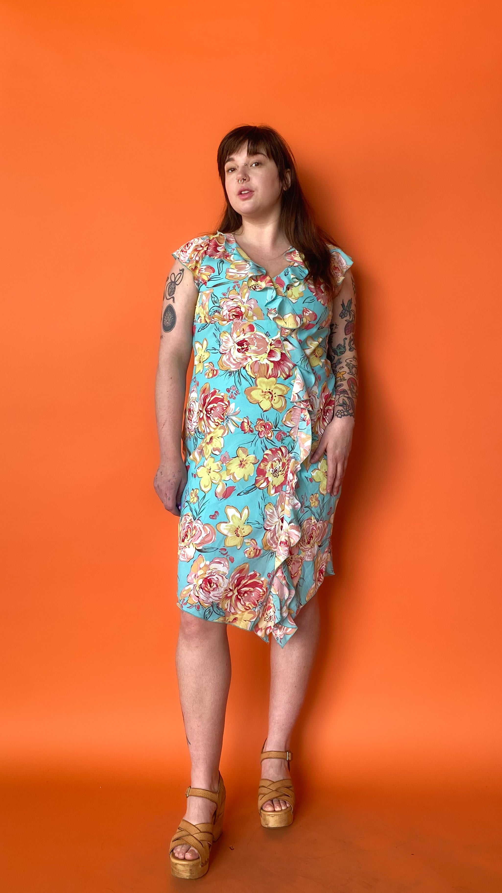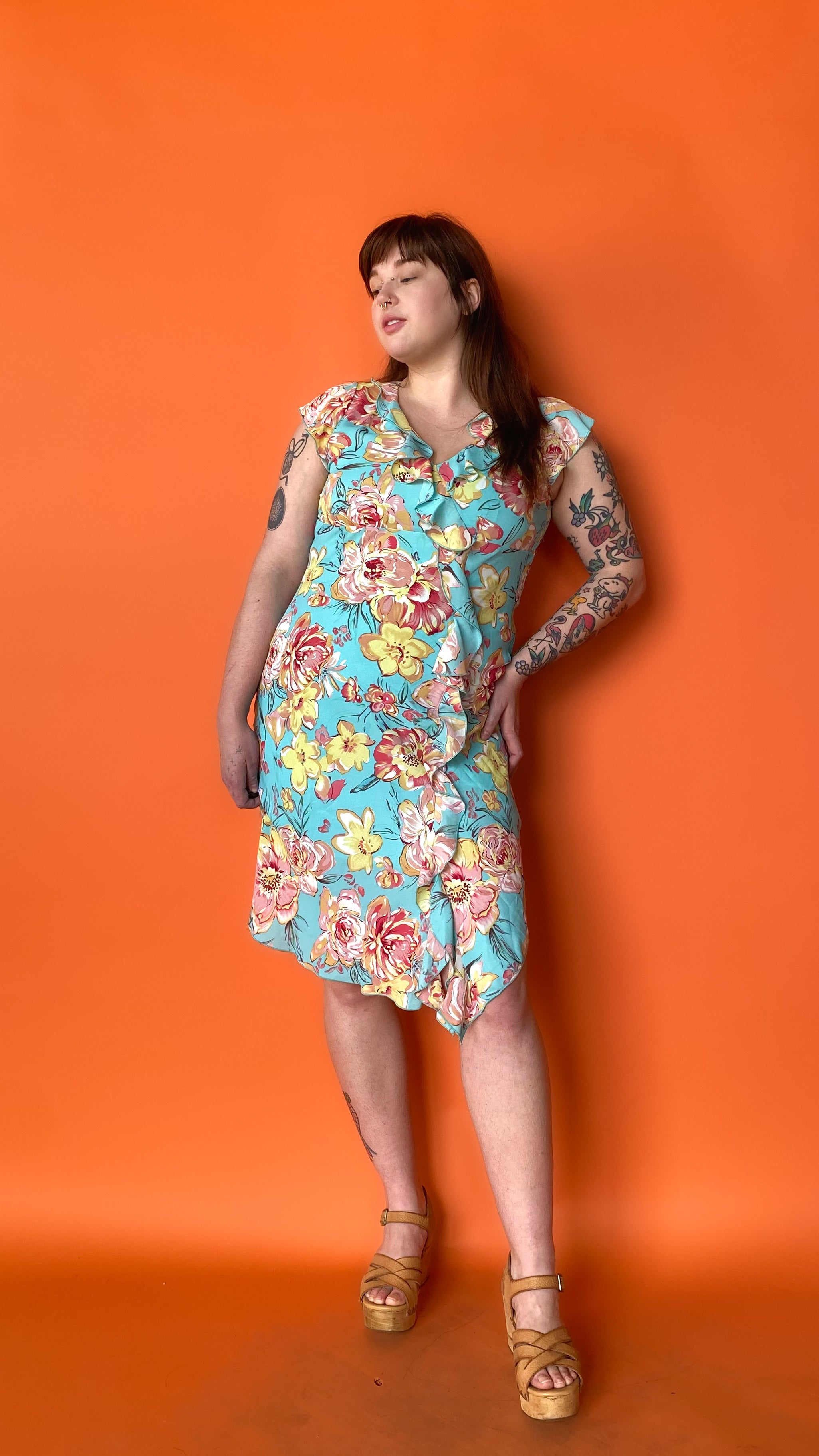 Light blue floral dress with sheer fluttery sleeves & ruffled skirt. Dress is fully lined. Has no closure, but material is stretchy. Can fit sizes large and extra large, depending on desired fit.