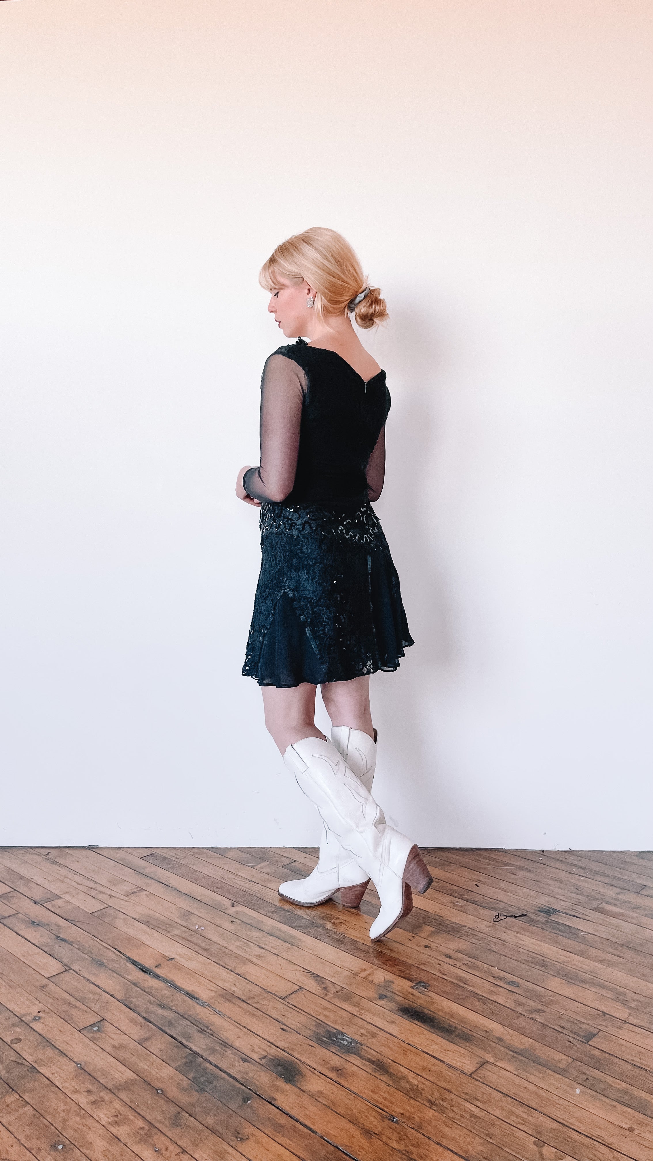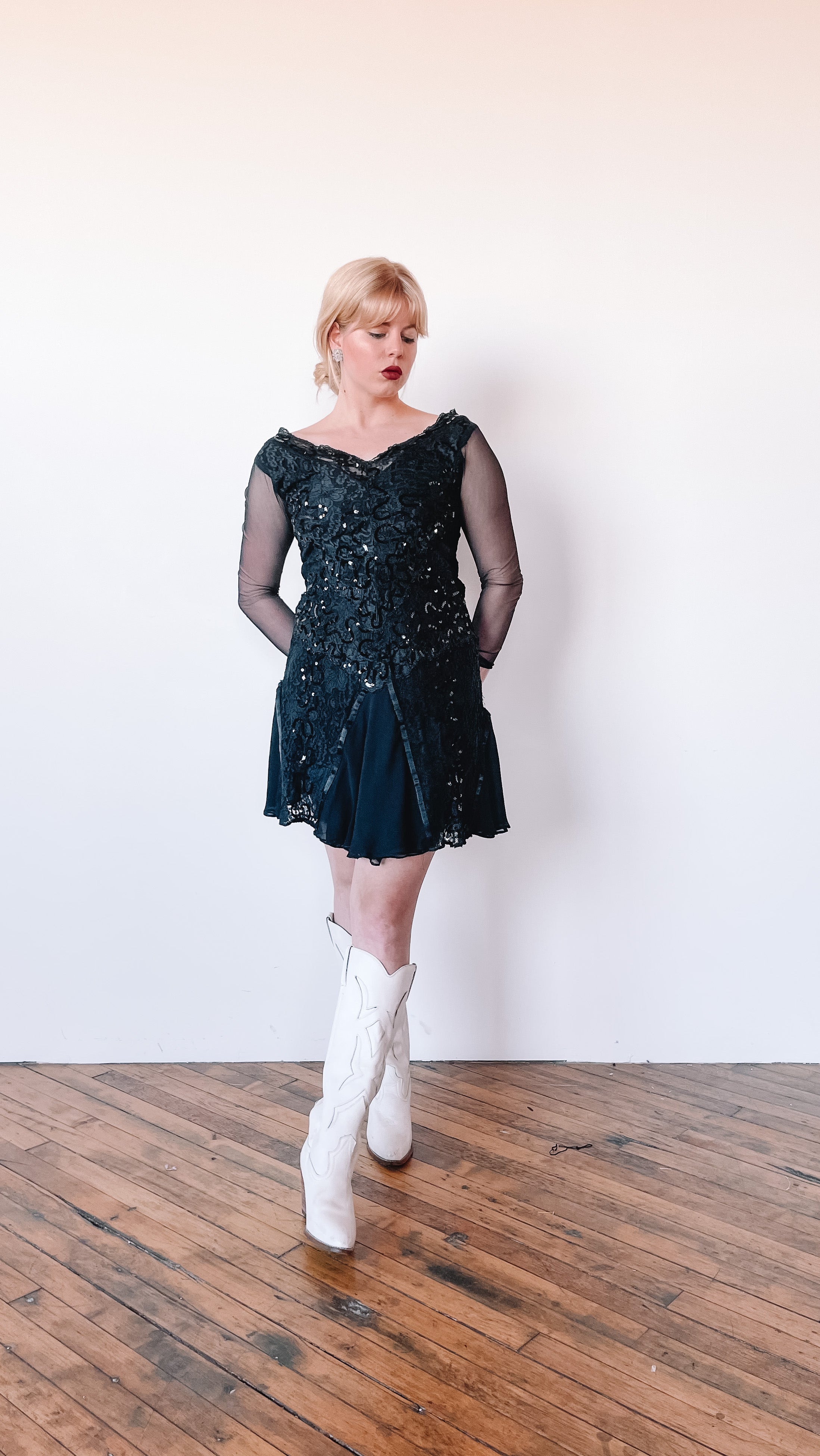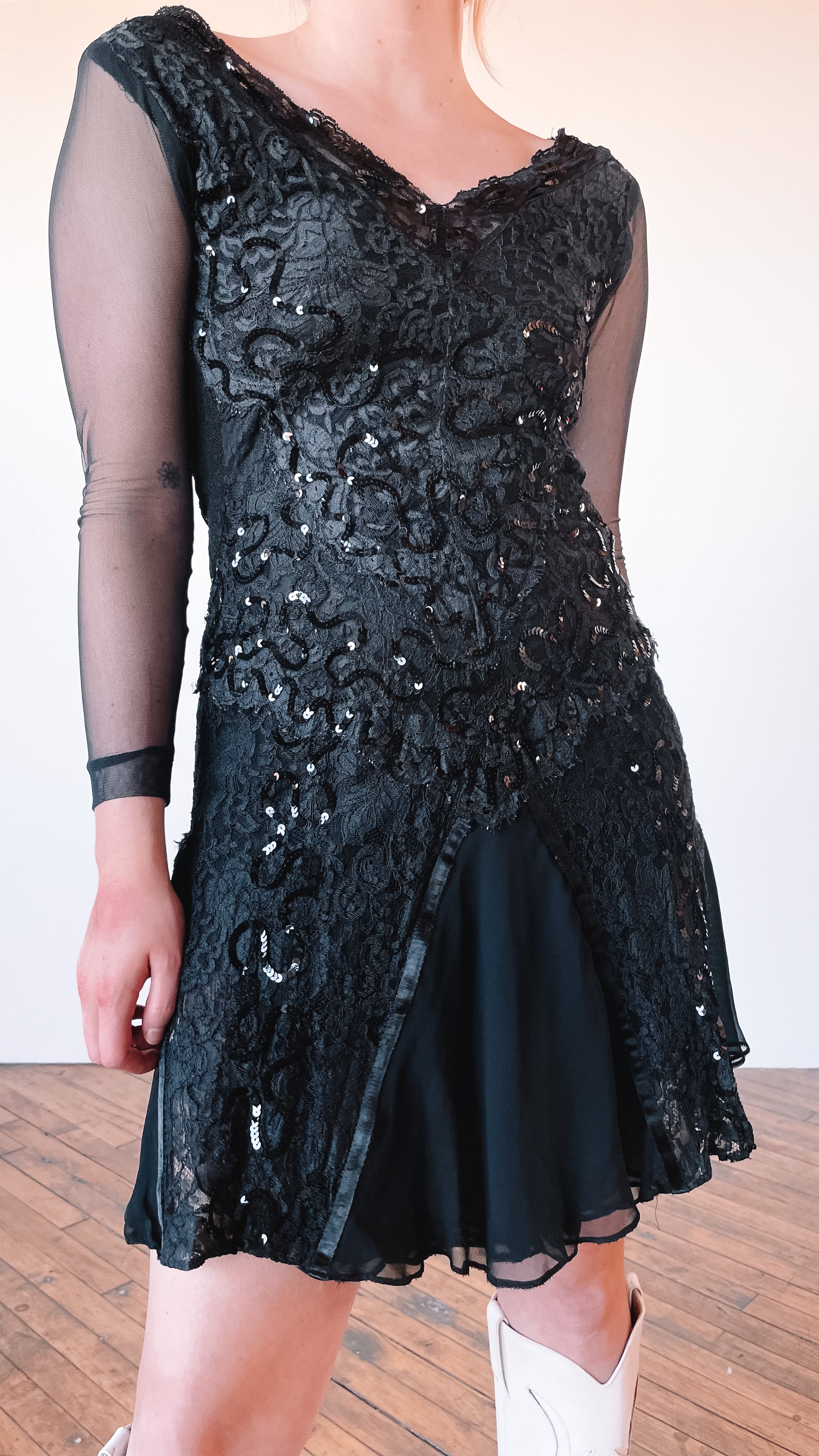 1980s Black Lace and Sequin Mini Dress, sz. S