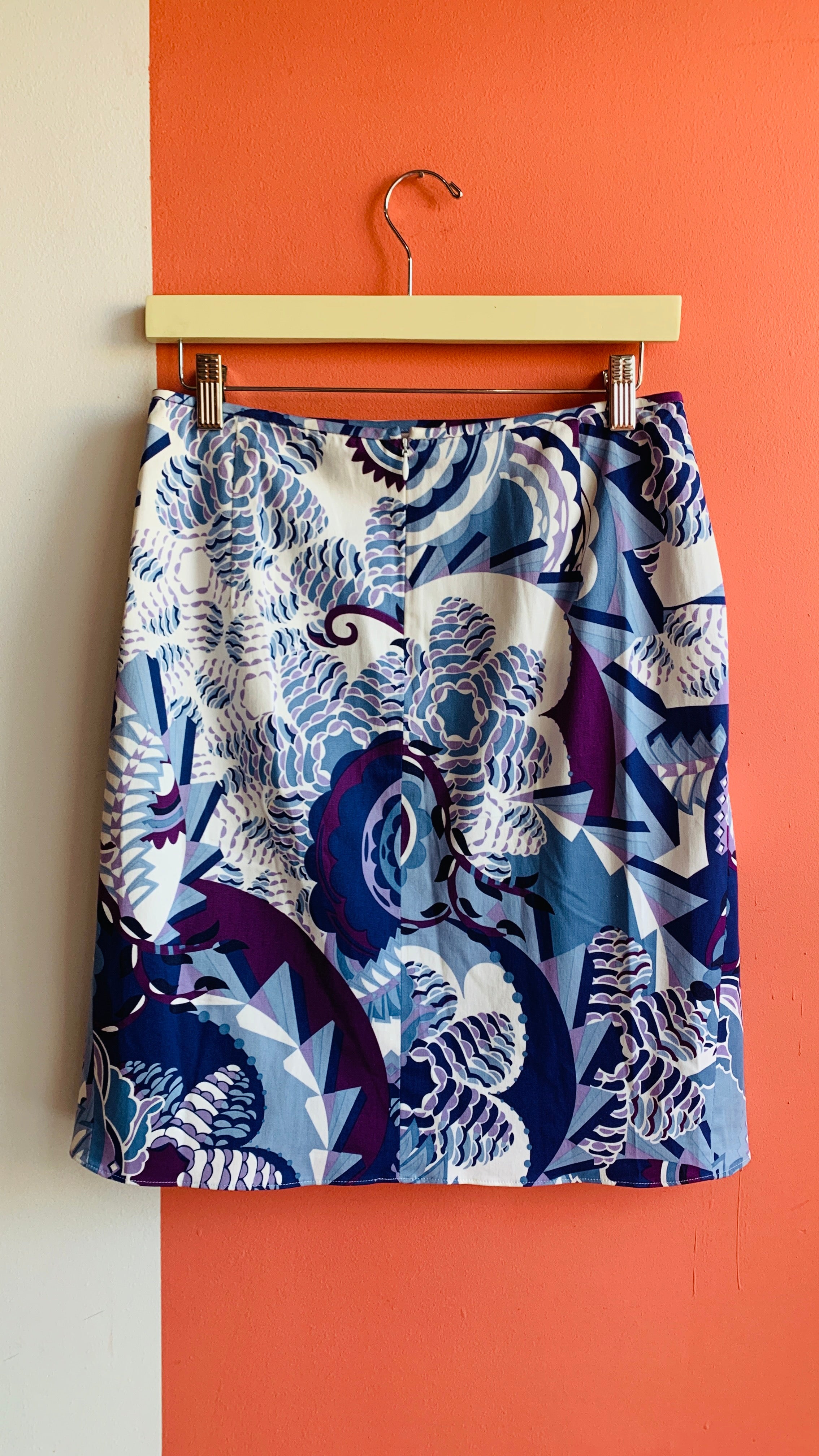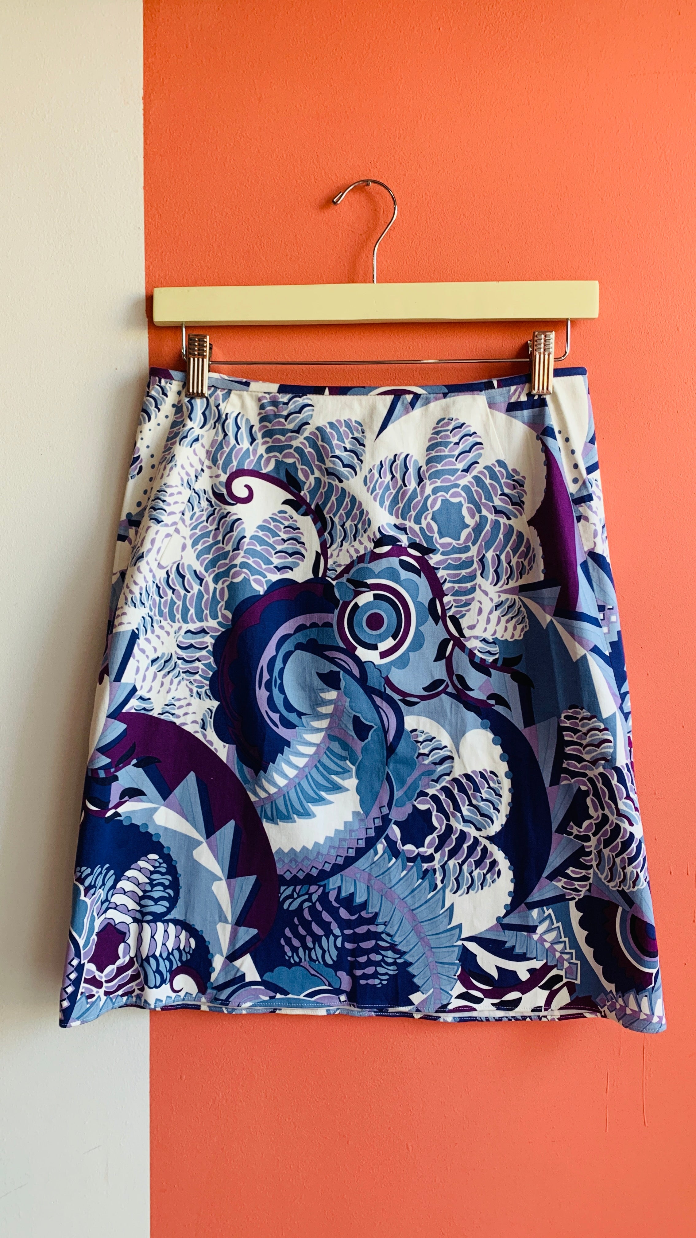 Y2K white and blue graphic swirl patterned skirt, sz M