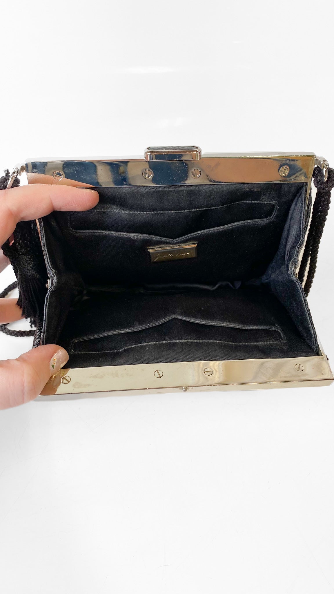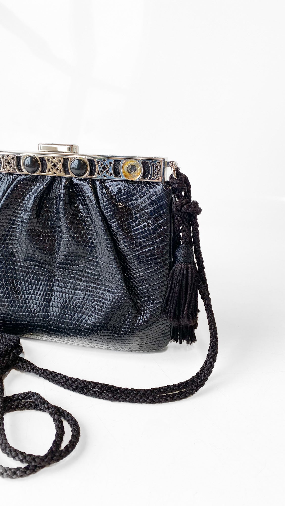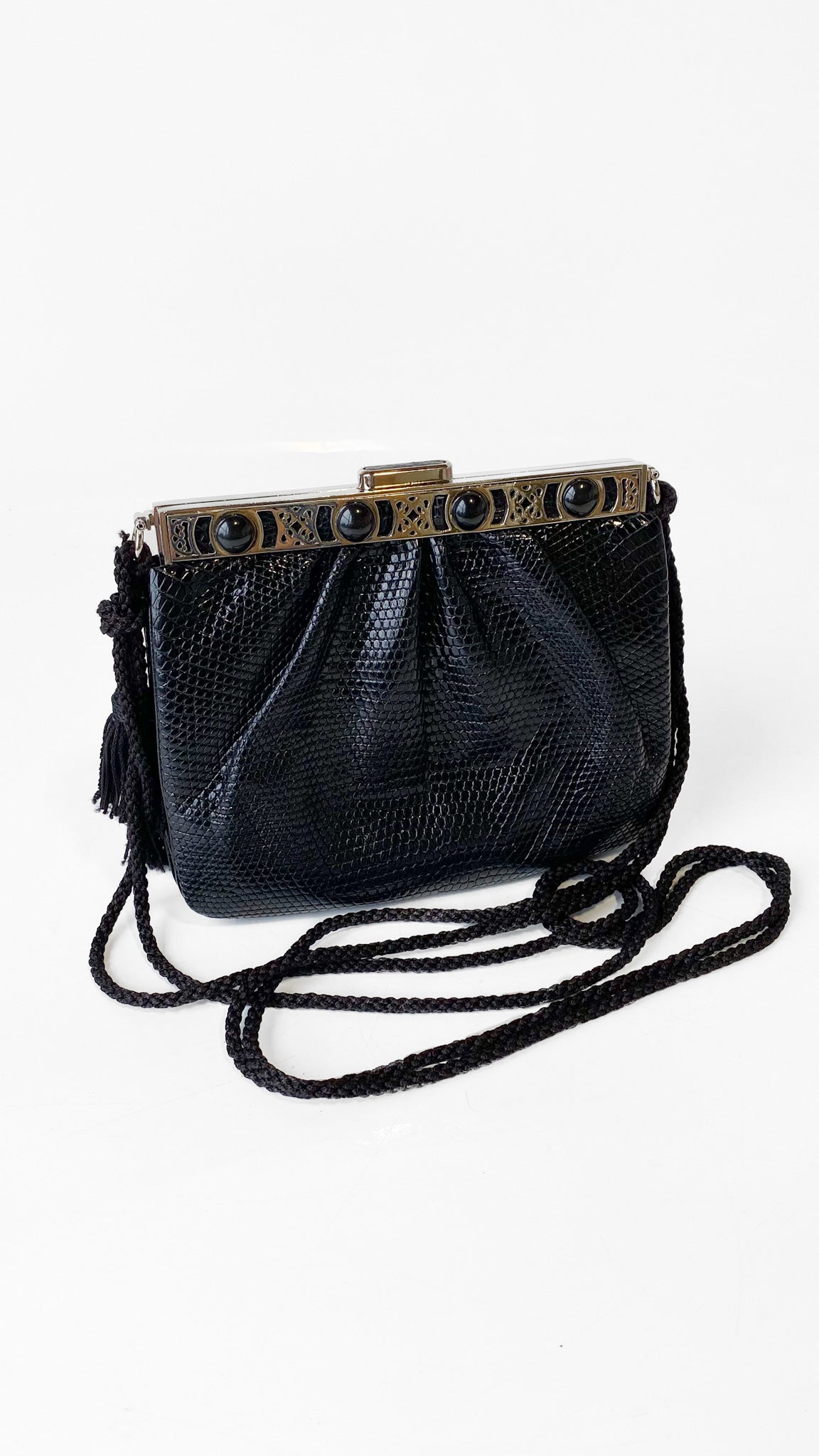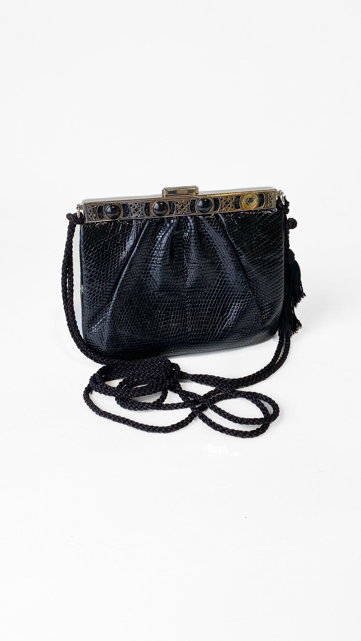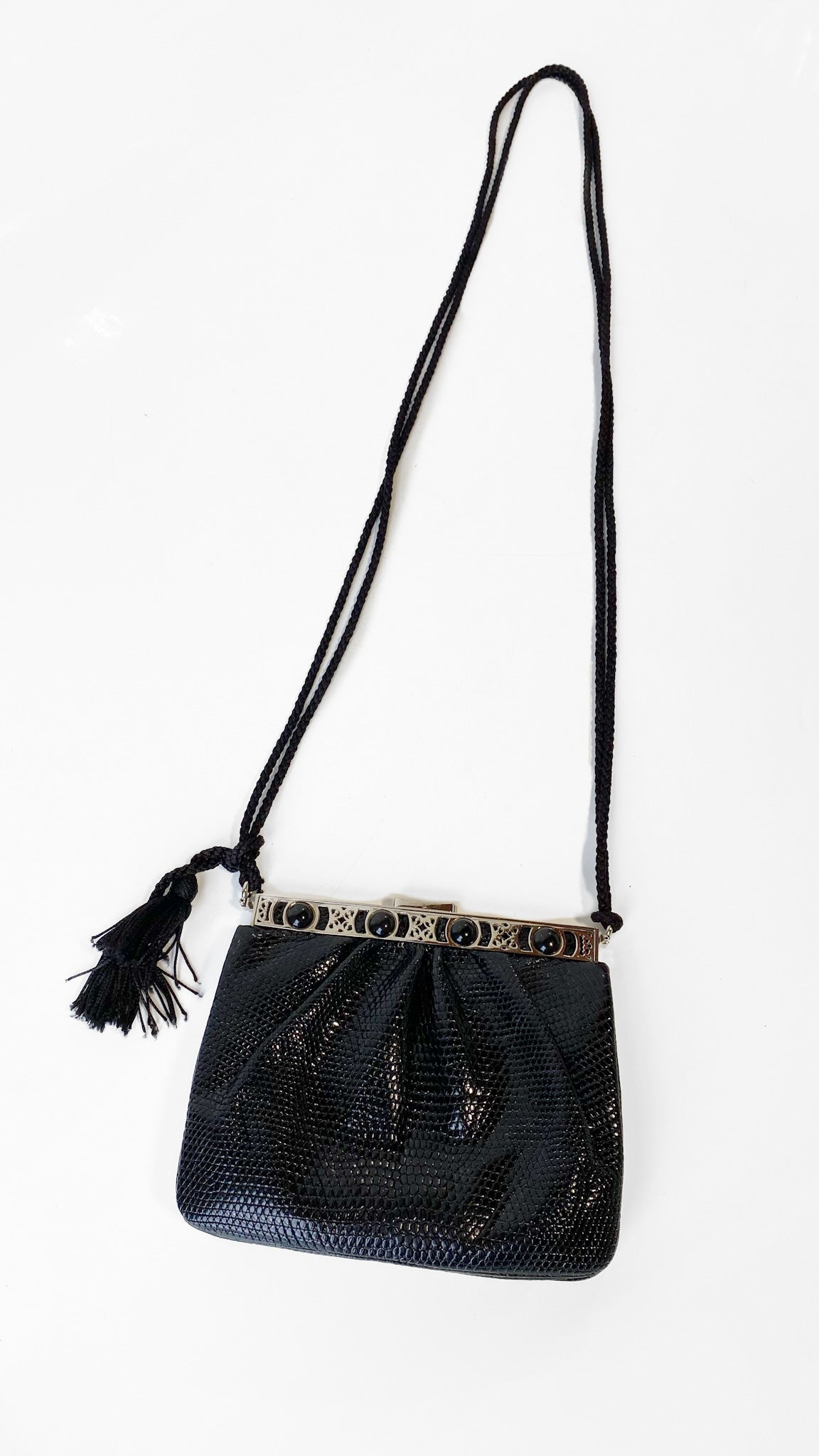 1980s Judith Leiber Black Leather Square Tassel Purse
