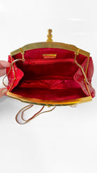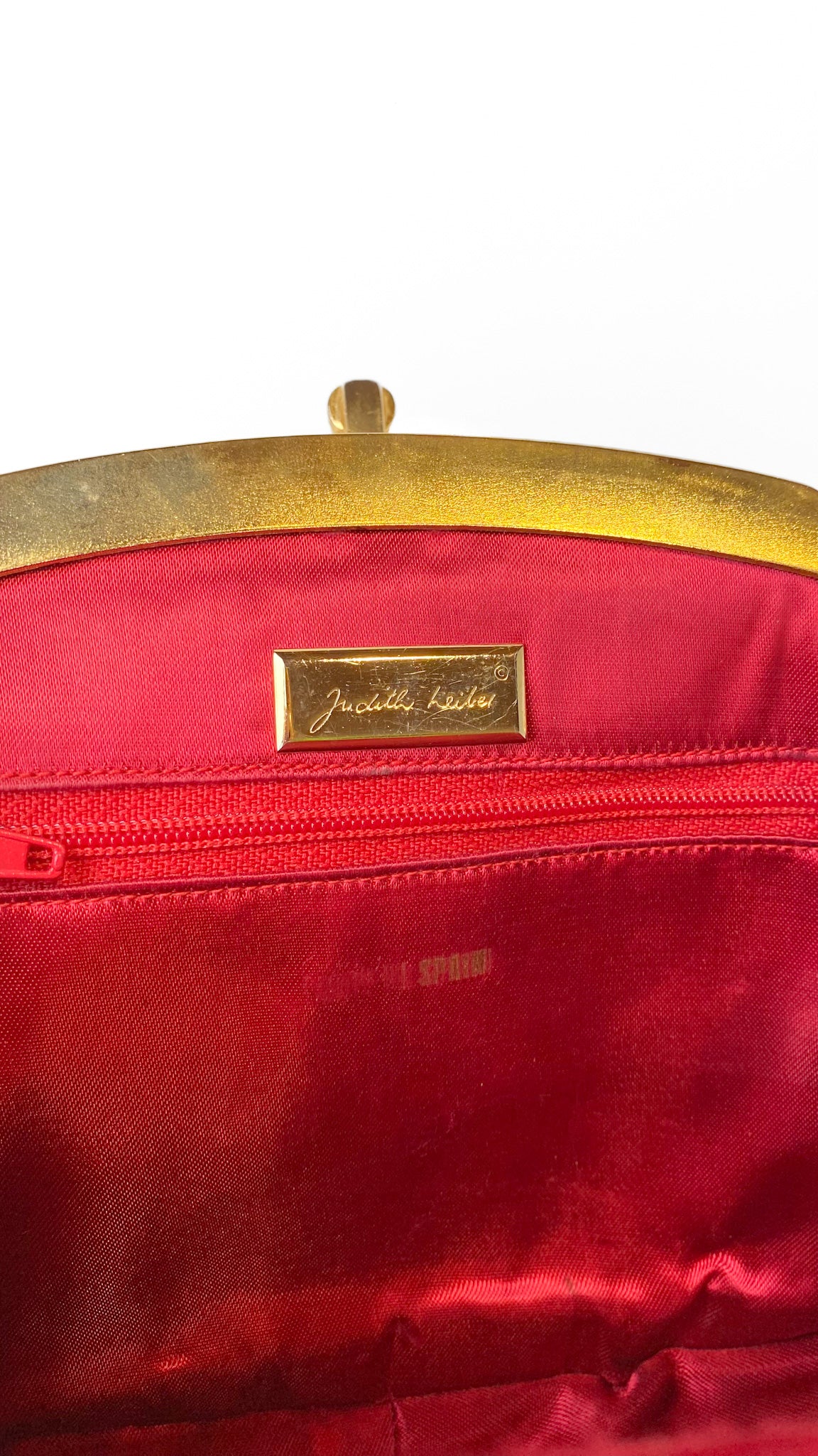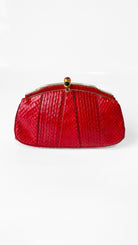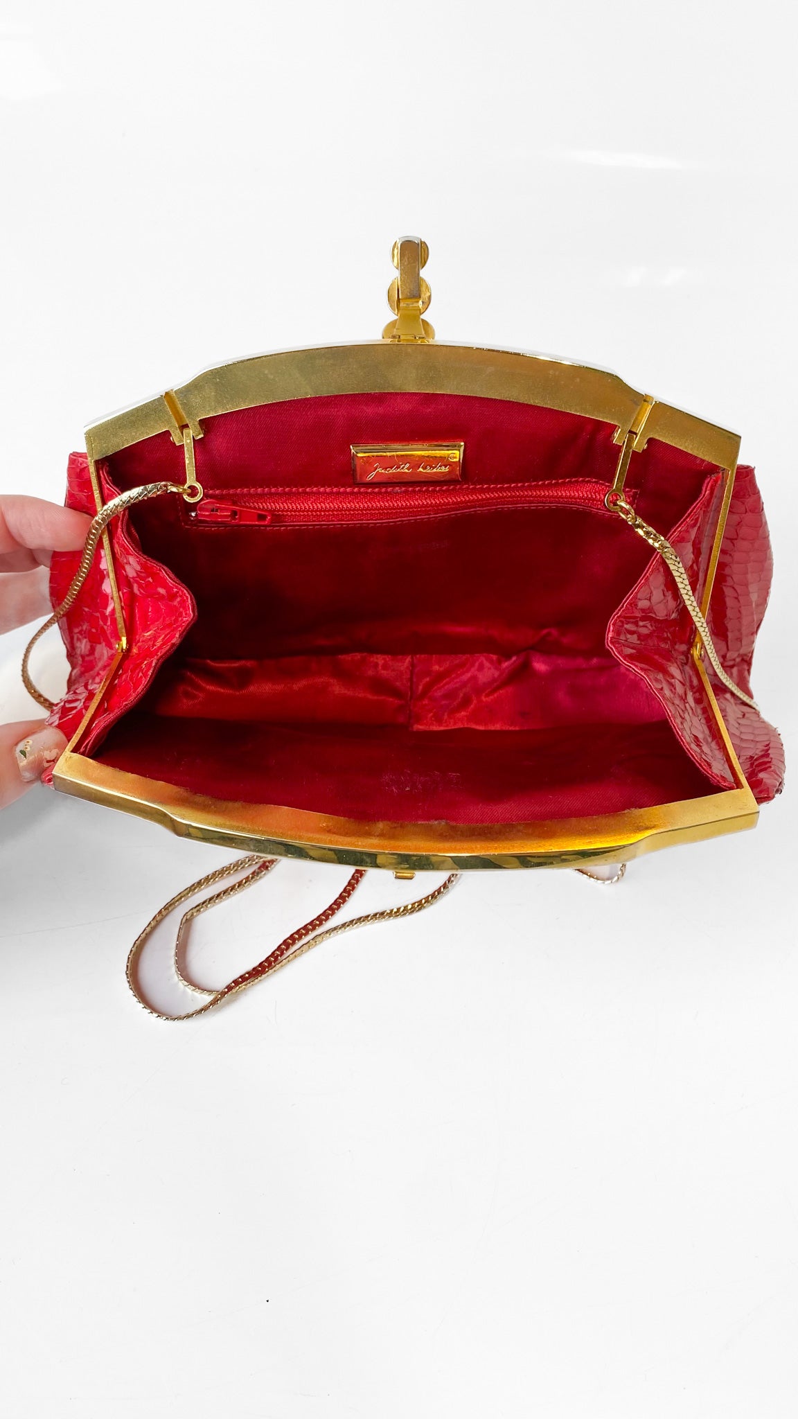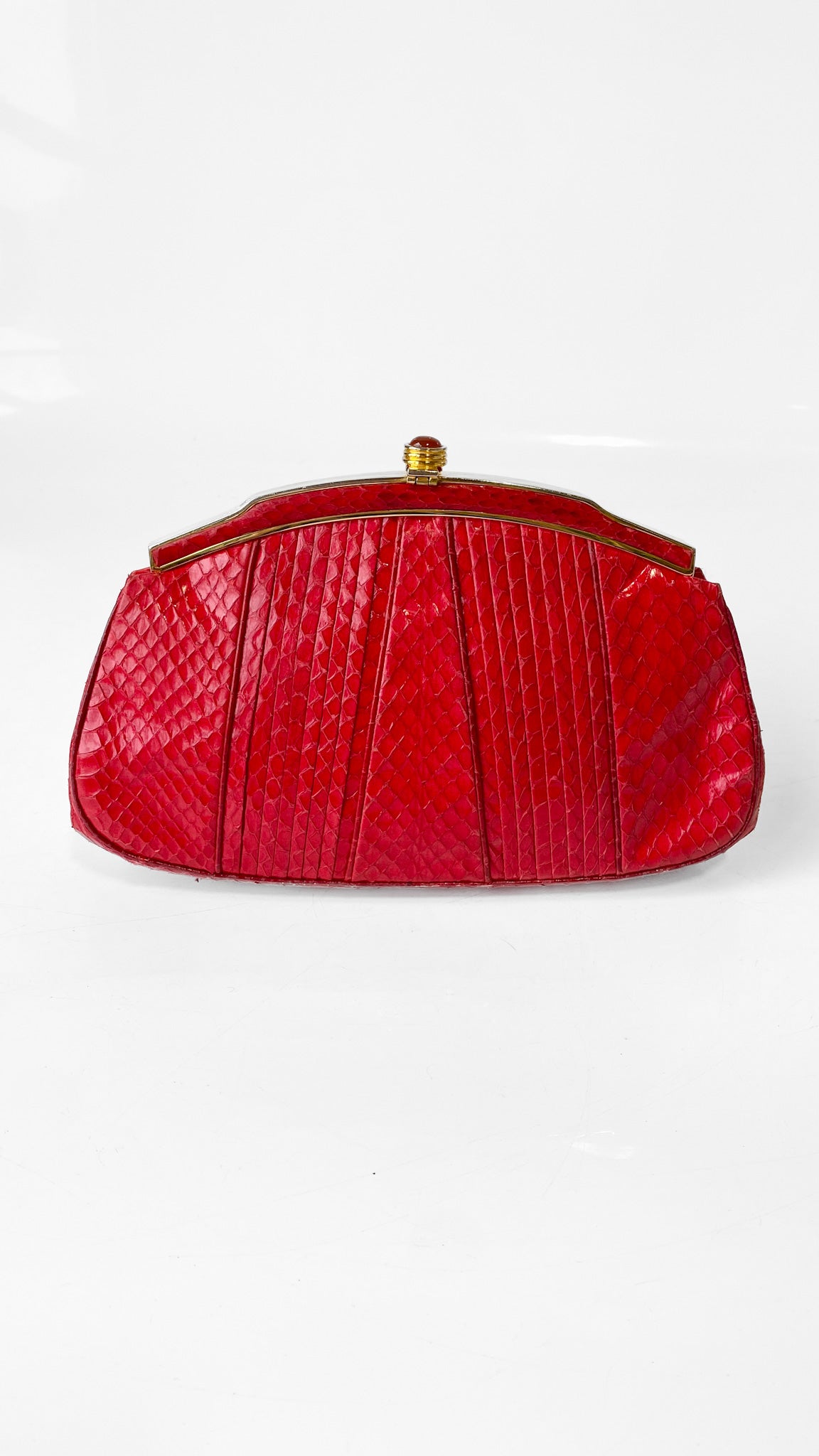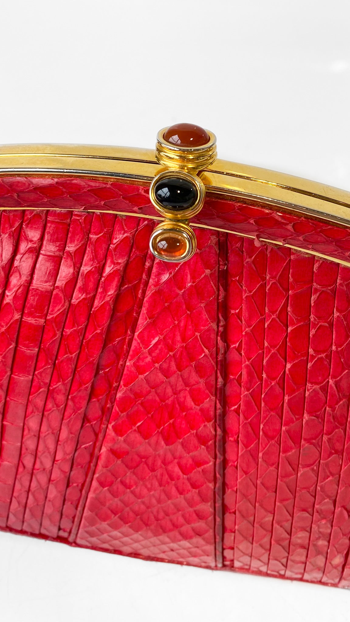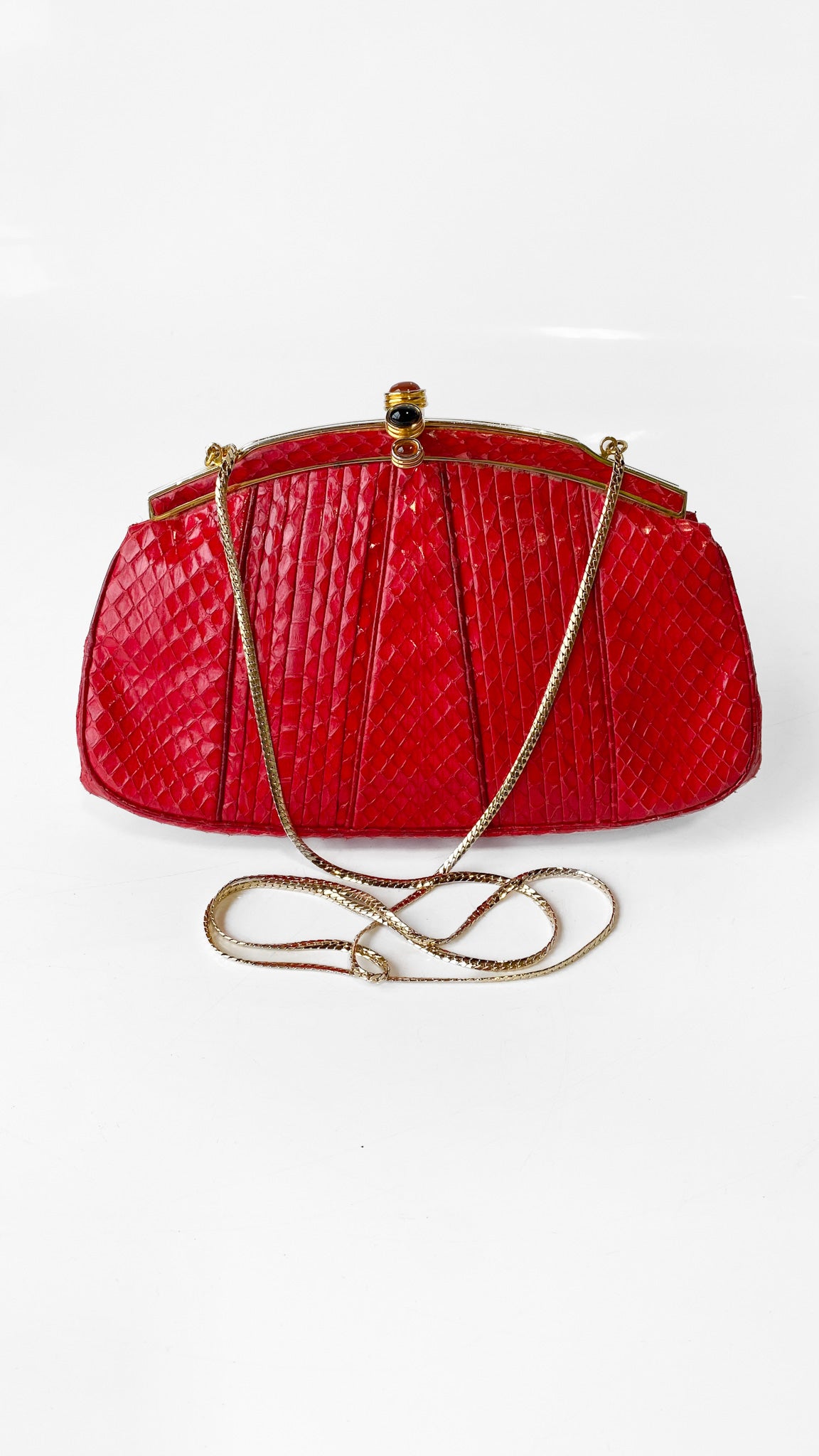 Red reptile leather clutch with vertical pleats down front and back. Three stone metal clasp. Interior is lined in matching red fabric, one interior zipper pocket, gold chain.