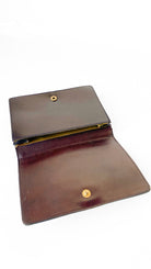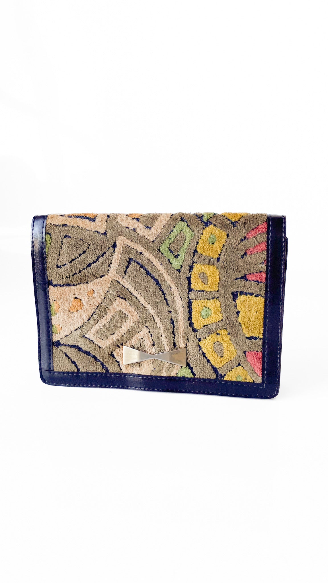 Description: Brown tone geometric tapestry clutch with brown vinyl trim & brass hardware. Has flap closure & snap clasp. Interior is lined, with flap pocket. Exterior has embedded metal bowtie on center.
