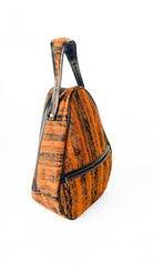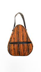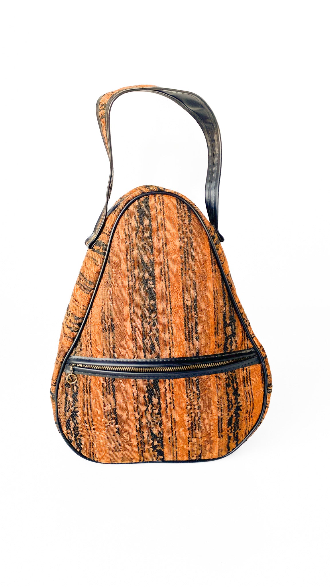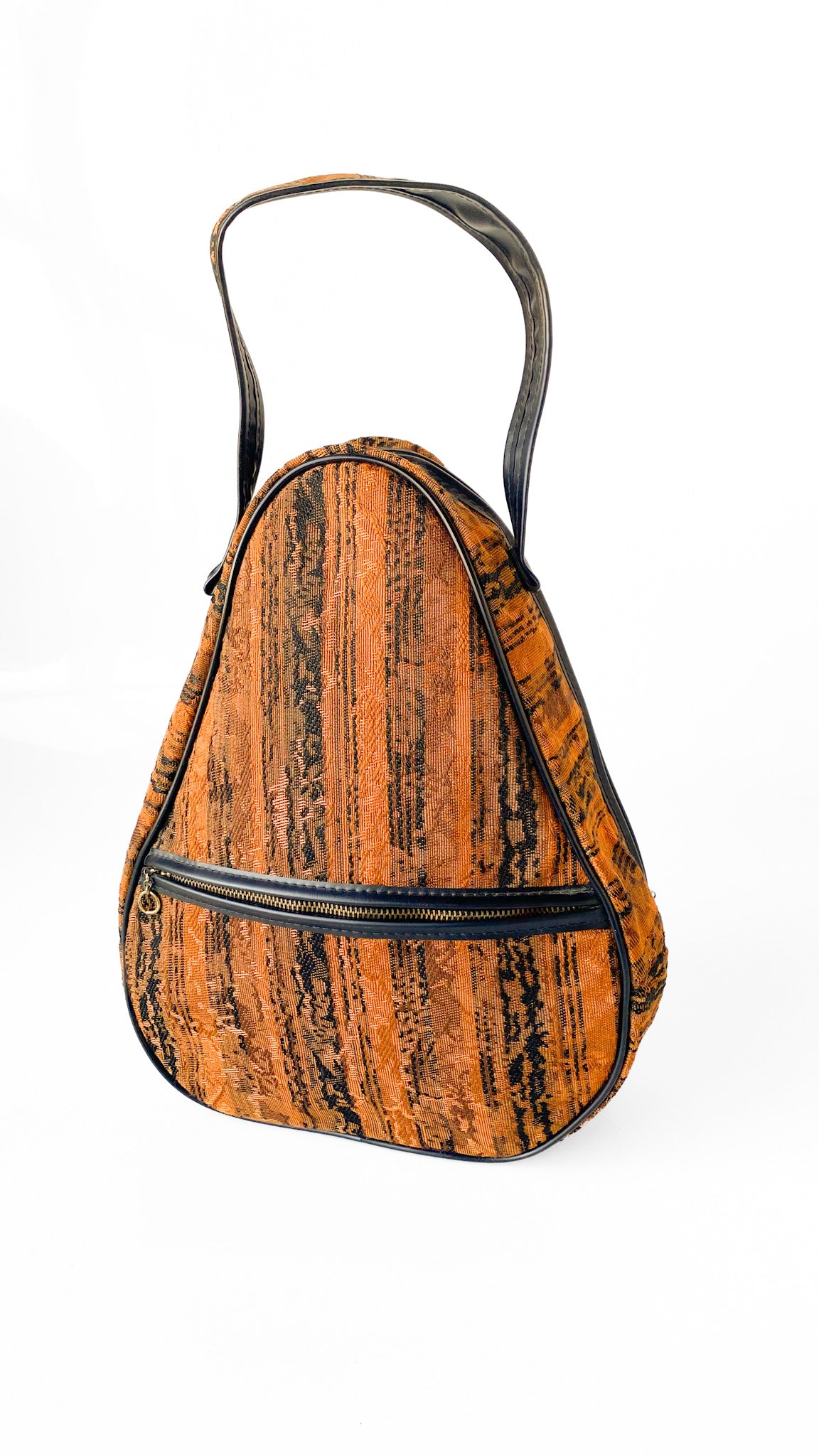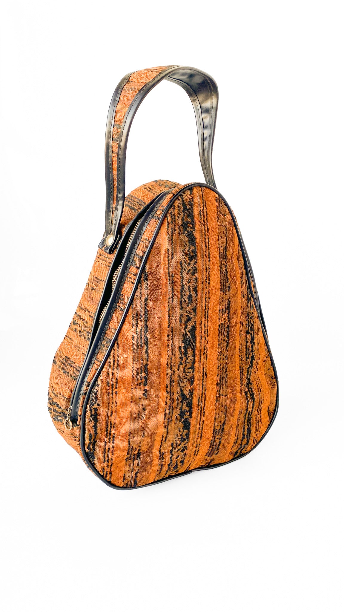 Description: Orange tapestry printed shoe bag in abstract triangular shape. Has handle strap & zipper closure to the main compartment. There is a smaller exterior zippered pocket on the front. Interior is lined in waterproof material.