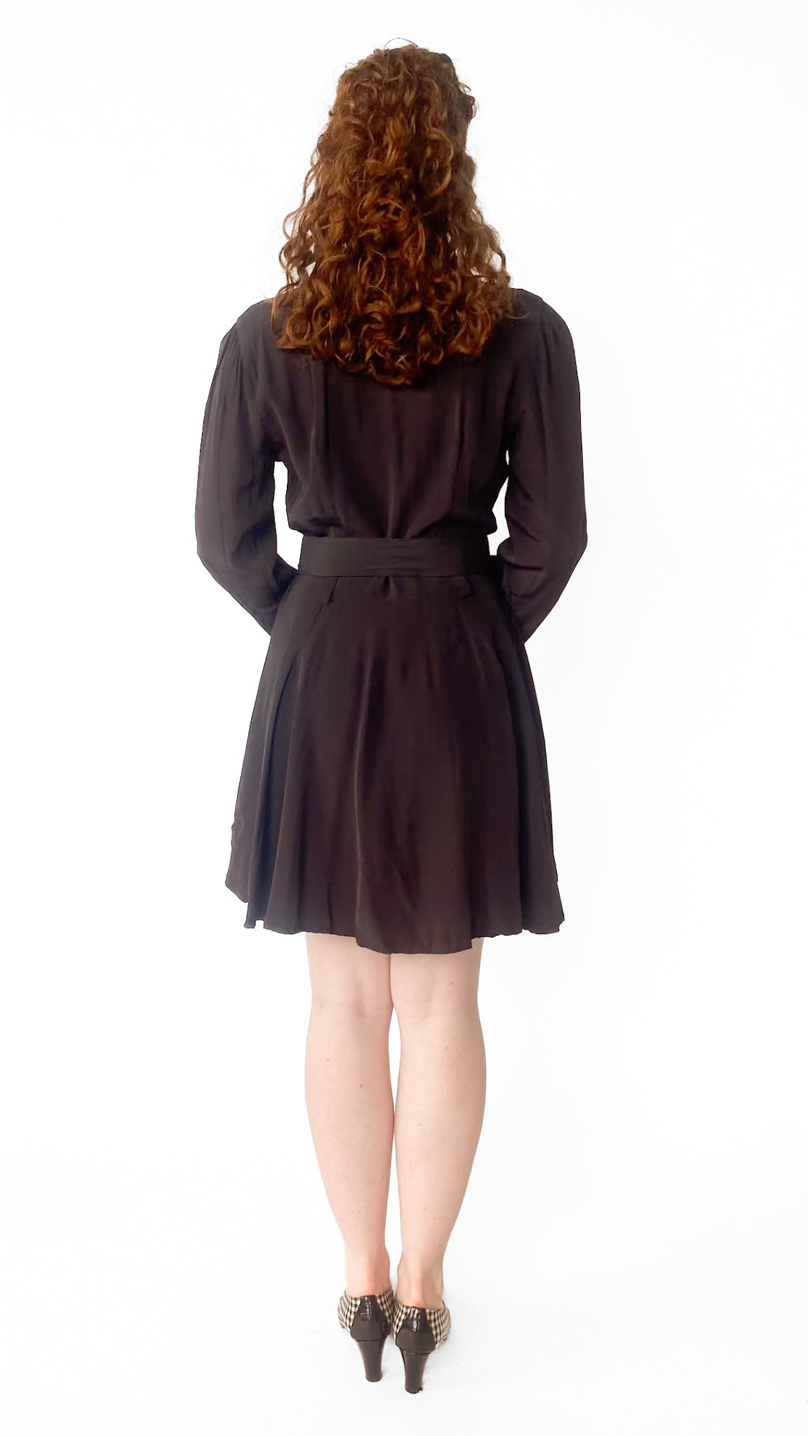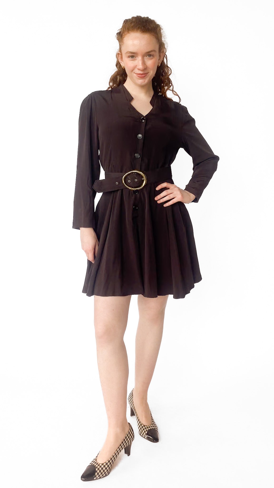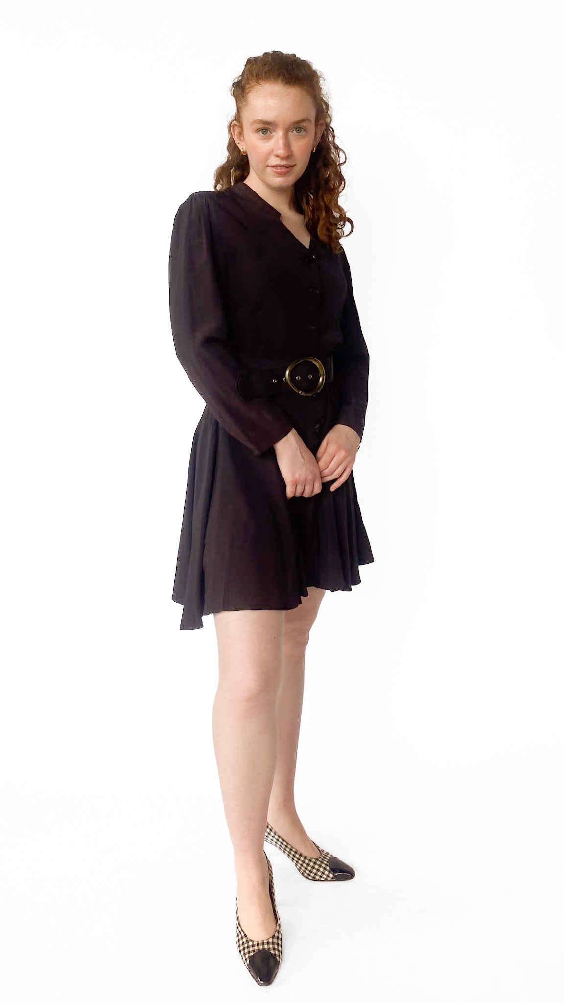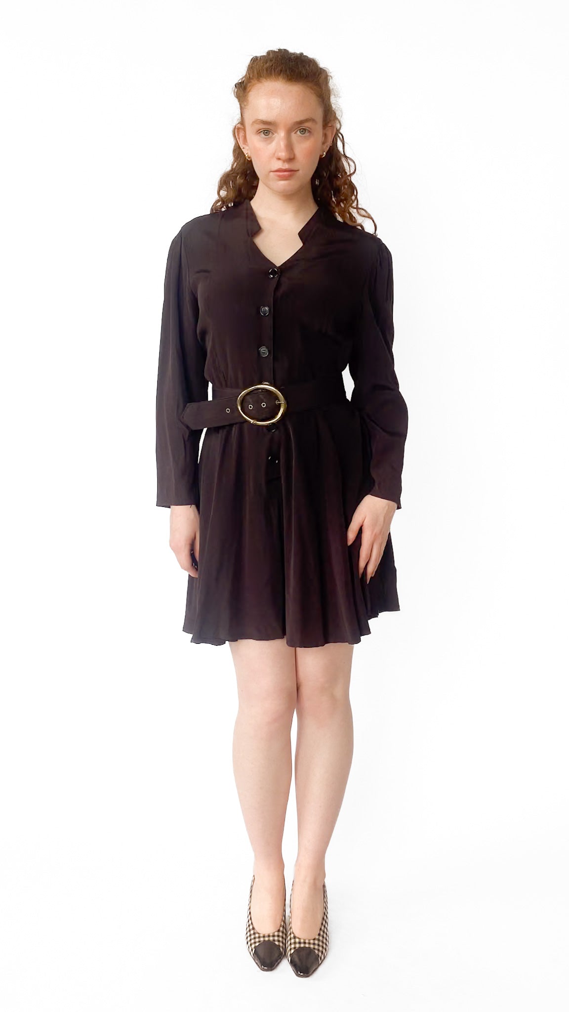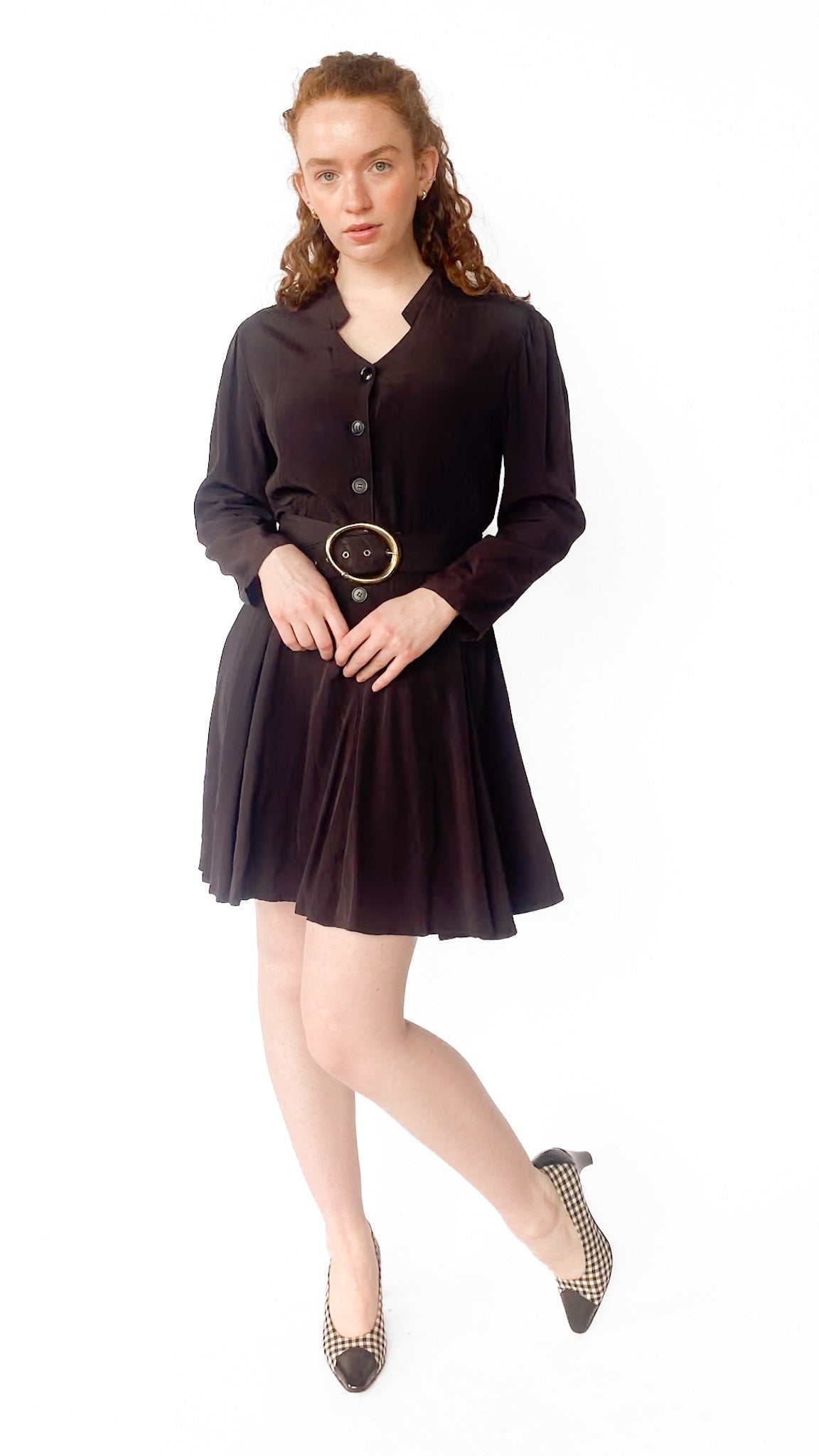 Description: Long sleeve back midi dress with chunky black belt with gold clasp. Dress buttons down the front. Collar is a diamond shape.